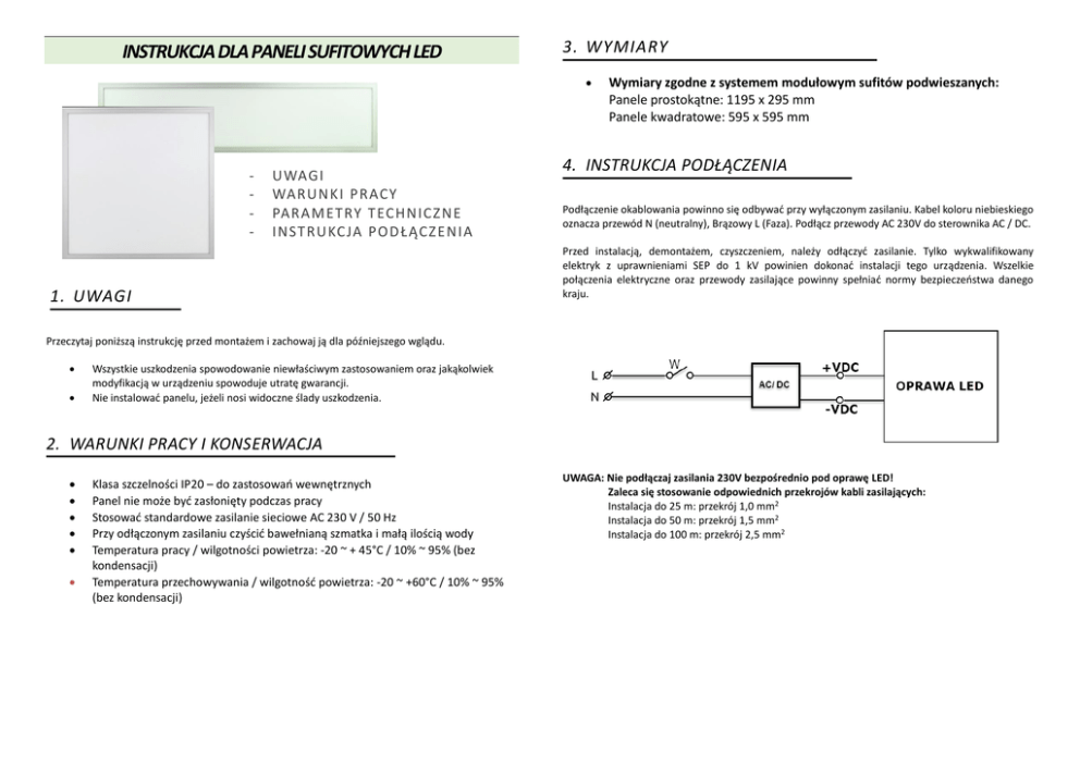 INSTRUKCJA DLA PANELI SUFITOWYCH LED 3. WYMIARY - UWAGI WARUN KI P RACY PARAM ET RY T ECHN ICZ N E IN ST RUKC JA P OD ŁĄCZ E N IA 1. UWAGI Wymiary zgodne z systemem modułowym sufitów podwieszanych: Panele prostokątne: 1195 x 295 mm Panele kwadratowe: 595 x 595 mm 4. INSTRUKCJA PODŁĄCZENIA Podłączenie okablowania powinno się odbywać przy wyłączonym zasilaniu. Kabel koloru niebieskiego oznacza przewód N (neutralny), Brązowy L (Faza). Podłącz przewody AC 230V do sterownika AC / DC. Przed instalacją, demontażem, czyszczeniem, należy odłączyć zasilanie. Tylko wykwalifikowany elektryk z uprawnieniami SEP do 1 kV powinien dokonać instalacji tego urządzenia. Wszelkie połączenia elektryczne oraz przewody zasilające powinny spełniać normy bezpieczeństwa danego kraju. Przeczytaj poniższą instrukcję przed montażem i zachowaj ją dla późniejszego wglądu. Wszystkie uszkodzenia spowodowanie niewłaściwym zastosowaniem oraz jakąkolwiek modyfikacją w urządzeniu spowoduje utratę gwarancji. Nie instalować panelu, jeżeli nosi widoczne ślady uszkodzenia. 2. WARUNKI PRACY I KONSERWACJA Klasa szczelności IP20 – do zastosowań wewnętrznych Panel nie może być zasłonięty podczas pracy Stosować standardowe zasilanie sieciowe AC 230 V / 50 Hz Przy odłączonym zasilaniu czyścić bawełnianą szmatka i małą ilością wody Temperatura pracy / wilgotności powietrza: -20 ~ + 45°C / 10% ~ 95% (bez kondensacji) Temperatura przechowywania / wilgotność powietrza: -20 ~ +60°C / 10% ~ 95% (bez kondensacji) UWAGA: Nie podłączaj zasilania 230V bezpośrednio pod oprawę LED! Zaleca się stosowanie odpowiednich przekrojów kabli zasilających: Instalacja do 25 m: przekrój 1,0 mm2 Instalacja do 50 m: przekrój 1,5 mm2 Instalacja do 100 m: przekrój 2,5 mm2 B) Montaż na sprężynach rozporowych 5. INSTALACJA 1. Zainstaluj 4 sprężyny rozporowe do ramy panelu za pomocą śrubokręta A) Montaż w suficie podwieszanym Zdejmij kaseton 2. Odchyl rozpory do góry, przyłóż panel w przygotowane miejsce i zwolnij sprężyny. Podłącz zasilanie C) Montaż panelu w aluminiowej ramie (opcjonalnie) Połącz ze sobą 3 ramiona przy pomocy plastikowych narożników połączeniowych Wstaw panel LED w stelaż Wsuń panel świetlny do ramy i upewnij się czy jest dobrze wpasowany Wyrównaj panel w stelażu i włącz zasilanie D) Montaż na linkach stalowych (opcjonalnie) Dostaw ostatnie aluminiowe ramie i przykręć śrubkami