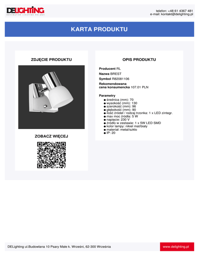 telefon: +48 61 4367 481 e-mail: [email protected] KARTA PRODUKTU ZDJĘCIE PRODUKTU OPIS PRODUKTU Producent RL Nazwa BREST Symbol R82081106 Rekomendowana cena konsumencka 107.01 PLN ZOBACZ WIĘCEJ Parametry ● średnica (mm): 70 ● wysokość (mm): 130 ● szerokość (mm): 96 ● głębokość (mm): 90 ● ilość źródeł / rodzaj trzonka: 1 x LED zintegr. ● max moc źródła: 5 W ● napięcie: 230 V ● źródło w zestawie: 1 x 5W LED SMD ● kolor lampy: nikiel mat/biały ● materiał: metal/szkło ● IP: 20 DELighting ul.Budowlana 10 Psary Małe k. Wrześni, 62-300 Września www.delighting.pl