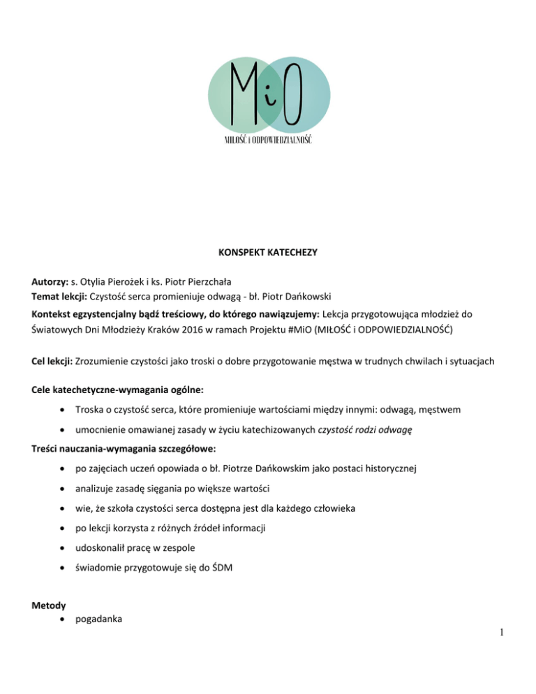 KONSPEKT KATECHEZY Autorzy: s. Otylia Pierożek i ks. Piotr Pierzchała Temat lekcji: Czystość serca promieniuje odwagą - bł. Piotr Dańkowski Kontekst egzystencjalny bądź treściowy, do którego nawiązujemy: Lekcja przygotowująca młodzież do Światowych Dni Młodzieży Kraków 2016 w ramach Projektu #MiO (MIŁOŚĆ i ODPOWIEDZIALNOŚĆ) Cel lekcji: Zrozumienie czystości jako troski o dobre przygotowanie męstwa w trudnych chwilach i sytuacjach Cele katechetyczne-wymagania ogólne: Troska o czystość serca, które promieniuje wartościami między innymi: odwagą, męstwem umocnienie omawianej zasady w życiu katechizowanych czystość rodzi odwagę Treści nauczania-wymagania szczegółowe: po zajęciach uczeń opowiada o bł. Piotrze Dańkowskim jako postaci historycznej analizuje zasadę sięgania po większe wartości wie, że szkoła czystości serca dostępna jest dla każdego człowieka po lekcji korzysta z różnych źródeł informacji udoskonalił pracę w zespole świadomie przygotowuje się do ŚDM Metody pogadanka 1 obejrzenie filmu lub prezentacji multimedialnej praca z tekstem rozmowa kierowana Formy pracy uczniów praca na forum klasy praca w grupach Środki i pomoce dydaktyczne: Rozważanie Ks. Edwarda Stańka, Czystość serca promieniuje odwagą, Bł. Piotr Dańkowski (19081942) NASZ DZIENNIK Literatura: św. Jan Paweł II ks. Piotr Pawlukiewicz ks. Pawlukiewicz, O samotności i odwadze Ks. Edward Staniek, Czystość serca promieniuje odwagą, Bł. Piotr Dańkowski (1908-1942) NASZ DZIENNIK Zeszyt ucznia: Tekst z podsumowania lekcji przez nauczyciela. 2 Przebieg zajęć Powitanie i czynności organizacyjne Treści i zadania metodyczno-dydaktyczne Nauczyciel sprawdza listę obecności i wprowadza do modlitwy. Intencja modlitwy: Módlmy się, abyśmy za przykładem bł. Piotra Dańkowskiego starali się o czystość naszych serc. Módlmy się słowami: 3 razy Zdrowaś Mario. Pomoce dydaktyczne Czas 5 min. Módlmy się: Boże, Ty przez Niepokalane Poczęcie Najświętszej Dziewicy przygotowałeś swojemu Synowi godne mieszkanie i na mocy zasług przewidzianej śmierci Chrystusa zachowałeś Ją od wszelkiej zmazy, daj nam za Jej przyczyną dojść do Ciebie bez grzechu. Przez Chrystusa Twojego Syna, Pana naszego. Amen. Odwaga a czystość W Onecie można przeczytać taki oto wpis: Moim zdaniem odwaga jest bardzo pozytywną cechą. Kojarzy się ona nam z bajkowymi bohaterami, którzy dokonują wielkich czynów. Jednak odwaga może się przejawiać w małych czynach. Niektórzy sądzą, że jeśli ktoś zrobi coś niedozwolonego, to jest odważny. Ale to przyznanie się do popełnionego złego uczynku, to jest odwaga. Trzeba umieć przyznać się do błędu i ponieść konsekwencje z pokorą. Niestety coraz mniej jest takich ludzi. Niektórzy boją się ciemności, pająków i wielu innych 10 min. 3 rzeczy, ale jeśli w poważnej sytuacji zachowają „zimną krew”, to mogą wykazać się wielką odwagą. http://zapytaj.onet.pl/ Zastanówmy się, czym jest odwaga. Spróbujmy zebrać skojarzenia związane z odwagą: • Brak strachu • Panowanie nad strachem • Pokonywanie bojaźni, strachu, lęku Uczniowie wypisują na tablicy skojarzenia związane z odwagą. Po tym zastanawiają się, jak można stać się odważnym. Gdzie jest źródło odwagi? Odważny to jaki…? Proszę teraz zastanowić się nad bohaterami literackimi czy historycznymi z II wojny światowej. Którego z nich możemy nazwać odważnym. Wymień cechy człowieka odważnego, uzasadnij, dlaczego jest on odważny. Jednym z takich bohaterów II wojny światowej był ks. Piotr Dańkowski. Był człowiekiem odważnym. Zastanowimy się, dlaczego możemy nadać mu taki tytuł? 5 min. Definicja odwagi Uczniowie prezentują wyniki swojej pracy a następnie nauczyciel podsumowuje prezentację grup. 2 min. Podsumowanie: odwagę rodzi czystość serca Spójrzmy jak bł. Piotr Dańkowski zdobył odwagę. Jaka inna wartość zrodziła w nim postawę odwagi – heroizmu w chwilach krytycznych. Zapoznajmy się z tekstem. Pracujemy w parach. Czytamy tekst i odpowiadamy na 2 Zał. 1,2, 20 min. Jako notatka do zeszytu może posłużyć tekst, z podsumowania 4 pytania: lekcji przez Dlaczego ks. Piotra Dańkowskiego nauczyciela możemy nazwać odważnym? 2. Skąd ks. Piotr brał siły do bycia odważnym? Nauczyciel włącza nagrany tekst wklejony poniżej z referatu ks. prof. Edwarda Stańka lub czyta sam (Można też zadać połowie klasy do opracowania zał. 1, a drugiej połowie - zał. 2) Czystość jest sprawdzana i doskonalona na krzyżowej drodze. Bóg się zgadza na takie doświadczenia. Jest to widoczne, jak zgodził się na nie, gdy Jego Syn przeżywał swój Wielki Piątek. Jezus udowodnił, że na tak trudnej drodze czystość miłości Boga objawia się wyjątkowo jasno. Ks. Piotr to wiedział i przeżywał z Jezusem Wielki Tydzień, dźwigając własny krzyż i doskonaląc swą miłość do oprawców. Czystość serc przez zjednoczenie z Bogiem, w akcie miłości, jest źródłem wielkiej odwagi i mocy. Potrafi przyjąć każde uderzenie nawet tak bolesne, jak Jezusa w czasie biczowania i krzyżowania. Ta miłość obejmuje zawsze oprawców, czyli jest objawieniem miłości nieprzyjaciół, o której mówi Jezus. On przy krzyżowaniu mówił: „Ojcze, odpuść im, bo nie wiedzą co czynią”. Bł. Piotr nigdy nie był tak blisko Jezusa, jak w ostatnich pięciu dniach swego życia. 5 W spotkaniu z nim można odkryć wymiary czystości, o których się rzadko mówi, a są nimi: moc, odwaga i miłość wrogów. Ta miłość potrafi prosić Ojca Niebieskiego o ich zbawienie, bo wie, że mordowane jest tysiące razy większym złem, niż cierpienie i śmierć z ich ręki. Oni odbierają życie doczesne, a tracą wieczne. Czystość serca to wielka wartość dla tego świata nieznana, a możliwa i bardzo ceniona dla tego, kto kocha Boga i chce Go oglądać. Dostrzega Go w Jezusie nawet w największym c