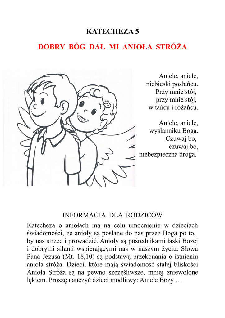 KATECHEZA 5 DOBRY BÓG DAŁ MI ANIOŁA STRÓŻA Aniele, aniele, niebieski posłańcu. Przy mnie stój, przy mnie stój, w tańcu i różańcu. Aniele, aniele, wysłanniku Boga. Czuwaj bo, czuwaj bo, niebezpieczna droga. INFORMACJA DLA RODZICÓW Katecheza o aniołach ma na celu umocnienie w dzieciach świadomości, że anioły są posłane do nas przez Boga po to, by nas strzec i prowadzić. Anioły są pośrednikami łaski Bożej i dobrymi siłami wspierającymi nas w naszym życiu. Słowa Pana Jezusa (Mt. 18,10) są podstawą przekonania o istnieniu anioła stróża. Dzieci, które mają świadomość stałej bliskości Anioła Stróża są na pewno szczęśliwsze, mniej zniewolone lękiem. Proszę nauczyć dzieci modlitwy: Aniele Boży …