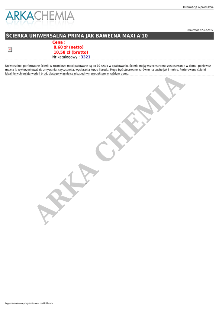 Informacje o produkcie Utworzono 07-03-2017 ŚCIERKA UNIWERSALNA PRIMA JAK BAWEŁNA MAXI A'10 Cena : 8,60 zł (netto) 10,58 zł (brutto) Nr katalogowy : 3321 AR K A C H EM IA Uniwersalne, perforowane ścierki w rozmiarze maxi pakowane są po 10 sztuk w opakowaniu. Ścierki mają wszechstronne zastosowanie w domu, ponieważ można je wykorzystywać do zmywania, czyszczenia, wycierania kurzu i brudu. Mogą być stosowane zarówno na sucho jak i mokro. Perforowane ścierki idealnie wchłaniają wodę i brud, dlatego właśnie są niezbędnym produktem w każdym domu. Wygenerowano w programie www.oscGold.com