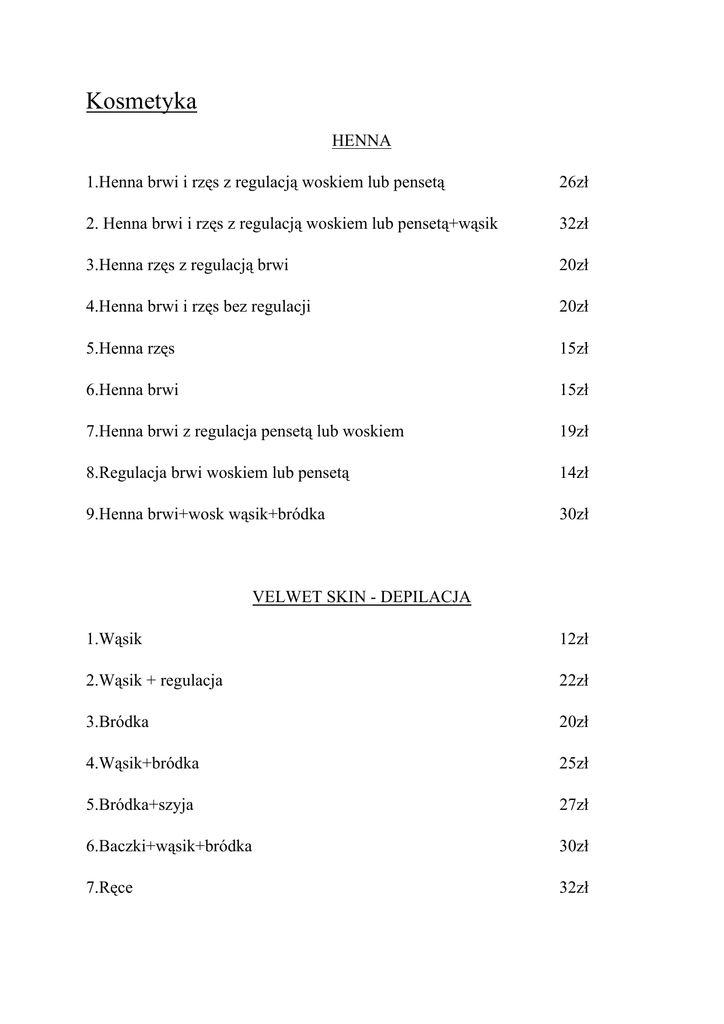 Kosmetyka HENNA 1.Henna brwi i rzęs z regulacją woskiem lub pensetą 26zł 2. Henna brwi i rzęs z regulacją woskiem lub pensetą+wąsik 32zł 3.Henna rzęs z regulacją brwi 20zł 4.Henna brwi i rzęs bez regulacji 20zł 5.Henna rzęs 15zł 6.Henna brwi 15zł 7.Henna brwi z regulacja pensetą lub woskiem 19zł 8.Regulacja brwi woskiem lub pensetą 14zł 9.Henna brwi+wosk wąsik+bródka 30zł VELWET SKIN - DEPILACJA 1.Wąsik 12zł 2.Wąsik + regulacja 22zł 3.Bródka 20zł 4.Wąsik+bródka 25zł 5.Bródka+szyja 27zł 6.Baczki+wąsik+bródka 30zł 7.Ręce 32zł 8.Pachy 20zł 9.Bikini 30-35zł 10.Łydki (z kolanami) 42zł 11.Całe nogi 65zł 12.Klatka piersiowa 30-55zł 13.Plecy 30-60zł 14.Brzuch 30-40zł 15.Okolice pępka 15zł MANICURE 1.Manicure tradycyjny 25zł 2.Manicue tradycyjny z malowaniem jednym kolorem 32zł 3. Manicue tradycyjny z malowaniem „frencz” 37zł PEDICURE 1.Pedicure z użyciem frezarki 65zł 2. Pedicure z użyciem frezarki i malowanie paznokci 1 kolorem 70zł 3. Pedicure z użyciem frezarki i malowanie „frencz” 75zł 4. Pedicure z użyciem frezarki i założenie masy „frencz” 5. Pedicure z użyciem frezarki i malowanie HYBRYDOWE 100-140zł 80zł MALOWANIE PAZNOKCI 1.Malowanie paznokci jednolitym kolorem 10zł 2.Malowanie paznokci „frencz” 15zł 3.Malowanie paznokci odżywką 10zł MALOWANIE HYBRYDOWE 1.Manicure z malowaniem hybrydowym 80zł 2.Malowanie hybrydowe na ręce 45zł 3.Zdjęcie poprzedniego koloru i malowanie ponowne dłoni 50zł 3.Zdjęcie hybrydy (ręce lub stopy) 15zł 4.Malowanie hybrydowe stóp 35zł 5. Zdjęcie poprzedniego koloru i malowanie ponowne na stopy 40zł PARAFINA 1.Parafina na dłonie i peeling 25zł 2.Parafina na dłonie z peelingiem i manicurem bez malowania 43zł TIPSY ALESSANDRO 1.Założenie 130zł 2.Masa francuska 18zł 3.Uzupełnienie 82zł 4.Reperacja 1 paznokiec (założenie) 15zł 5.Reperacja 1 paznokiec (uzupełninie) 13zł 6.Zdjęcie tipsów 24zł 7.Nabłyszczająca 27zł 8.Nabłyszczająca „frencz” 37zł 9.Nabłyszczająca (podwójna) z lakierem 42zł MASA NATURALNA ALESSANDRO 1.Założenie 115zł 2.Masa francuska 18zł 3.Uzupełnienie 82zł 4.Reperacja 1 paznokiec (założenie) 15zł 5.Reperacja 1 paznokiec (uzupełninie) 12zł 6.Nabłyszczająca 27zł 7.Nabłyszczająca „frencz” 37zł NAIL SLECTION 1.Założenie z masą „frencz” 85zł 2.Uzupełnienie (z masą „frencz”) 65zł 3.Reperacja 1 paznokiec (założenie) 10zł 4.Reperacja 1 paznokiec (uzupełninie) 8zł 5.Uzupełnienie z nabłyszczającą ALESSANDRO 73zł 6.Nabłyszczająca 20zł 7.Nabłyszczająca z masą „frencz” 25zł 8.Uzupełnianie z lakierem i 2 masy ALESSANDRO 85zł 9.Uzupełnienie z lakierem 80zł 10.Uzupełnie nie z HYBRYDĄ 80zł MASA NAIL SELECTION NA STOPY 1.Założenie masy na stopy z masą „frencz” 70zł 2.Uzupełnienie 55zł 3.Uzupełnienie z masą „Frencz” 60zł 4. Masa na stopy z nabłyszcającą ALESSANDRO 78zł 5.Nabłyszczająca z masą „frencz” ALESSANDRO (lub na odwrót) 30zł MASA NATURALNA ALESSANDRO NA STOPY 1.Założenie masy na stopy z masą „frencz” lub ozdobami 100zł 2.Uzupełnienie masy z masą „frencz” 87zł 3.Nabłyszcająca na stopy 27zł PIERCING 1.Język 150zł 2.Brew 90zł 3.Nos 70zł 4.Pępek 70zł 5.Warga 90zł KOLCZYKI 1.Uszy 40zł 2.Ucho 20zł 3.Nos 40zł MAKIJAŻ 1.Ślubny 90zł 2.Wieczorowy 80zł 3.Karnawałowy 80zł 4.Kępki do makijażu w całości (1kępka - 2zł) 15zł 5.Makijaż oka 40zł W naszym gabinecie kosmetycznym oferujemy zabiegi dobrane indywidualnie do potrzeb skóry. Każdy zabieg połączony jest z masażem twarzy, szyi i dekoltu. 1.Zabieg na twarz (bez ampułki) z maską kremową 60zł -z maską na szyję i dekolt 75zł 2.Zabieg na twarz do wyboru ampułka lub maska algowa 80zł -maska kremowa na szyje i dekolt 87zł -maska algowa na szyje i dekolt 95zł 3.Zabieg na twarz z ampułka i maską algową 90zł -maska algowa na szyję i dekolt 105zł 4.Zabieg na twarz z płatem kolagenowym 100zł -maska kremowa na dekolt 110zł -maska algowa na szyję i dekolt 125zł 5.Zabieg na twarz bez masażu (demakijaż, odpowiednio dobrany peeling) -z maską kremową 30zł -z maską algową 45zł 6.Oczyszczanie twarzy -z maską kremową 72zł -z maską algową 87zł 7.Oczyszczanie pleców 100-130zł 8.Mikrodermabrazja diamentowa na twarz lub dekolt -z maską kremową -z maską algową 90zł 100zł 9.Mikrodermabrazja diamentowa na twarz i dekolt -z maską kremową 140zł -z maską algową 150zł 10.Peeling kawitacyjny na twarz -z maską kremową 60zł -z maską algową 75zł +ampułka 20zł +jonoforeza na ampułce lub żelu 30zł 11.Zabieg na okolice oczu -serum + maska algowa + masaż okolicy oczu 40zł -maska z aktywnym kolagenem 40zł 12.Zabieg silnie regenerujący dłonie z maską algową 30zł Do każdego zabiegu istnieje możliwośc zastosowania dodatkowo ampułki na dekolt zgodnie z potrzebami skóry 13.PRZEDŁUŻANIE I ZAGĘSZCZANIE RZĘS 20zł 150zł