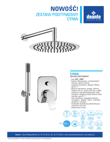 NOWOŚĆ! zestaw podtynkowy cynia cynia zestaw podtynkowy •kod: NAC_09BP; •bateria mieszaczowa: z przełącznikiem natrysku, głowica 35mm; •wylewka natryskowa: długość 325mm, gwint ½”; •głowica natryskowa: okrągła, stalowa, średnica 30 cm, system anti-clac, szybka reakcja na włączanie/wyłączanie wody; •mosiężne, okrągłe przyłącze kątowe węża natrysku, gwint ½”; •wąż natryskowy: podwójnie pleciony, rozciągliwy , długość 150cm, końcówki stożkowe z oringiem; •słuchawka natryskowa jednofunkcyjna z systemem anti-calc; •wykończenie chrom. Deante – Biuro Obsługi Klienta: tel.: 42 714 30 31, fax: 42 714 30 30, e-mail: [email protected], www.deante.pl *więcej szczegółów na temat warunków gwarancyjnych na www.deante.pl