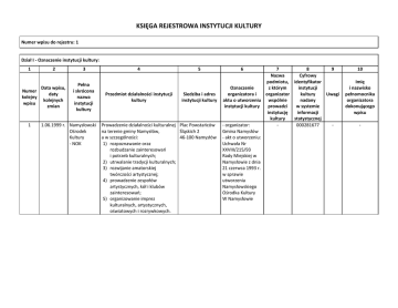 KSIĘGA REJESTROWA INSTYTUCJI KULTURY Numer wpisu do rejestru: 1 Dział I - Oznaczenie instytucji kultury: 1 2 Data wpisu, Numer daty kolejny kolejnych wpisu zmian 1 3 Pełna i skrócona nazwa instytucji kultury 1.06.1999 r. Namysłowski Ośrodek Kultury - NOK 4 Przedmiot działalności instytucji kultury 5 Siedziba i adres instytucji kultury Prowadzenie działalności kulturalnej Plac Powstańców na terenie gminy Namysłów, Śląskich 2 a w szczególności: 46-100 Namysłów 1) rozpoznawanie oraz rozbudzanie zainteresowań i potrzeb kulturalnych; 2) utrwalanie tradycji kulturalnych; 3) rozwijanie amatorskiej twórczości artystycznej; 4) prowadzenie zespołów artystycznych, kół i klubów zainteresowań; 5) organizowanie imprez kulturalnych, artystycznych, oświatowych i rozrywkowych. 6 7 8 9 Nazwa Cyfrowy podmiotu, identyfikator Oznaczenie z którym instytucji organizatora i organizator kultury Uwagi aktu o utworzeniu wspólnie nadany instytucji kultury prowadzi w systemie instytucję informacji kultury statystycznej - organizator: 000281677 Gmina Namysłów - akt o utworzeniu: Uchwała Nr XXVIII/215/93 Rady Miejskiej w Namysłowie z dnia 21 czerwca 1993 r. w sprawie utworzenia Namysłowskiego Ośrodka Kultury W Namysłowie 10 Imię i nazwisko pełnomocnika organizatora dokonującego wpisu - Dział II - Organizacja instytucji kultury: 1 2 3 Numer kolejny wpisu Data wpisu, daty kolejnych zmian Informacja o złożeniu do rejestru statutu 1 1.06.1999 r. 2 1) Uchwała Nr XXVIII/215/93 Rady Miejskiej w Namysłowie z dnia 21 czerwca 1993 r. w sprawie utworzenia Namysłowskiego Ośrodka Kultury w Namysłowie; 2) Uchwała Nr XVIII/275/2000 Rady Miejskiej w Namysłowie z dnia 6 czerwca 2000 r. w sprawie nadania Statutu Namysłowskiemu Ośrodkowi Kultury w Namysłowie z późn. zm. wprowadzoną Uchwałą Nr XI/97/03 Rady Miejskiej w Namysłowie z dnia 8 grudnia 2003 r. 28.02.2013 r. - 3 29.04.2013 r. - 4 6 7 8 Nazwa oraz Imiona i nazwiska siedziba pełnomocników wyodrębnionych Imię i nazwisko dyrektora instytucji kultury jednostek Imię i nazwisko instytucji kultury i jego uprawnionych do organizacyjnych pełnomocnika zastępców lub oznaczenie osoby dokonywania instytucji kultury Uwagi organizatora fizycznej lub prawnej, której czynności i ich cyfrowe dokonującego powierzono zarządzanie prawnych w identyfikatory wpisu instytucją kultury imieniu instytucji nadane oraz zakres ich w systemie upoważnień informacji statystycznej Adam Zając - dyrektor Biblioteka Uchwała Nr 184/117/96 Zarządu Publiczna w Gminy Namysłów z dnia Namysłowie 26 czerwca 1996 r. w sprawie powołania Dyrektora Namysłowskiego Ośrodka Kultury w Namysłowie Jacek Korzeń – powierzenie kierowania Namysłowskim Ośrodkiem Kultury Adam Zając – dyrektor Zarządzenie Nr 421/VI/13 Burmistrza Namysłowa z dnia 29 kwietnia 2013 r. w sprawie powołania Dyrektora Namysłowskiego Ośrodka Kultury w Namysłowie 5 - - - - - - - - Dział III - Mienie instytucji kultury: 1 2 3 Numer kolejny wpisu Data wpisu, daty kolejnych zmian Informacja o złożeniu do rejestru rocznego sprawozdania finansowego 1 2 3 4 5 6 7 8 9 10 11 12 13 14 15 30.03.2000 r. 31.03.2001 r. 31.03.2002 r. 27.03.2003 r. 27.03.2004 r. 22.03.2005 r. 10.03.2006 r. 21.02.2007 r. 6.03.2008 r. 10.03.2009 r. 23.03.2010 r. 17.03.2011 r. 2.03.2012 r. 5.04.2013 r. 11.07.2014 r. Bilans za 1999 r. Bilans za 2000 r. Bilans za 2001 r. Bilans za 2002 r. Bilans za 2003 r. Bilans za 2004 r. Bilans za 2005 r. Bilans za 2006 r. Bilans za 2007 r. Bilans za 2008 r. Bilans za 2009 r. Bilans za 2010 r. Bilans za 2011 r. Bilans za 2012 r. Bilans za 2013 r. 4 Informacja o obciążeniu środków trwałych instytucji kultury ograniczonymi prawami rzeczowymi - 5 6 Uwagi Imię i nazwisko pełnomocnika organizatora dokonującego wpisu - - Dział IV - Połączenie, podział i likwidacja instytucji kultury: 1 2 Numer kolejny wpisu Data wpisu, daty kolejnych zmian 3 Informacja o połączeniu, podziale lub likwidacji instytucji kultury 4 5 Imię i nazwisko likwidatora Uwagi 6 Imię i nazwisko pełnomocnika organizatora dokonującego wpisu