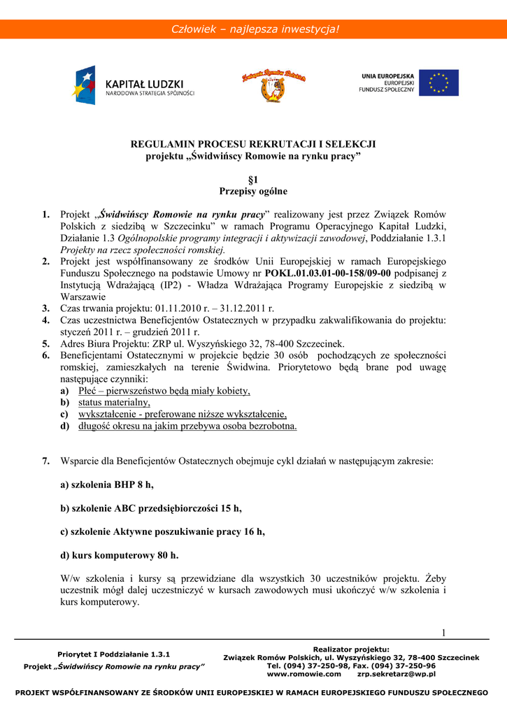 Człowiek – najlepsza inwestycja! REGULAMIN PROCESU REKRUTACJI I SELEKCJI projektu ,,Świdwińscy Romowie na rynku pracy” §1 Przepisy ogólne 1. 2. 3. 4. 5. 6. 7. Projekt ,,Świdwińscy Romowie na rynku pracy” realizowany jest przez Związek Romów Polskich z siedzibą w Szczecinku” w ramach Programu Operacyjnego Kapitał Ludzki, Działanie 1.3 Ogólnopolskie programy integracji i aktywizacji zawodowej, Poddziałanie 1.3.1 Projekty na rzecz społeczności romskiej. Projekt jest współfinansowany ze środków Unii Europejskiej w ramach Europejskiego Funduszu Społecznego na podstawie Umowy nr POKL.01.03.01-00-158/09-00 podpisanej z Instytucją Wdrażającą (IP2) - Władza Wdrażająca Programy Europejskie z siedzibą w Warszawie Czas trwania projektu: 01.11.2010 r. – 31.12.2011 r. Czas uczestnictwa Beneficjentów Ostatecznych w przypadku zakwalifikowania do projektu: styczeń 2011 r. – grudzień 2011 r. Adres Biura Projektu: ZRP ul. Wyszyńskiego 32, 78-400 Szczecinek. Beneficjentami Ostatecznymi w projekcie będzie 30 osób pochodzących ze społeczności romskiej, zamieszkałych na terenie Świdwina. Priorytetowo będą brane pod uwagę następujące czynniki: a) Płeć – pierwszeństwo będą miały kobiety, b) status materialny, c) wykształcenie - preferowane niższe wykształcenie, d) długość okresu na jakim przebywa osoba bezrobotna. Wsparcie dla Beneficjentów Ostatecznych obejmuje cykl działań w następującym zakresie: a) szkolenia BHP 8 h, b) szkolenie ABC przedsiębiorczości 15 h, c) szkolenie Aktywne poszukiwanie pracy 16 h, d) kurs komputerowy 80 h. W/w szkolenia i kursy są przewidziane dla wszystkich 30 uczestników projektu. Żeby uczestnik mógł dalej uczestniczyć w kursach zawodowych musi ukończyć w/w szkolenia i kurs komputerowy. 1 Priorytet I Poddziałanie 1.3.1 Projekt „Świdwińscy Romowie na rynku pracy” Realizator projektu: Związek Romów Polskich, ul. Wyszyńskiego 32, 78-400 Szczecinek Tel. (094) 37-250-98, Fax. (094) 37-250-96 www.romowie.com [email protected] PROJEKT WSPÓŁFINANSOWANY ZE ŚRODKÓW UNII EUROPEJSKIEJ W RAMACH EUROPEJSKIEGO FUNDUSZU SPOŁECZNEGO Człowiek – najlepsza inwestycja! Kursy zawodowe: Kurs na spawacza 140 h. Kurs na operatora wózków widłowych 67 h. Kurs na operatora żurawi przeładunkowych 36 h. Kurs wizażu i paznokcia. Kurs na kucharza. Kurs nowoczesny sprzedawca z obsługa kasy fiskalnej z fakturowaniem 50 h. Kurs krawiecki 150 h. Kurs gospodyni domowa 80 h. Kurs prawa jazdy KAT B dla najlepszych 18 kursantów. Staże zawodowe Staże zawodowe – dla 10 osób od sierpnia 2011 do listopada 2011 w wymiarze nie przekraczającym 40 godzin tygodniowo i 8 godzin dziennie. Staże zawodowe obejmą 10 Beneficjentów Ostatecznych, którzy zostaną wyłonieni na podstawie opinii trenerów/szkoleniowców, zespołu projektowego. Będą realizowane zgodnie z kierunkiem ukończonego szkolenia. 8. Użyte w regulaminie określenia oznaczają: a) Beneficjent – Związek Romów Polskich ul. Wyszyńskiego 32, 78-400 Szczecinek b) Biuro projektu – j/w c) Beneficjent Ostateczny – kandydat/ka, który/a spełnił/a wszystkie wymogi formalne określone we wniosku o dofinansowanie projektu oraz otrzymał/a pozytywną opinię kwalifikacyjną wydaną przez komisję rekrutacyjną. d) Deklaracja uczestnictwa w projekcie – dokument stanowiący wyrażenie zgody na udział w projekcie. e) Osoba bezrobotna - osoba w wieku produkcyjnym (kobiety w wieku 18-59 lat, mężczyźni w wieku 18-64 lat) pozostająca bez zatrudnienia zarejestrowana w Powiatowym Urzędzie Pracy. f) Osoba nieaktywna zawodowo - osoba pozostającą bez zatrudnienia (kobiety w wieku 1859 lat, mężczyźni w wieku 18-64 lat) niezatrudniona, niewykonująca innej pracy zarobkowej, zdolna i gotowa do podjęcia zatrudnienia lub innej pracy zarobkowej w co najmniej połowie wymiaru czasu pracy, która jednocześnie nie zalicza się do kategorii bezrobotni (nie jest zarejestrowana w PUP). g) Osoba niepełnosprawna - osoba powyżej 15 roku życia, posiadająca orzeczenie o stopniu niepełnosprawności. 2 Priorytet I Poddziałanie 1.3.1 Projekt „Świdwińscy Romowie na rynku pracy” Realizator projektu: Związek Romów Polskich, ul. Wyszyńskiego 32, 78-400 Szczecinek Tel. (094) 37-250-98, Fax. (094) 37-250-96 www.romowie.com [email protected] PROJEKT WSPÓŁFINANSOWANY ZE ŚRODKÓW UNII EUROPEJSKIEJ W RAMACH EUROPEJSKIEGO FUNDUSZU SPOŁECZNEGO Człowiek – najlepsza inwestycja! h) Osoba poszukująca pracy – to m.in. osoba niezatrudniona, poszukująca zatrudnienia lub innej pracy zarobkowej, niemogąca utrzymać statusu bezrobotnego (statusu nie otrzymają niepełnosprawni pobierający rentę socjalną) i) Obsługa finansowo – księgowa – specjalista odpowiedzialny za prowadzenie księgowości, rozliczanie projektu oraz sprawozdawczość finansową projektu. j) Koordynator projektu i asystent ds. wdrażania/zespół projektowy – osoby odpowiedzialne za działania merytoryczne: zainicjowanie, planowanie, organizowanie, rekrutację, monitoring, zamknięcie projektu. k) Kandydat/ka – osoba ubiegająca się o zakwalifikowanie do udziału w projekcie. l) Komisja Rekrutacyjna – zespół w składzie: koordynator projektu, asystent ds. wdrażania specjalista ds. promocji, AZ-S. 2 osoby wspomagające (osoby ze społeczności romskiej). ł) Organizator – Związek Romów Polskich, ul. Wyszyńskiego 32, 78-400 Szczecinek. m) Projekt – należy przez to rozumieć projekt p.n. „Świdwińscy Romowie na rynku pracy”, realizowany w ramach Programu Operacyjnego Kapitał Ludzki 2007-2013, Działanie 1.3: Ogólnopolskie programy integracji i aktywizacji zawodowej, Poddziałanie 1.3.1: Projekty na rzecz społeczności romskiej. n) Prezes – osoba odpowiedzialna za zarządzanie całością projektu oraz za jego stały nadzór. o) Zespół Projektowy – koordynator projektu, asystent ds. wdrażania, specjalista ds.promocji. 9. Regulamin Projektu określa zasady