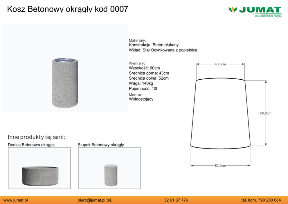 Kosz Betonowy okrągły kod 0007 Materiały: Konstrukcja: Beton płukany Wkład: Stal Ocynkowana z popielnicą Wymiary: Wysokość: 60cm Średnica górna: 43cm Średnica dolna: 52cm Waga: 140kg Pojemność: 40l Montaż: Wolnostojący Inne produkty tej serii: Donica Betonowa okrągła www.jumat.pl Słupek Betonowy okrągły [email protected] tel. 32 61 37 776 tel. kom. 790 200 084