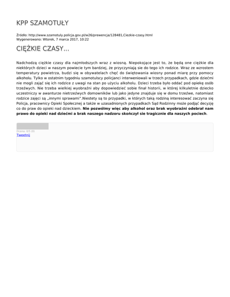 KPP SZAMOTUŁY Źródło: http://www.szamotuly.policja.gov.pl/w26/prewencja/128481,Ciezkie-czasy.html Wygenerowano: Wtorek, 7 marca 2017, 10:22 CIĘŻKIE CZASY... Nadchodzą ciężkie czasy dla najmłodszych wraz z wiosną. Niepokojące jest to, że będą one ciężkie dla niektórych dzieci w naszym powiecie tym bardziej, że przyczyniają sie do tego ich rodzice. Wraz ze wzrostem temperatury powietrza, budzi się w obywatelach chęć do świętowania wiosny ponad miarę przy pomocy alkoholu. Tylko w ostatnim tygodniu szamotulscy policjanci interweniowali w trzech przypadkach, gdzie dziećmi nie mogli zająć się ich rodzice z uwagi na stan po użyciu alkoholu. Dzieci trzeba było oddać pod opiekę osób trzeźwych. Nie trzeba wielkiej wyobraźni aby dopowiedzieć sobie finał historii, w której kilkuletnie dziecko uczestniczy w awanturze nietrzeźwych domowników lub jako jedyne znajduje się w domu trzeźwe, natomiast rodzice zajęci są „innymi sprawami”.Niestety są to przypadki, w których taką rodziną interesować zaczyna się Policja, pracownicy Opieki Społecznej a także w uzasadnionych przypadkach Sąd Rodzinny może podjąć decyzję co do praw do opieki nad dzieckiem. Nie pozwólmy więc aby alkohol oraz brak wyobraźni odebrał nam prawo do opieki nad dziećmi a brak naszego nadzoru skończył sie tragicznie dla naszych pociech. Ocena: 0/5 (0) Tweetnij