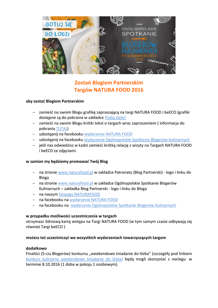 Zostań Blogiem Partnerskim Targów NATURA FOOD 2016 aby zostać Blogiem Partnerskim zamieść na swoim Blogu grafikę zapraszającą na targi NATURA FOOD i beECO (grafiki dostępne są do pobrania w zakładce Podaj dalej! zamieść na swoim Blogu krótki tekst o targach wraz zaproszeniem ( informacja do pobrania TUTAJ) udostępnij na facebooku wydarzenie NATURA FOOD udostępnij na facebooku wydarzenie Ogólnopolskie Spotkanie Blogerów Kulinarnych jeśli nas odwiedzisz w Łodzi zamieść krótką relację z wizyty na Targach NATURA FOOD i beECO ze zdjęciami. w zamian my będziemy promować Twój Blog na stronie www.naturafood.pl w zakładce Patronaty (Blog Partnerski) - logo i linku do Bloga na stronie www.naturafood.pl w zakładce Ogólnopolskie Spotkanie Blogerów Kulinarnych – zakładka Blog Partnerski - logo i linku do Bloga na naszym fanpagu NATURAFOOD na facebooku na wydarzenie NATURA FOOD na facebooku na wydarzenie Ogólnopolskie Spotkanie Blogerów Kulinarnych w przypadku możliwości uczestniczenia w targach otrzymasz 3dniową kartę wstępu na Targi NATURA FOOD (w tym samym czasie odbywają się również Targi beECO ) możesz też uczestniczyć we wszystkich wydarzeniach towarzyszących targom dodatkowo Finaliści (5-ciu Blogerów) konkursu „weekendowe śniadanie do łóżka” (szczegóły pod linkiem Konkurs kulinarny weekendowe śniadanie do łóżka) będą mogli skorzystać z noclegu w terminie 8.10.2016 (1 doba w pokoju 1 osobowym).
