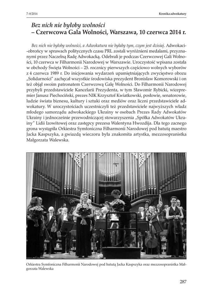 7–8/2014 Kronika adwokatury Bez nich nie byłoby wolności – Czerwcowa Gala Wolności, Warszawa, 10 czerwca 2014 r. Bez nich nie byłoby wolności, a Adwokatura nie byłaby tym, czym jest dzisiaj. Adwokaci‑obrońcy w sprawach politycznych czasu PRL zostali wyróżnieni medalami, przyznanymi przez Naczelną Radę Adwokacką. Odebrali je podczas Czerwcowej Gali Wolności, 10 czerwca w Filharmonii Narodowej w Warszawie. Uroczystość wpisana została w obchody Święta Wolności – 25. rocznicy pierwszych częściowo wolnych wyborów z 4 czerwca 1989 r. Do inicjowania wydarzeń upamiętniających zwycięstwo obozu „Solidarności” zachęcał wszystkie środowiska prezydent Bronisław Komorowski i on też objął swoim patronatem Czerwcową Galę Wolności. Do Filharmonii Narodowej przybyli przedstawiciele Kancelarii Prezydenta, w tym Sławomir Rybicki, wicepremier Janusz Piechociński, prezes NIK Krzysztof Kwiatkowski, posłowie, senatorowie, ludzie świata biznesu, kultury i sztuki oraz mediów oraz liczni przedstawiciele adwokatury. W uroczystościach uczestniczyli też przedstawiciele najwyższych władz młodego samorządu adwokackiego Ukrainy w osobach Prezes Rady Adwokatów Ukrainy i jednocześnie przewodniczącej stowarzyszenia „Spółka Adwokatów Ukrainy” Lidii Izowitowej oraz zastępcy prezesa Walentyna Hwozdija. Dla tego zacnego grona wystąpiła Orkiestra Symfoniczna Filharmonii Narodowej pod batutą maestro Jacka Kaspszyka, a gwiazdą wieczoru była znakomita artystka, mezzosopranistka Małgorzata Walewska. Orkiestra Symfoniczna Filharmonii Narodowej pod batutą Jacka Kaspszyka oraz mezzosopranistka Małgorzata Walewska 287 Kronika adwokatury PALESTRA Od lewej: adw. Lidia Izowitowa – prezes Rady Adwokatów Ukrainy, adw. Walentyn Hwozdij – zastępca prezesa RAU, Iryna Wasylyk, adw. Andrzej Zwara – prezes NRA Adw. dr hab. prof. UW Katarzyna Bilewska, przewodnicząca Komisji Działalności Publicznej Adwokatury przy NRA i adw. Andrzej Zwara, prezes NRA Koncert dedykowano wszystkim adwokatom, którzy walczyli o wolność Polski. Zanim na scenę weszli muzycy, poproszono na nią adwokatów uhonorowanych medalami z napisem „Dla Obrońcy Praw Człowieka – Adwokatura Polska” oraz z logo Święta Wolności. Uroczystość wręczenia odznaczeń poprowadzili adw. Andrzej Zwara, prezes NRA oraz adw. dr hab. prof. UW Katarzyna Bilewska, przewodnicząca Komisji Działalności Publicznej Adwokatury przy NRA. Medale wręczał również adw. Jacek Trela, wiceprezes NRA. Adwokat Zwara przypomniał, że nie byłoby wolności naszej ojczyzny, gdyby nie było polskiej Adwokatury. – Przez 45 lat reżimu komunistycznego polscy adwokaci, obrońcy polityczni, pomagali internowanym, aresztowanym, torturowanym, więzionym za walkę o wolność Polski. Dziś dla nich organizujemy ten koncert – mówił. – Jesteśmy im podwójnie wdzięczni – po pierwsze jako obywatele, a po drugie jako młodsi koledzy – powiedział. Prezes NRA zaznaczył, że to właśnie obrońcom politycznym współczesna Adwokatura zawdzięcza swój kształt. To oni stanowią najlepszą jej cząstkę – zawierającą heroizm; to oni tworzyli etos zawodu. W imieniu odznaczonych przemówiła adw. Anna Bogucka-Skowrońska, wybitna obrończyni w procesach politycznych, a potem m.in. wieloletni senator RP. – Kiedy 288 Kronika adwokatury 7–8/2014 Adw. Piotr Łukasz Andrzejewski odbiera medal z rąk prezesa NRA adw. Andrzeja Zwary Adw. Andrzej Bąkowski odbiera medal z rąk prezesa NRA adw. Andrzeja Zwary, obok adw. Maciej Bednarkiewicz zstępował duch, by odmienić oblicze ziemi, tej ziemi, obudziła się nadzieja w sercach Polaków na możliwość ideału etycznego ojczyzny – zaczęła od parafrazy słynnego zdania z homilii papieża św. Jana Pawła II, wygłoszonej podczas jego pierwszej pielgrzymki do Polski. Przypomniała, że gdy powstała „Solidarność”, wielki ruch społeczny, który ogarnął całe społeczeństwo, powstała również „Solidarność” adwokacka – Stowarzyszenie Adwokatów i Aplikantów Adwokackich w Łodzi. – Tam zjeżdżaliśmy się ze wszystkich stron Polski, by dyskutować o tym, jaka ma być Polska, jaka ma być polska Adwokatura – wspominała, wskazując też Zjazd Adwokatów w Poznaniu w styczniu 1981 r., w czasie którego adwokaci mieli poczucie, że „historia dzieje się na ich oczach”. – Wreszcie mogliśmy mówić to, co chcieliśmy mówić. Był to czas wielkiego święta. Doświadczaliśmy tego, jak wiatr wolności płynie z Polski do Europy – powiedziała. Ówczesna władza nie pozostawała jednak bezczynna, setki ludzi wsadzono do więzień, setki internowano. – Pisano nam w decyzjach o internowaniu, że jesteśmy wrogami Polski, ale wiedzieliśmy, że tak nie jest. Nie jest wrogiem Polski ten, kto sprzeciwia się aparatowi władzy, bo ojczyzna, jak mówił ks. prof. Józef Tischner, jest wyborem etycznym: można sprzeciwiać się Polsce teraźniejszej, w imię lepszej Polski jutra. I zepchnięto tę wielką społeczną nadzieję do podziemia. Wśród represjonowanych było wielu polskich adwokatów, razem z ludźmi «Solidarności» nieśliśmy ten narodowy krzyż. 289 Kronika adwokatury PALESTRA Adw. Anna Sobocińska-Lorenc odbiera medal z rąk wiceprezesa NRA adw. Jacka Treli Adw. Czesław Jaworski, redaktor naczelny „Palestry”, odbiera medal z rąk prezesa NRA adw. Andrzeja Zwary Uhonorowani adwokaci 290 7–8/2014 Kronika adwokatury Adw. Anna Bogucka-Skowrońska podczas przemówienia w imieniu uhonorowanych Pani Mecenas przypomniała, że adwokaci, wspierając „siostry i braci z Solidarności”, sięgnęli do poezji patriotycznej, żeby przywrócić im dumę i godność, niszczone przez władze komunistyczne. – Powtarzaliśmy w czasie mszy za ojczyznę słowa, które umacniały w nas nadzieję, słowa Ojca Świętego, że „Solidarność” jest jak Konstytucja 3 Maja, bo wyrosła z życia narodu, a naród musi żyć własn