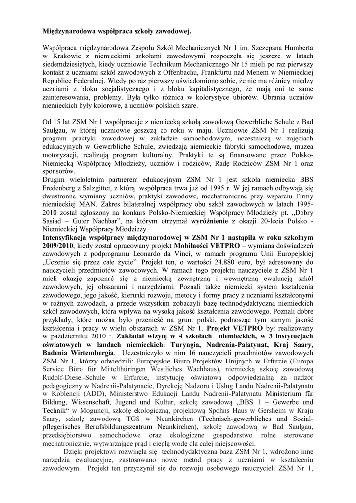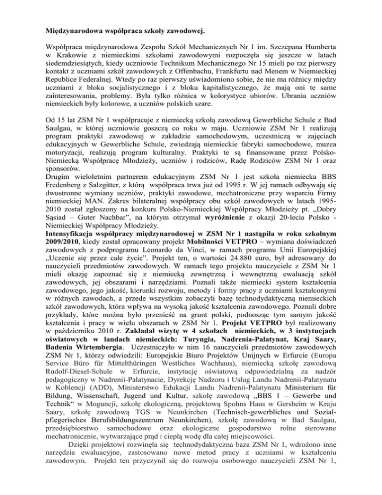 Międzynarodowa współpraca szkoły zawodowej. Współpraca międzynarodowa Zespołu Szkół Mechanicznych Nr 1 im. Szczepana Humberta w Krakowie z niemieckimi szkołami zawodowymi rozpoczęła się jeszcze w latach siedemdziesiątych, kiedy uczniowie Technikum Mechanicznego Nr 15 mieli po raz pierwszy kontakt z uczniami szkół zawodowych z Offenbachu, Frankfurtu nad Menem w Niemieckiej Republice Federalnej. Wtedy po raz pierwszy uświadomiono sobie, że nie ma różnicy między uczniami z bloku socjalistycznego i z bloku kapitalistycznego, że mają oni te same zainteresowania, problemy. Była tylko różnica w kolorystyce ubiorów. Ubrania uczniów niemieckich były kolorowe, a uczniów polskich szare. Od 15 lat ZSM Nr 1 współpracuje z niemiecką szkołą zawodową Gewerbliche Schule z Bad Saulgau, w której uczniowie goszczą co roku w maju. Uczniowie ZSM Nr 1 realizują program praktyki zawodowej w zakładzie samochodowym, uczestniczą w zajęciach edukacyjnych w Gewerbliche Schule, zwiedzają niemieckie fabryki samochodowe, muzea motoryzacji, realizują program kulturalny. Praktyki te są finansowane przez PolskoNiemiecką Współpracę Młodzieży, uczniów i rodziców, Radę Rodziców ZSM Nr 1 oraz sponsorów. Drugim wieloletnim partnerem edukacyjnym ZSM Nr 1 jest szkoła niemiecka BBS Fredenberg z Salzgitter, z którą współpraca trwa już od 1995 r. W jej ramach odbywają się dwustronne wymiany uczniów, praktyki zawodowe, mechatroniczne przy wsparciu Firmy niemieckiej MAN. Zakres bilateralnej współpracy obu szkół zawodowych w latach 19952010 został zgłoszony na konkurs Polsko-Niemieckiej Współpracy Młodzieży pt. „Dobry Sąsiad – Guter Nachbar”, na którym otrzymał wyróżnienie z okazji 20-lecia Polsko Niemieckiej Współpracy Młodzieży. Intensyfikacja współpracy międzynarodowej w ZSM Nr 1 nastąpiła w roku szkolnym 2009/2010, kiedy został opracowany projekt Mobilności VETPRO – wymiana doświadczeń zawodowych z podprogramu Leonardo da Vinci, w ramach programu Unii Europejskiej „Uczenie się przez całe życie”. Projekt ten, o wartości 24.880 euro, był adresowany do nauczycieli przedmiotów zawodowych. W ramach tego projektu nauczyciele z ZSM Nr 1 mieli okazję zapoznać się z niemiecką zewnętrzną i wewnętrzną ewaluacją szkół zawodowych, jej obszarami i narzędziami. Poznali także niemiecki system kształcenia zawodowego, jego jakość, kierunki rozwoju, metody i formy pracy z uczniami kształconymi w różnych zawodach, a przede wszystkim zobaczyli bazę technodydaktyczną niemieckich szkół zawodowych, która wpływa na wysoką jakość kształcenia zawodowego. Poznali dobre przykłady, które można było przenieść na grunt polski, podnosząc tym samym jakość kształcenia i pracy w wielu obszarach w ZSM Nr 1. Projekt VETPRO był realizowany w październiku 2010 r. Zakładał wizytę w 4 szkołach niemieckich, w 3 instytucjach oświatowych w landach niemieckich: Turyngia, Nadrenia-Palatynat, Kraj Saary, Badenia Wirtembergia. Uczestniczyło w nim 16 nauczycieli przedmiotów zawodowych ZSM Nr 1, którzy odwiedzili: Europejskie Biuro Projektów Unijnych w Erfurcie (Europa Service Büro für Mittelthüringen Westliches Wachhaus), niemiecką szkołę zawodową Rudolf-Diesel-Schule w Erfurcie, instytucję oświatową odpowiedzialną za nadzór pedagogiczny w Nadrenii-Palatynacie, Dyrekcję Nadzoru i Usług Landu Nadrenii-Palatynatu w Koblencji (ADD), Ministerstwo Edukacji Landu Nadrenii-Palatynatu Ministerium für Bildung, Wissenschaft, Jugend und Kultur, szkołę zawodową „BBS 1 – Gewerbe und Technik“ w Moguncji, szkołę ekologiczną, projektową Spohns Haus w Gersheim w Kraju Saary, szkołę zawodową TGS w Neunkirchen (Technisch-gewerbliches und Sozialpflegerisches Berufsbildungszentrum Neunkirchen), szkołę zawodową w Bad Saulgau, przedsiębiorstwo samochodowe oraz ekologiczne gospodarstwo rolne sterowane mechatronicznie, wytwarzające prąd i ciepłą wodę dla całej miejscowości. Dzięki projektowi rozwinęła się technodydaktyczna baza ZSM Nr 1, wdrożono inne narzędzia ewaluacyjne, zastosowano nowe metod pracy z uczniami w kształceniu zawodowym. Projekt ten przyczynił się do rozwoju osobowego nauczycieli ZSM Nr 1, sprawił, że aplikowali oni coraz więcej edukacyjnych projektów do różnych programów, podnieśli znajomość języków obcych, przezwyciężyli lęk uczestnictwa w projektach międzynarodowych i składania wizyt w zagranicznych szkołach zawodowych. Projekt VETPRO był kamykiem, który uruchomił „lawinę” innych projektów edukacyjnych. Od października 2010 r. nauczyciele ZSM Nr 1 realizowali indywidualne projekty unijne takie jak: wizyta studyjna z nadzoru pedagogicznego w Austrii, w Wiedniu (2010 r.) - wartość projektu 1260,00 euro, wizyta przygotowawcza do projektów unijnych w Finlandii, w fińskiej szkole zawodowej Kokkolan Ammattiopisto w Kokkoli (październik 2011 r.) - wartość projektu 1340,00 euro, staże zawodowe w Berlinie, w zakładach i szkołach niemieckich (luty 2012 r.) w ramach projektu z działania 3.4.3 Programu Operacyjnego Kapitał Ludzki pt. „Uczyć poprzez praktykę”, program pilotażowy doskonalenia nauczycieli kształcenia zawodowego. Dwukrotnie, w lutym 2011 r. i 2012 r. , ZSM Nr 1 jako szkoła przyjmująca aplikował do programu Asystent Comeniusa, wnioski konkursowe zostały pozytywnie ocenione przez komisję europejską. Niestety, nikt z członków UE tj. student, nauczyciel rozpoczynający staż zawodowy w roku 2011 nie odpowiedział na zaproszenie programu Comenius, co można zrozumieć, że pobyt roczny w Krakowie dla członków UE nie był atrakcyjny. Studenci z krajów europejskich wybierali takie kraje jak: Hiszpania, Portugalia, Włochy, Grecja, Bułgaria. Społeczność szkolna ZSM Nr 1 wierzy, że w tym roku szkolnym ktoś z członków UE pozytywnie odpowie na jej zaproszenie i będzie mógł przez rok gościć u nich, współpracować 
