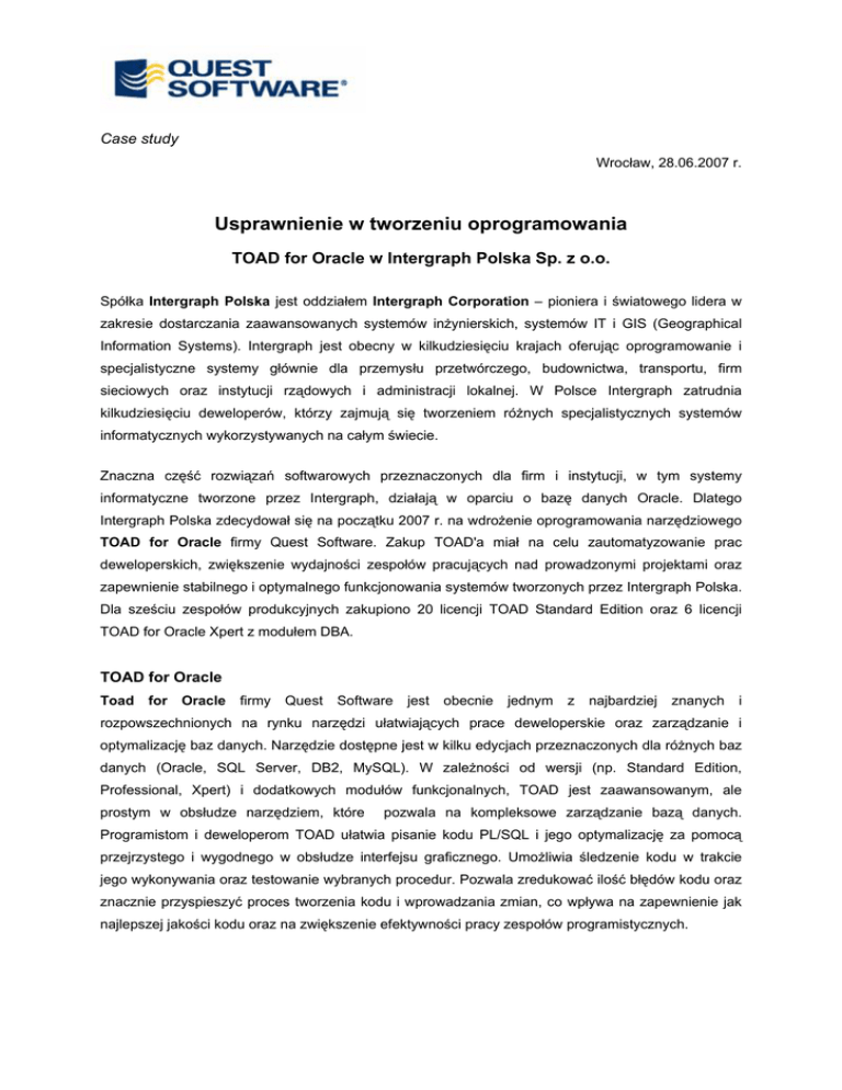 Case study Wrocław, 28.06.2007 r. Usprawnienie w tworzeniu oprogramowania TOAD for Oracle w Intergraph Polska Sp. z o.o. Spółka Intergraph Polska jest oddziałem Intergraph Corporation – pioniera i światowego lidera w zakresie dostarczania zaawansowanych systemów inżynierskich, systemów IT i GIS (Geographical Information Systems). Intergraph jest obecny w kilkudziesięciu krajach oferując oprogramowanie i specjalistyczne systemy głównie dla przemysłu przetwórczego, budownictwa, transportu, firm sieciowych oraz instytucji rządowych i administracji lokalnej. W Polsce Intergraph zatrudnia kilkudziesięciu deweloperów, którzy zajmują się tworzeniem różnych specjalistycznych systemów informatycznych wykorzystywanych na całym świecie. Znaczna część rozwiązań softwarowych przeznaczonych dla firm i instytucji, w tym systemy informatyczne tworzone przez Intergraph, działają w oparciu o bazę danych Oracle. Dlatego Intergraph Polska zdecydował się na początku 2007 r. na wdrożenie oprogramowania narzędziowego TOAD for Oracle firmy Quest Software. Zakup TOAD'a miał na celu zautomatyzowanie prac deweloperskich, zwiększenie wydajności zespołów pracujących nad prowadzonymi projektami oraz zapewnienie stabilnego i optymalnego funkcjonowania systemów tworzonych przez Intergraph Polska. Dla sześciu zespołów produkcyjnych zakupiono 20 licencji TOAD Standard Edition oraz 6 licencji TOAD for Oracle Xpert z modułem DBA. TOAD for Oracle Toad for Oracle firmy Quest Software jest obecnie jednym z najbardziej znanych i rozpowszechnionych na rynku narzędzi ułatwiających prace deweloperskie oraz zarządzanie i optymalizację baz danych. Narzędzie dostępne jest w kilku edycjach przeznaczonych dla różnych baz danych (Oracle, SQL Server, DB2, MySQL). W zależności od wersji (np. Standard Edition, Professional, Xpert) i dodatkowych modułów funkcjonalnych, TOAD jest zaawansowanym, ale prostym w obsłudze narzędziem, które pozwala na kompleksowe zarządzanie bazą danych. Programistom i deweloperom TOAD ułatwia pisanie kodu PL/SQL i jego optymalizację za pomocą przejrzystego i wygodnego w obsłudze interfejsu graficznego. Umożliwia śledzenie kodu w trakcie jego wykonywania oraz testowanie wybranych procedur. Pozwala zredukować ilość błędów kodu oraz znacznie przyspieszyć proces tworzenia kodu i wprowadzania zmian, co wpływa na zapewnienie jak najlepszej jakości kodu oraz na zwiększenie efektywności pracy zespołów programistycznych. Oprócz licencji TOAD’a for Oracle Standard Edition, firma Intergraph Polska zakupiła także TOAD for Oracle Xpert – najbardziej rozbudowaną wersję TOAD’a oferującą dodatkowe możliwości tuningu wydajności kodu SQL. TOAD for Oracle Xpert zawiera narzędzia SQL Scanner i SQL Optimizer, które pozwalają na wykrycie nieodpowiednich zapytań SQL i przeprowadzenie ich automatycznego tuningu. Ponadto SQL Optimizer dostarcza szczegółowych porad dotyczących optymalizacji poleceń SQL. Toad jest wyposażony także w wiele innych praktycznych funkcji, które pomagają deweloperom być bardziej produktywnymi i efektywniejszymi przy tworzeniu kodu: debugger kodu PL/SQL, baza wiedzy dla programistów i deweloperów (PL/SQL Knowledge Base) czy moduł Code Expert zintegrowany z edytorem i pozwalający na pisanie poprawnego i wydajnego kodu zgodnie z dobrymi praktykami programistycznymi. Duża funkcjonalność TOAD’a, intuicyjna i prosta obsługa oraz automatyzacja procesów wpłynęły na znaczą oszczędność czasu i zwiększyły efektywność pracy zespołów projektowych w Intergraph Polska. „Zaletą TOAD’a jest ogromna funkcjonalność połączona z łatwą obsługą i przejrzystym interfejsem graficznym. Od razu po wdrożeniu TOAD’a zauważyliśmy znaczne skrócenie czasu tworzenia systemów informatycznych. TOAD wpłynął na zmniejszenie ilości błędów popełnianych przez programistów. Ponadto usprawnił wykonywanie tuningu i pozwala łatwiej sprawdzić nieprawidłowości. To zmniejsza czas potrzebny na wykrycie i naprawienie problemu. TOAD stał się obecnie pewnym standardem jeżeli chodzi o zarządzanie środowiskiem Oracle. Bardzo wiele firm już korzysta z tego narzędzia, albo chce z niego korzystać.” - Jerzy Wiśniewski, Główny Projektant Systemów Informatycznych, Intergraph Polska Sp. z o.o. Oprócz uproszczenia i przyspieszenia rozwijania aplikacji, a także możliwości usuwania błędów kodu PL/SQL, TOAD pozwala na kompleksowe zarządzanie bazą danych Oracle i zautomatyzowanie wykonywania codziennych zadań administracyjnych, jak np. import/eksport danych, uaktualnianie statystyk, zarządzanie przestrzeniami tabel czy synchronizacja schematów. Dodatkowe moduły, takie jak zakupiony przez Intergraph Polska moduł DBA, pozwala sprawdzić kondycję instancji oraz testować wydajność bazy danych. „Poszukując narzędzi do zwiększenia wydajności i ułatwienia pracy, użytkownicy często decydują się na rozwiązania freeware’owe. Głównie z jednego powodu – rozwiązania takie są za darmo. Jednak żadne narzędzie informatyczne przeznaczone dla środowiska Oracle nie oferuje takiej dużej funkcjonalności połączonej z prostą i intuicyjną obsługą jak TOAD firmy Quest Software. To właśnie dlatego zakupiliśmy licencje TOAD’a.” - Jerzy Informatycznych, Intergraph Polska Sp. z o.o. Wiśniewski, Główny Projektant Systemów …………………………………………………………………………………………………………………………………………………….. Intergraph Polska Sp. z o.o. jest częścią międzynarodowej korporacji Intergraph Corporation założonej ponad 35 lat. Firma stała się pionierem w zakresie dostarczania zaawansowanych systemów inżynierskich, systemów GIS i IT przeznaczonych głównie dla przemysłu przetwórczego, budownictwa, transportu, firm sieciowych oraz instytucji rządowych i administracji lok