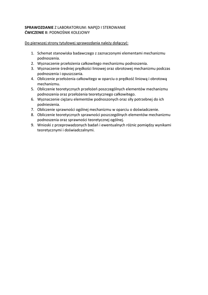 SPRAWOZDANIE Z LABORATORIUM: NAPĘD I STEROWANIE ĆWICZENIE II: PODNOŚNIK KOLEJOWY Do pierwszej strony tytułowej sprawozdania należy dołączyć: 1. Schemat stanowiska badawczego z zaznaczonymi elementami mechanizmu podnoszenia. 2. Wyznaczenie przełożenia całkowitego mechanizmu podnoszenia. 3. Wyznaczenie średniej prędkości liniowej oraz obrotowej mechanizmu podczas podnoszenia i opuszczania. 4. Obliczenie przełożenia całkowitego w oparciu o prędkość liniową i obrotową mechanizmu. 5. Obliczenie teoretycznych przełożeń poszczególnych elementów mechanizmu podnoszenia oraz przełożenia teoretycznego całkowitego. 6. Wyznaczenie ciężaru elementów podnoszonych oraz siły potrzebnej do ich podniesienia. 7. Obliczenie sprawności ogólnej mechanizmu w oparciu o doświadczenie. 8. Obliczenie teoretycznych sprawności poszczególnych elementów mechanizmu podnoszenia oraz sprawności teoretycznej ogólnej. 9. Wnioski z przeprowadzonych badań i ewentualnych różnic pomiędzy wynikami teoretycznymi i doświadczalnymi.