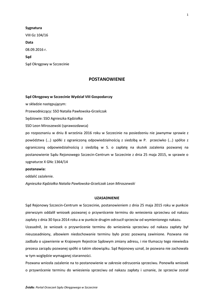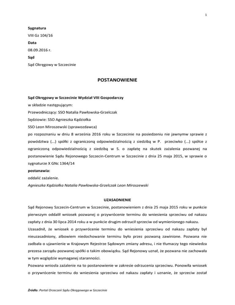 Postanowienie Sądu Okręgowego w Szczecinie z 8