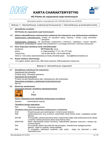 KARTA CHARAKTERYSTYKI HG Pianka do czyszczenia szyb kominowych [Sporządzona zgodnie z rozporządzeniem WE 1907/2006 (REACH) oraz 453/2010] Sekcja 1: Identyfikacja substancji/mieszaniny i identyfikacja przedsiębiorstwa 1.1 Identyfikator produktu HG Pianka do czyszczenia szyb kominowych 1.2 Istotne zidentyfikowane zastosowania substancji lub mieszaniny oraz zastosowania odradzane Zastosowania zidentyfikowane: środek do usuwania sadzy, tłuszczu i smoły z szyb kominków i piecyków. Zastosowania odradzane: nie spryskiwać powierzchni z marmuru, trawertynu i innych kamieni naturalnych zawierających wapień oraz powierzchni z surowego aluminium i tworzyw sztucznych. 1.3 Dane dotyczące dostawcy karty charakterystyki Dostawca: HG Polska Sp. z.o.o. Adres: ul. Dąbrowskiego 17 /21, 93-177 Łódź Telefon/Fax: +48 42 655 98 80/ +48 42 655 98 90 Adres e- mail osoby odpowiedzialnej za kartę charakterystyki: [email protected] 1.4 Numer telefonu alarmowego 112 (ogólny telefon alarmowy), 998 (straż pożarna), 999 (pogotowie medyczne) S ek cj a 2: I d e n t y f i k a c j a z a g r o ż e ń 2.1 Klasyfikacja substancji lub mieszaniny Zagrożenia dla człowieka Produkt żrący. Powoduje oparzenia. Zagrożenia dla środowiska Produkt nie jest klasyfikowany jako niebezpieczny dla środowiska. Zagrożenia wynikające z właściwości fizykochemicznych Nie ma. 2.2 Elementy oznakowania Oznaczenie literowe i określenie niebezpieczeństwa C Żrący Nazwy niebezpiecznych składników umieszczone na etykiecie Zawiera: wodorotlenek sodowy. Określenia rodzaju zagrożenia R34 Powoduje oparzenia. Określenia dotyczące prawidłowego postępowania z mieszaniną S1/2 Przechowywać pod zamknięciem i chronić przed dziećmi. S26 Zanieczyszczone oczy przemyć natychmiast dużą ilością wody i zasięgnąć porady lekarza. S27/28 W przypadku zanieczyszczenia skóry natychmiast zdjąć całą zanieczyszczoną odzież i przemyć zanieczyszczoną skórę dużą ilością wody. S36/37/39 Nosić odpowiednią odzież ochronną, odpowiednie rękawice ochronne i okulary lub ochronę twarzy. S45 W przypadku awarii lub jeżeli źle się poczujesz, niezwłocznie zasięgnij porady lekarza - jeżeli to możliwe, pokaż etykietę. S64 W przypadku połknięcia wypłukać usta wodą - nigdy nie stosować u osób nieprzytomnych. Data aktualizacji: 20.12.2010 str. 1/8 KARTA CHARAKTERYSTYKI HG Pianka do czyszczenia szyb kominowych Dodatkowe informacje Zawiera: anionowe środki powierzchniowo czynne (<5%), niejonowe środki powierzchniowo czynne (<5%), fosforany (<5%). 2.3 Inne zagrożenia Brak informacji na temat spełnienia kryteriów PBT lub vPvB zgodnie z załącznikiem XIII rozporządzenia REACH. Odpowiednie badania nie były przeprowadzone. Sekcja 3: 3.1 Substancje Nie dotyczy. 3.2 Mieszaniny Wodorotlenek sodu Zakres stężeń: Numer CAS: Numer WE: Numer rejestracji właściwej: Skład/informacja o składnikach 1-4,9% 1310-73-2 215-185-5 substancja podlega przepisom okresu przejściowego Klasyfikacja wg 67/548/EWG: C R35 Klasyfikacja wg 1272/2008/WE: Skin Corr. 1A, H314 Substancja z określoną na poziomie krajowym wartością najwyższego dopuszczalnego stężenia w środowisku pracy. Dodecylobenzenosulfonian sodu Zakres stężeń: 1-5% Numer CAS: 25155-30-0 Numer WE: 246-680-4 Numer rejestracji właściwej: substancja podlega przepisom okresu przejściowego Klasyfikacja wg 67/548/EWG: Xn R22, Xi R36/38 Klasyfikacja wg 1272/2008/WE: Acute Tox. 4 H302, Eye Irrit. 2 H319, Skin Irrit. 2 H315 Siarczan sodowy 2-etyloheksylu Zakres stężeń: 1-5% Numer CAS: 126-92-1 Numer WE: 204-812-8 Numer rejestracji właściwej: substancja podlega przepisom okresu przejściowego Klasyfikacja wg 67/548/EWG: Xi R38-41 Klasyfikacja wg 1272/2008/WE: Skin Irrit. 2 H315, Eye Dam.1 H318 Pełen tekst zwrotów R i H przytoczony został w sekcji 16 karty. Sekcja 4: 4.1 Środki pierwszej pomocy Opis środków pierwszej pomocy W kontakcie ze skórą: zdjąć zanieczyszczoną odzież. Narażone partie skóry płukać dokładnie wodą przez co najmniej 10 min. Natychmiast skontaktować się z lekarzem. Uprać odzież przed ponownym użyciem. W kontakcie z oczami: wyjąć szkła kontaktowe. Zanieczyszczone oczy przepłukiwać dokładnie wodą przez 10-15 min. Unikać silnego strumienia wody - ryzyko uszkodzenia rogówki. Natychmiast skontaktować się z lekarzem okulistą W przypadku spożycia: nie wywoływać wymiotów. Wypłukać usta wodą. Nigdy nie podawać niczego do ust osobie nieprzytomnej. Natychmiast wezwać lekarza, pokazać opakowanie lub etykietę. Data aktualizacji: 20.12.2010 str. 2/8 KARTA CHARAKTERYSTYKI HG Pianka do czyszczenia szyb kominowych Po narażeniu drogą oddechową: wyprowadzić poszkodowanego na świeże powietrze, zapewnić ciepło i spokój. Wezwać pomoc medyczną w przypadku dalszego występowania objawów lub w przypadku ich nasilania się. 4.2 Najważniejsze ostre i opóźnione objawy oraz skutki narażenia W kontakcie ze skórą: oparzenia, zaczerwienienie, pieczenie, ból, martwica rozpływna. W kontakcie z oczami: oparzenia, zaczerwienienie, łzawienie, ból, ryzyko uszkodzenia oczu. Po połknięciu: oparzenia, bóle ust, gardła lub przełyku, nudności i wymioty, ryzyko perforacji przełyku i żołądka. Po narażeniu drogą oddechową: mocne podrażnienie układu oddechowego. 4.3 Wskazania dotyczące wszelkiej natychmiastowej pomocy lekarskiej i szczególnego postępowania z poszkodowanym Decyzję o sposobie postępowania ratunkowego podejmuje lekarz po dokładnej ocenie stanu poszkodowanego. Sekcja 5: Postępowanie w przypadku pożaru 5.1 Środki gaśnicze Odpowiednie środki gaśnicze: użyć środka gaśniczego właściwego dla otoczenia. Niewłaściwe środki gaśnicze: zwarty strumień wody – niebezpieczeństwo rozprzestrzenienia pożaru. 5.2 Szczególne zagrożenia związane z substancją lub mieszaniną Podczas spalania mogą tworzyć się szkodliwe gazy zawierające tlenki węgla, tlenki azotu. Unikać wdy