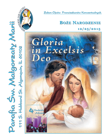 B OŻE N ARODZENIE 12/25/2015 111 S. Hubbard St. Algonquin, lL 60102 Parafia Św. Małgorzaty Marii Zakon Ojców Franciszkanów Konwentualnych 4 Niedziela Adwentu OD PROBOSZCZA Drodzy Przyjaciele! Tegoroczne Boże Narodzenie świętujemy na początku Jubileuszowego Roku Miłosierdzia. Celebrujemy narodzenie naszego Zbawiciela, o którym papież Franciszek napisał w bulli ogłaszającej Rok Miłosierdzia: „Jezus Chrystus jest obliczem miłosierdzia Ojca”. W Jezusie Chrystusie Bóg objawia nam to, co najpiękniejsze: miłość i miłosierdzie. Święta Siostra Faustyna w „Dzienniczku” tak pisze o Mszy Świętej w noc Bożego Narodzenia 25 XII 1934 roku: Słowa Ewangelii wg św. Łukasza 2,1-14 W owym czasie wyszło rozporządzenie Cezara Augusta, żeby przeprowadzić spis ludności w całym państwie. Pierwszy ten spis odbył się wówczas, gdy wielkorządcą Syrii był Kwiryniusz. Wybierali się więc wszyscy, aby się dać zapisać, każdy do swego miasta. Udał się także Józef z Galilei, z miasta Nazaret, do Judei, do miasta Dawidowego, zwanego Betlejem, ponieważ „Pasterka. Kiedy wyszła Msza św. zaraz mnie zaczęło pochodził z domu i rodu Dawida, żeby się dać zapisać ogarniać wewnętrzne skupienie, radość zalała mi duszę. z poślubioną sobie Maryją, która była brzemienna. W czasie ofiarowania ujrzałam Jezusa na ołtarzu, piękności nieporównanej. Dziecię to przez cały czas patrzyło się na Kiedy tam przebywali, nadszedł dla Maryi czas rozwiązawszystkich, wyciągając swoje rączęta. Kiedy nastąpiło pod- nia. Porodziła swego pierworodnego Syna, owinęła Go niesienie – Dziecię nie patrzyło się na kaplicę, ale w niebo, w pieluszki i położyła w żłobie, gdyż nie było dla nich po podniesieniu znowuż się patrzyło na nas... Radość jaką miejsca w gospodzie. miałam w duszy, trudno wypowiedzieć. (Dzienniczek, 347). Również i my mamy radość w sercu z powodu narodzin W tej samej okolicy przebywali w polu pasterze i trzymali Chrystusa. Wyciąga On do nas swoje ręce, aby nas przytulić straż nocną nad swoim stadem. Naraz stanął przy nich anioł Pański i chwała Pańska zewsząd ich oświeciła, tak że do swego serca napełnionego miłością i miłosierdziem. bardzo się przestraszyli. Lecz anioł rzekł do nich: „Nie Na innym miejscu w Dzienniczku św. Faustyna tak pisze: bójcie się! Oto zwiastuję wam radość wielką, która będzie „W czasie Mszy św. ujrzałam małe Dzieciątko Jezus, nie- udziałem całego narodu; dziś w mieście Dawida narodził zmiernie piękne, które z radością wyciągało do mnie rączę- się wam Zbawiciel, którym jest Mesjasz Pan. A to będzie ta. Po Komunii św. usłyszałam te słowa – Ja zawsze jestem znakiem dla was: Znajdziecie Niemowlę, owinięte w sercu twoim. ... Jezu, co jest powodem, że ukrywasz swój w pieluszki i leżące w żłobie”. Majestat, że opuściłeś tron nieba, a przebywasz z nami? I nagle przyłączyło się do anioła mnóstwo zastępów Odpowiedział mi Pan: Córko Moja, miłość mię sprowadziła niebieskich, które wielbiły Boga słowami: i miłość mię zatrzymuje. ... Mówię to dlatego, abyś się nieustannie łączyła ze Mną przez miłość, bo to jest cel życia „Chwała Bogu na wysokościach, a na ziemi pokój twojej duszy” (Dzienniczek, 575–576). ludziom, w których ma upodobanie”. Tak Jezus jest obliczem miłosierdzia Ojca. Bóg posyłając swego Syna na świat robi to, bo wie, że potrzebujemy miłosierdzia. Święty Grzegorz z Nyssy wyjaśnia, że Bóg widząc stan niedoli człowieka, można powiedzieć, opłakany stan, godny pożałowania i litości, wzruszył się i w tym wzruszeniu znalazł sposób na jego ocalenie. „Nasza chora natura wymagała uzdrowienia; upadła – potrzebowała podniesienia, martwa – wskrzeszenia. Utraciliśmy posiadanie dobra, trzeba było je nam przywrócić. Byliśmy zamknięci w ciemnościach, trzeba było przynieść nam światło. Będąc w niewoli, oczekiwaliśmy Zbawiciela; jako więźniowie potrzebowaliśmy pomocy, jako niewolnicy wyzwoliciela. Czy te powody były bez znaczenia? Czy nie zasługiwały one na wzruszenie Boga, na to, by zniżył się aż do poziomu naszej ludzkiej natury i nawiedził ją, skoro ludzkość znajdowała się w tak opłakanym i nieszczęśliwym stanie?” (KKK 457). Przyjmijmy więc Jezusa naszego Zbawiciela z ufnością i prostotą, do czego zachęca nas Św. O. Pio: „Zbliż się do Jezusa, by Go przyjąć, by przyjąć Jego pocałunek miłości i pokoju. ... Przez ten pocałunek pokoju pokonasz wszystkie próżne lęki świata, pokusy szatana i ciała, nie utracisz nawet odrobiny pokoju i odniesiesz pełne zwycięstwo. Pokój i Dobro Fr. Piotr Sarnicki, OFM, Conv. BŁOGOSŁAWIONYCH ŚWIĄT W imieniu naszej franciszkańskiej wspólnoty służącej w Parafii Świętej Małgorzaty Marii, życzę Wam Bożego Narodzenia napełnionego Pokojem i Dobrem. Niech Nowonarodzony Król, Jezus Chrystus obdarzy Was swoim błogosławieństwem i łaskami, których potrzebujecie. Niech umocni naszą wiarę, nadzieję i miłość. Niech obdarzy nas odwagą, której potrzebujemy, aby dzielić się radością i nadzieją płynącą z Bożego Narodzenia z ludźmi, których spotykamy na naszej drodze. Błogosławionych i radosnych Świąt Bożego Narodzenia. CZYTANIE Z KSIĘGI PROROKA IZAJASZA IZ 9,1-3.5-6 Naród kroczący w ciemnościach ujrzał światłość wielką; nad mieszkańcami kraju mroków zabłysło światło. Pomnożyłeś radość, zwiększyłeś wesele. Rozradowali się przed Tobą, jak się radują we żniwa, jak się weselą przy podziale łupu. Bo złamałeś jego ciężkie jarzmo i drążek na jego ramieniu, pręt jego ciemięzcy jak w dniu porażki Madianitów. Albowiem Dziecię nam się narodziło, Syn został nam dany, na Jego barkach spoczęła władza. Nazwano Go imieniem: Przedziwny Doradca, Bóg Fr. Piotr Sarnicki OFM, Conv. Mocny, Odwieczny Ojciec, Książę