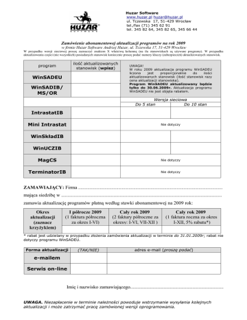 Huzar Software www.huzar.pl [email protected] ul. Tczewska 17, 51-429 Wrocław tel./fax (71) 345 62 91 tel. 345 82 64, 345 82 65, 345 66 44 Zamówienie abonamentowej aktualizacji programów na rok 2009 w firmie Huzar Software Andrzej Huzar, ul. Tczewska 17, 51-429 Wrocław W przypadku wersji sieciowej proszę zaznaczyć znakiem X właściwą kolumnę (na ilu stanowiskach są używane programy). W przypadku aktualizowania części (nie wszystkich) posiadanych stanowisk koniecznie proszę podać numery kluczy (zabezpieczeń) aktualizowanych stanowisk. ilość aktualizowanych stanowisk (wpisz) program WinSADEU WinSADIB/ MS/OR UWAGA! W roku 2009 aktualizacja programu WinSADEU liczona jest proporcjonalnie do ilości aktualizowanych stanowisk (ilość stanowisk razy cena aktualizacji stanowiska). Program WinSADEU aktualizowany będzie tylko do 30.06.2009r. Aktualizacja programu WinSADEU nie jest objęta rabatem. Wersja sieciowa Do 5 stan Do 10 stan IntrastatIB Mini Intrastat Nie dotyczy WinSkładIB WinUCZIB MagCS Nie dotyczy TerminatorIB Nie dotyczy ZAMAWIAJĄCY: Firma .............................................................................................................................. mająca siedzibę w ................................................................................................................................. zamawia aktualizację programów płatną według stawki abonamentowej na 2009 rok: Okres aktualizacji (zaznacz krzyżykiem) I półrocze 2009 (1 faktura półroczna za okres I-VI) Cały rok 2009 (2 faktury półroczne za okresy: I-VI, VII-XII ) Cały rok 2009 (1 faktura roczna za okres I-XII, 5% rabatu*) * rabat jest udzielany w przypadku złożenia zamówienia aktualizacji w terminie do 31.01.2009r; rabat nie dotyczy programu WinSADEU. Forma aktualizacji (TAK/NIE) adres e-mail (proszę podać) e-mailem Serwis on-line Imię i nazwisko zamawiającego........................................................................... UWAGA. Niezapłacenie w terminie należności powoduje wstrzymanie wysyłania kolejnych aktualizacji i może zatrzymać pracę zamówionej wersji oprogramowania. Huzar Software www.huzar.pl [email protected] ul. Tczewska 17, 51-429 Wrocław tel./fax (71) 345 62 91 tel. 345 82 64, 345 82 65, 345 66 44 Aktualizacja WinSADIB/MS/OR (ceny netto za pół roku) pierwsze stanowisko 342 kolejne stanowisko 306 Aktualizacja WinSADEU (ceny netto za pół roku) pierwsze stanowisko 480 kolejne stanowisko 444 sieć do 5 stan. i więcej (czytaj pod tabelą) Aktualizacja IntrastatIB (ceny netto za pół roku) pierwsze stanowisko 300 kolejne stanowisko 264 sieć do 5 stanowisk 642 sieć do 10 stanowisk 900 sieć do 15 stanowisk 1248 Aktualizacja Mini Intrastat (ceny netto za pół roku) pierwsze stanowisko 210 kolejne stanowisko 138 Aktualizacja WinSkładIB, WinUCZIB (ceny netto za pół roku) pierwsze stanowisko 252 kolejne stanowisko 156 sieć do 5 stanowisk 468 sieć do 10 stanowisk 780 Aktualizacja MagCS (ceny netto za pół roku) każde stanowisko 72 Aktualizacja TerminatorIB (ceny netto za pół roku) każde stanowisko 186 do podanych cen należy doliczyć VAT 22% Dodatkowe uwagi: W roku 2009 aktualizacja programów WinSADEU liczona będzie proporcjonalnie od ilości aktualizowanych stanowisk. W ramach tej zmiany wszyscy użytkownicy "wersji sieciowej do" otrzymują promocyjne przejście na program WinSADIB w cenie 1 zł + VAT. Od roku 2009 - ceny będą proporcjonalne (ilość stanowisk razy cena aktualizacji kolejnego stanowiska). W przypadku aktualizowania dwóch lub więcej pojedynczych stanowisk, wszystkie liczone są jako „kolejne stanowiska”; Aktualizacja prowadzona jest wyłącznie w dwóch zamkniętych okresach półrocznych. Koszt wykupienia aktualizacji w trakcie okresu jest taki sam, jak dla całego okresu półrocznego - bez względu na moment wykupienia aktualizacji; Do poprawnego działania dwóch programów współpracujących poprzez wymianę danych (WinSADIB/MS/OR z WinSkładIB/WinUCZIB/MagCS, MagCS z TerminatorIB) konieczna jest aktualizacja obu. UWAGA. Niezapłacenie w terminie należności powoduje wstrzymanie wysyłania kolejnych aktualizacji i może zatrzymać pracę zamówionej wersji oprogramowania.