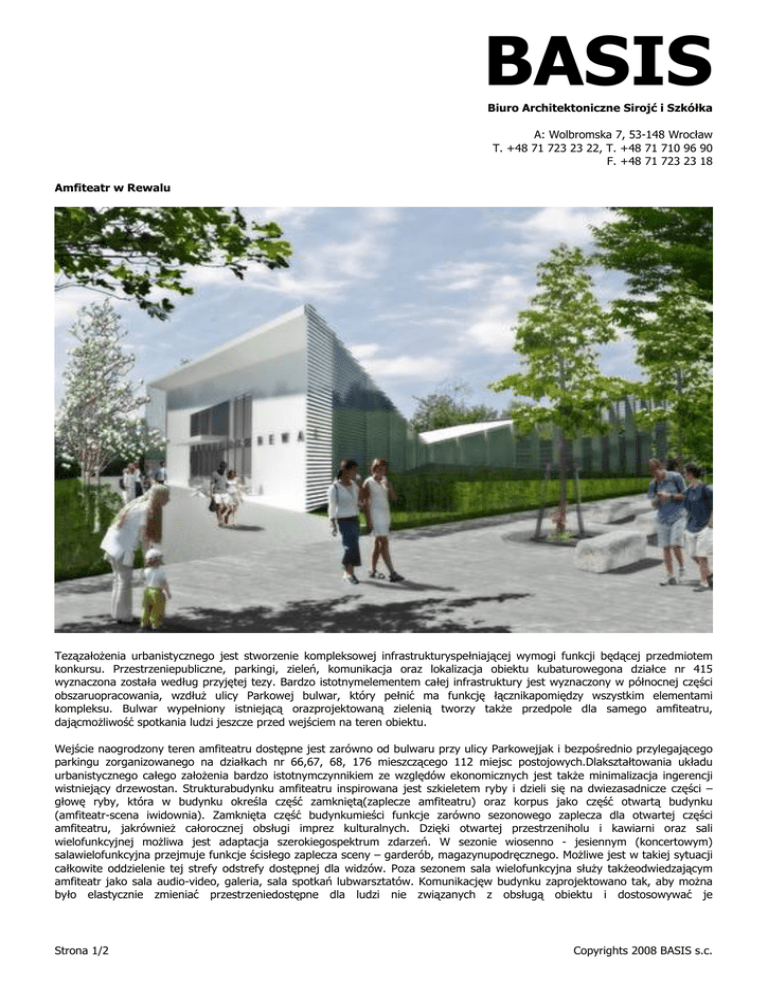 BASIS Biuro Architektoniczne Sirojć i Szkółka A: Wolbromska 7, 53-148 Wrocław T. +48 71 723 23 22, T. +48 71 710 96 90 F. +48 71 723 23 18 Amfiteatr w Rewalu Tezązałożenia urbanistycznego jest stworzenie kompleksowej infrastrukturyspełniającej wymogi funkcji będącej przedmiotem konkursu. Przestrzeniepubliczne, parkingi, zieleń, komunikacja oraz lokalizacja obiektu kubaturowegona działce nr 415 wyznaczona została według przyjętej tezy. Bardzo istotnymelementem całej infrastruktury jest wyznaczony w północnej części obszaruopracowania, wzdłuż ulicy Parkowej bulwar, który pełnić ma funkcję łącznikapomiędzy wszystkim elementami kompleksu. Bulwar wypełniony istniejącą orazprojektowaną zielenią tworzy także przedpole dla samego amfiteatru, dającmożliwość spotkania ludzi jeszcze przed wejściem na teren obiektu. Wejście naogrodzony teren amfiteatru dostępne jest zarówno od bulwaru przy ulicy Parkowejjak i bezpośrednio przylegającego parkingu zorganizowanego na działkach nr 66,67, 68, 176 mieszczącego 112 miejsc postojowych.Dlakształtowania układu urbanistycznego całego założenia bardzo istotnymczynnikiem ze względów ekonomicznych jest także minimalizacja ingerencji wistniejący drzewostan. Strukturabudynku amfiteatru inspirowana jest szkieletem ryby i dzieli się na dwiezasadnicze części – głowę ryby, która w budynku określa część zamkniętą(zaplecze amfiteatru) oraz korpus jako część otwartą budynku (amfiteatr-scena iwidownia). Zamknięta część budynkumieści funkcje zarówno sezonowego zaplecza dla otwartej części amfiteatru, jakrównież całorocznej obsługi imprez kulturalnych. Dzięki otwartej przestrzeniholu i kawiarni oraz sali wielofunkcyjnej możliwa jest adaptacja szerokiegospektrum zdarzeń. W sezonie wiosenno - jesiennym (koncertowym) salawielofunkcyjna przejmuje funkcje ścisłego zaplecza sceny – garderób, magazynupodręcznego. Możliwe jest w takiej sytuacji całkowite oddzielenie tej strefy odstrefy dostępnej dla widzów. Poza sezonem sala wielofunkcyjna służy takżeodwiedzającym amfiteatr jako sala audio-video, galeria, sala spotkań lubwarsztatów. Komunikacjęw budynku zaprojektowano tak, aby można było elastycznie zmieniać przestrzeniedostępne dla ludzi nie związanych z obsługą obiektu i dostosowywać je Strona 1/2 Copyrights 2008 BASIS s.c. BASIS Biuro Architektoniczne Sirojć i Szkółka A: Wolbromska 7, 53-148 Wrocław T. +48 71 723 23 22, T. +48 71 710 96 90 F. +48 71 723 23 18 wedlepotrzeby.Rozwiązaniaarchitektoniczne podporządkowują się przyjętej strukturze obiektu. Częśćzamknięta wykonana całkowicie w technice murowanej, otwarta natomiast wkonstrukcji drewna klejonego. Obie odmienne w charakterze części budynku –otwartą i zamkniętą - ujednolica wspólna elewacja z ażurowych drewnianychlameli oraz nadany wszystkim elementom biały kolor. Formabudynku ściśle odpowiada nadanej funkcji. Wysoka w przekroju i szeroka w rzuciestrona wejściowa nie tylko mieści największą ilość pomieszczeń (częściowospiętrzonych do dwóch kondygnacji) ale także nadaje rangi budynkowi. W głąbbudynku rzut oraz przekrój zawęża się aby zmieść już tylko scenę oraz przejściedla widzów. Dalsze rozszerzanie budynku to już odpowiedź na ergonomię widowni.Tak precyzyjnie kształtowana kubatura budynku ma swoje zalety także w ekonomicebudowania.Specyficznymdla budynku detalem z pewnością jest zadaszenie widowni. Proponowanakonstrukcja zadaszenia wykonana jest w technologii drewna klejonego w postaciram o zmieniającym się przekroju w zależności od rozpiętości (podobnie jak mato miejsce w konstruowaniu wręg łodzi) i stałym rozstawie wynoszącym 3m.Bezpośrednią ochronę przed warunkami atmosferycznymi stanowi natomiasttekstylne zadaszenie – żagle rozpięte pomiędzy konstrukcją. Pozazadaszeniem widowni o wyglądzie zewnętrznym decyduje także detal elewacji,który stanowią ażurowo rozmieszczone drewniane lamele mocowane do ściany ikonstrukcji zadaszenia na dystansie, wzmocnione cięgnami stalowymi pomiędzygłówną konstrukcją. Drewno konstrukcji i okładziny elewacyjnej zabezpieczonejest odpowiednią farbą w kolorze białym odporną na warunki atmosferyczne,chroniącą drewno przed promieniowaniem UVA i szarzeniem. Rok: 2008 Lokalizacja: Polska Wielkość: 2000 m2 Status: W Toku, Konkurs Zespół: Dariusz Sirojć, Krzysztof Szkółka Nagrody: PIERWSZA NAGRODA Strona 2/2 Copyrights 2008 BASIS s.c.