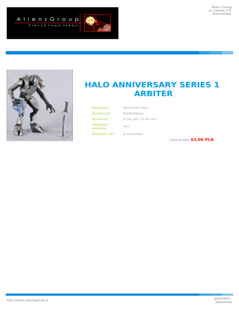 Aliens Group ul. Lipowa 17C Inowrocław HALO ANNIVERSARY SERIES 1 ARBITER Producent: McFarlane Toys Dostępność: Niedostępny Wysokość: 6 cali (ok. 15,24 cm) Kategoria wiekowa: 14+ Dostępny od*: w sprzedaży Cena brutto: http://www.aliensgroup.pl 62,00 PLN generator: aptusshop