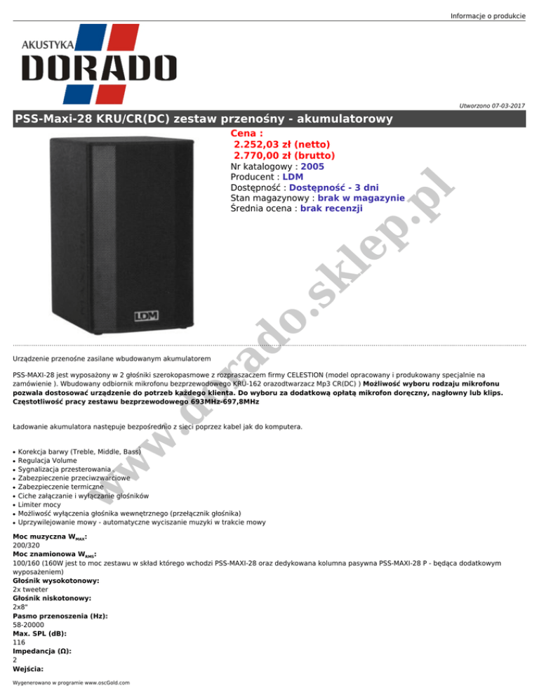 Informacje o produkcie Utworzono 07-03-2017 PSS-Maxi-28 KRU/CR(DC) zestaw przenośny - akumulatorowy Cena : 2.252,03 zł (netto) 2.770,00 zł (brutto) .d or ad o. sk le p. p l Nr katalogowy : 2005 Producent : LDM Dostępność : Dostępność - 3 dni Stan magazynowy : brak w magazynie Średnia ocena : brak recenzji Urządzenie przenośne zasilane wbudowanym akumulatorem PSS-MAXI-28 jest wyposażony w 2 głośniki szerokopasmowe z rozpraszaczem firmy CELESTION (model opracowany i produkowany specjalnie na zamówienie ). Wbudowany odbiornik mikrofonu bezprzewodowego KRU-162 orazodtwarzacz Mp3 CR(DC) ) Możliwość wyboru rodzaju mikrofonu pozwala dostosować urządzenie do potrzeb każdego klienta. Do wyboru za dodatkową opłatą mikrofon doręczny, nagłowny lub klips. Częstotliwość pracy zestawu bezprzewodowego 693MHz-697,8MHz ● ● ● ● ● ● ● Korekcja barwy (Treble, Middle, Bass) Regulacja Volume Sygnalizacja przesterowania Zabezpieczenie przeciwzwarciowe Zabezpieczenie termiczne Ciche załączanie i wyłączanie głośników Limiter mocy Możliwość wyłączenia głośnika wewnętrznego (przełącznik głośnika) Uprzywilejowanie mowy - automatyczne wyciszanie muzyki w trakcie mowy w ● w ● w Ładowanie akumulatora następuje bezpośrednio z sieci poprzez kabel jak do komputera. Moc muzyczna WMAX: 200/320 Moc znamionowa WRMS: 100/160 (160W jest to moc zestawu w skład którego wchodzi PSS-MAXI-28 oraz dedykowana kolumna pasywna PSS-MAXI-28 P - będąca dodatkowym wyposażeniem) Głośnik wysokotonowy: 2x tweeter Głośnik niskotonowy: 2x8" Pasmo przenoszenia (Hz): 58-20000 Max. SPL (dB): 116 Impedancja (Ω): 2 Wejścia: Wygenerowano w programie www.oscGold.com w w w .d or ad o. sk le p. p l Combo(in) x1; Chinch(in) x1 Wyjścia: Chinch(out) x1; Speakon(out) x1 Zasilanie: Akumulator 7Ah x2 Czas pracy akumulatora (h): 4 - 10 Gniazdo statywu: Tak Wykończenie: Lakier poliuretanowy Wymiary SxWxG (mm): 265x485x320 Waga (kg): 13 Gwarancja (lata): 2