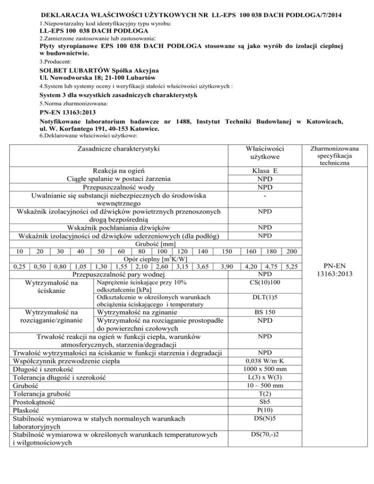 DEKLARACJA WŁAŚCIWOŚCI UŻYTKOWYCH NR LL-EPS 100 038 DACH PODŁOGA/7/2014 1.Niepowtarzalny kod identyfikacyjny typu wyrobu: LL-EPS 100 038 DACH PODŁOGA 2.Zamierzone zastosowanie lub zastosowania: Płyty styropianowe EPS 100 038 DACH PODŁOGA stosowane są jako wyrób do izolacji cieplnej w budownictwie. 3.Producent: SOLBET LUBARTÓW Spółka Akcyjna Ul. Nowodworska 18; 21-100 Lubartów 4.System lub systemy oceny i weryfikacji stałości właściwości użytkowych : System 3 dla wszystkich zasadniczych charakterystyk 5.Norma zharmonizowana: PN-EN 13163:2013 Notyfikowane laboratorium badawcze nr 1488, Instytut Techniki Budowlanej w Katowicach, ul. W. Korfantego 191, 40-153 Katowice. 6.Deklarowane właściwości użytkowe: Zasadnicze charakterystyki Właściwości użytkowe Reakcja na ogień Ciągłe spalanie w postaci żarzenia Przepuszczalność wody Uwalnianie się substancji niebezpiecznych do środowiska wewnętrznego Wskaźnik izolacyjności od dźwięków powietrznych przenoszonych drogą bezpośrednią Wskaźnik pochłaniania dźwięków Wskaźnik izolacyjności od dźwięków uderzeniowych (dla podłóg) Klasa E NPD NPD - 10 20 30 40 50 0,25 0,50 0,80 1,05 1,30 Grubość [mm] 60 80 100 120 Opór cieplny [m2K/W] 1,55 2,10 2,60 3,15 NPD NPD NPD 140 150 160 3,65 3,90 4,20 Przepuszczalność pary wodnej Naprężenie ściskające przy 10% Wytrzymałość na odkształceniu [kPa] ściskanie Odkształcenie w określonych warunkach obciążenia ściskającego i temperatury Wytrzymałość na rozciąganie/zginanie Zharmonizowana specyfikacja techniczna Wytrzymałość na zginanie Wytrzymałość na rozciąganie prostopadłe do powierzchni czołowych Trwałość reakcji na ogień w funkcji ciepła, warunków atmosferycznych, starzenia/degradacji Trwałość wytrzymałości na ściskanie w funkcji starzenia i degradacji Współczynnik przewodzenie ciepła Długość i szerokość Tolerancja długość i szerokość Grubość Tolerancja grubość Prostokątność Płaskość Stabilność wymiarowa w stałych normalnych warunkach laboratoryjnych Stabilność wymiarowa w określonych warunkach temperaturowych i wilgotnościowych 180 200 4,75 5,25 NPD CS(10)100 DLT(1)5 BS 150 NPD NPD NPD 0,038 W/m·K 1000 x 500 mm L(3) x W(3) 10 – 500 mm T(2) Sb5 P(10) DS(N)5 DS(70,-)2 PN-EN 13163:2013