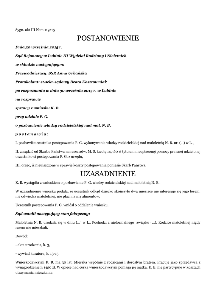 Sygn. akt III Nsm 119/15 POSTANOWIENIE Dnia 30 września 2015 r. Sąd Rejonowy w Lubinie III Wydział Rodzinny i Nieletnich w składzie następującym: Przewodniczący: SSR Anna Urbańska Protokolant: st.sekr.sądowy Beata Kosztowniak po rozpoznaniu w dniu 30 września 2015 r. w Lubinie na rozprawie sprawy z wniosku K. B. przy udziale P. G. o pozbawienie władzy rodzicielskiej nad mał. N. B. postanawia: I. pozbawić uczestnika postępowania P. G. wykonywania władzy rodzicielskiej nad małoletnią N. B. ur. (...) w L. , II. zasądzić od Skarbu Państwa na rzecz adw. M. S. kwotę 147,60 zł tytułem nieopłaconej pomocy prawnej udzielonej uczestnikowi postępowania P. G. z urzędu, III. orzec, iż nieuiszczone w sprawie koszty postępowania poniesie Skarb Państwa. UZASADNIENIE K. B. wystąpiła z wnioskiem o pozbawienie P. G. władzy rodzicielskiej nad małoletnią N. B.. W uzasadnieniu wniosku podała, że uczestnik odkąd dziecko skończyło dwa miesiące nie interesuje się jego losem, nie odwiedza małoletniej, nie płaci na nią alimentów. Uczestnik postępowania P. G. wniósł o oddalenie wniosku. Sąd ustalił następujący stan faktyczny: Małoletnia N. B. urodziła się w dniu (...) w L.. Pochodzi z nieformalnego związku (...). Rodzice małoletniej nigdy razem nie mieszkali. Dowód: - akta urodzenia, k. 3, - wywiad kuratora, k. 13-15. Wnioskodawczyni K. B. ma 30 lat. Mieszka wspólnie z rodzicami i dorosłym bratem. Pracuje jako sprzedawca z wynagrodzeniem 1450 zł. W opiece nad córką wnioskodawczyni pomaga jej matka. K. B. nie partycypuje w kosztach utrzymania mieszkania. Małoletnia N. B. ma obecnie 4 lata. Jest dzieckiem śmiałym, zdrowym i zadbanym. Nie pamięta ojca, jako tatę wskazuje dziadka. Wnioskodawczyni jest troskliwą matką, silnie związaną z dzieckiem emocjonalnie. Dowód: - wywiad kuratora, k. 13- 15, - przesłuchanie wnioskodawczyni, k. 36 (00:02:11-00:05:31). Uczestnik postępowania P. G. ma 31 lat, nie posiada zawodu. Był karany za przestępstwa: udział w bójce, znęcanie się nad osobą najbliższą, kradzieże, oszustwa. Przebywa w zakładzie karnym, gdzie nie pracuje. Karę pozbawienia wolności będzie odbywał do 2021r. Uczestnik postępowania do 3 miesiąca życia córki przychodził do dziecka na 2-3 godziny dziennie, ale nie uczestniczył w czynnościach pielęgnacyjnych nad dzieckiem, nie pomagał w opiece nad córką, tylko siedział i pił kawę lub herbatę. Pijany chciał zabrać dziecko na spacer. Wszczynał w obecności dziecka awantury. Odkąd dziecko skończyło trzy miesiące P. G. nie ma z dzieckiem żadnego kontaktu. Wyrokiem z dnia 8 grudnia 2011r. w sprawie o sygn. akt III RC 646/11 Sąd Rejonowy w Lubinie zasądził od P. G. na rzecz małoletniej N. B. alimenty w kwocie po 350 zł miesięcznie. P. G. nigdy nie wywiązywał się z ciążącego na nim obowiązku alimentacyjnego. K. B. otrzymuje alimenty na córkę z Funduszu Alimentacyjnego. Dowód: - wywiad kuratora, k. 13-15, - akta tut. Sądu o sygn. III RC 646/11, - informacja z K., k. 24-27,32- 35, - przesłuchanie uczestnika, k.53, - postanowienie o zajęciu, k. 80, - zaświadczenie o bezskuteczności, k. 79, - przesłuchanie wnioskodawczyni, k. 36 (00:02:11-00:05:31). Sąd zważył, co następuje: Wniosek zasługuje na uwzględnienie. Zgodnie z art.111 kro jeżeli rodzic w sposób rażący zaniedbuje swoje obowiązki względem dzieci, sąd opiekuńczy pozbawi tego rodzica władzy rodzicielskiej. W ocenie Sądu zachowanie uczestnika P. G. jest rażącym zaniedbywaniem swoich obowiązków wobec dziecka. Uczestnik postępowania od chwili urodzenia dziecka nie łoży na jego utrzymanie. Aktualnie jest osadzony w zakładzie karnym, gdzie nie pracuje. Uczestnik postępowania z własnej winy pozbawił się możliwości łożenia na utrzymanie dziecka i uczestniczenia w jego wychowaniu. Był wielokrotnie karany. W zakładzie karnym będzie przebywał do 2021r. Jeszcze zanim uczestnik został osadzony w zakładzie karnym nie interesował się losem swojego dziecka. Kontakt z dzieckiem miał jedynie do 3 miesiąca życia dziecka. Ale i wówczas nie interesował się dzieckiem w sposób wystarczający. Wprawdzie odwiedzał się dzieckiem, ale nie przejawiał zainteresowania, by pomóc matce w czynnościach opiekuńczych nad córką. Nadużywał też alkoholu, chciał nawet zabrać dziecko na spacer będąc pod wpływem alkoholu, w obecności dziecka wszczynał awantury. Małoletnia N. B. nie zna ojca, nie pamięta go. W czasie przeprowadzania przez kuratora wywiadu do niniejszej sprawy jako tatę wskazywała swojego dziadka, mówiła, że nie zna taty P. . Z zakładu karnego wnioskodawca nie wysyła do dziecka listów, kartek, nie dzwoni do dziecka, nie kontaktuje się z jego matką w sprawach wspólnej córki. Dziecko nie jest w żaden sposób związane emocjonalnie z uczestnikiem, nie pamięta go. Odkąd małoletnia N. B. skończyła 3 miesiące uczestnik nie interesował się dzieckiem, nie wiedział czy jest zdrowe, czy chore, czy ma zabezpieczone potrzeby. Nigdy nie płacił alimentów na córkę. Ponieważ P. G. nie dbał o zabezpieczenie potrzeb córki, pozostawiając to matce dziecka, Sąd uznał, iż rażąco zaniedbał on swoje obowiązki wobec dziecka i zachodzą podstawy do pozbawienia uczestnika władzy rodzicielskiej. Tym bardziej, że z własnej winy wyłączył się on z udziału w wychowaniu dziecka na wiele lat trafiając do zakładu karnego. Taka postawa uczestnika w sposób istotny utrudnia matce wychowywanie dzieci. Utrzymywanie fikcji wykonywania przez uczestnika władzy rodzicielskiej jest szkodliwe dla dziecka. Matka będzie miała dodatkowe trudności przy wyrażaniu zgody na czynności związane z podejmowaniem decyzji w sprawie dziecka, jak chociażby wyrobienie paszportu. Dlatego też Sąd uznał, iż wniosek K. B. o pozbawienie P. G. władzy rodzicielskiej nad małoletnią N. B. jest w pełni uzasadniony. Na marginesie należy dodać, że pozbawienie w