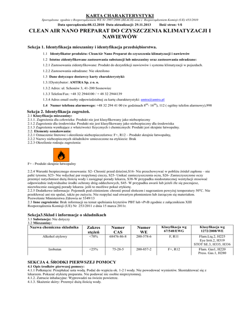 KARTA CHARAKTERYSTYKI Sporządzona zgodnie z Rozporządzeniem WE Nr 1907/2006 (REACH) oraz z Rozporządzeniem Komisji (UE) 453/2010 Data sporządzenia:08.12.2010 Data aktualizacji: 29.11.2013 Ilość stron: 1/5 CLEAN AIR NANO PREPARAT DO CZYSZCZENIA KLIMATYZACJI I NAWIEWÓW Sekcja 1. Identyfikacja mieszaniny i identyfikacja przedsiębiorstwa. 1.1 Identyfikator produktu: CleanAir Nano Preparat do czyszczenia klimatyzacji i nawiewów 1.2 Istotne zidentyfikowane zastosowania substancji lub mieszaniny oraz zastosowania odradzane: 1.2.1 Zastosowania zidentyfikowane: Produkt do dezynfekcji nawiewów i systemu klimatyzacji w pojazdach. 1.2.2 Zastosowania odradzane: Nie określono 1.3 Dane dotyczące dostawcy karty charakterystyki: 1.3.1Dystrybutor: AMTRA Sp. z o. o. 1.3.2 Adres: ul. Schonów 3, 41-200 Sosnowiec 1.3.3 Telefon/Fax: +48 32 2944100 / + 48 32 2944139 1.3.4 Adres email osoby odpowiedzialnej za kartę charakterystyki: [email protected] 1.4 Numer telefonu alarmowego: +48 32 294 41 00 (w godzinach 800- 1600), 112 ( ogólny telefon alarmowy),998 Sekcja 2. Identyfikacja zagrożeń. 2.1 Klasyfikacja mieszaniny: 2.1.1. Zagrożenia dla człowieka: Produkt nie jest klasyfikowany jako niebezpieczny 2.1.2 Zagrożenie dla środowiska: Produkt nie jest klasyfikowany jako niebezpieczny dla środowiska 2.1.3 Zagrożenia wynikające z właściwości fizycznych i chemicznych: Produkt jest skrajnie łatwopalny. 2.2. Elementy oznakowania: 2.2.1 Oznaczenie literowe i określenie niebezpieczeństwa: F+, R12 – Produkt skrajnie łatwopalny, 2.2.2 Nazwy niebezpiecznych składników umieszczone na etykiecie: Brak 2.2.3 Określenie rodzaju zagrożenia: F+ - Produkt skrajnie łatwopalny 2.2.4 Warunki bezpiecznego stosowania: S2- Chronić przed dziećmi,S16- Nie przechowywać w pobliżu źródeł zapłonu – nie palić tytoniu; S23- Nie wdychać par rozpylonej cieczy, S25- Unikać zanieczyszczenia oczu, S26- Zanieczyszczone oczy przemyć natychmiast dużą ilością wody i zasięgnąć porady lekarza, S38-W przypadku niedostatecznej wentylacji stosować odpowiednie indywidualne środki ochrony dróg oddechowych, S45- W przypadku awarii lub jeżeli źle się poczujesz, niezwłocznie zasięgnij porady lekarza- jeśli to możliwe pokaż etykietę. 2.2.5 Dodatkowe informacje: Pojemnik pod ciśnieniem: chronić przed słońcem i nagrzaniem powyżej temperatury 50oC. Nie przekłuwać ani nie spalać, także po zużyciu. Nie rozpylać nad otwartym płomieniem lub żarzącym się materiałem. Pozwolenie Ministerstwa Zdrowia nr 5349/13 2.3 Inne zagrożenia: Brak informacji na temat spełniania kryteriów PBT lub vPvB zgodnie z załącznikiem XIII Rozporządzenia Komisji (UE) Nr 253/2011 z dnia 15 marca 2011r. Sekcja3.Skład i informacje o składnikach 3.1 Substancje: Nie dotyczy 3.2 Mieszaniny: Nazwa chemiczna składnika Zakres stężeń Numer CAS Numer WE Klasyfikacja wg 67/548/EWG Klasyfikacja wg 1272/2008/WE Alkohol etylowy <70% 68476-86-8 200-578-6 F, R11 Izobutan <25% 75-28-5 200-857-2 F+, R12 Flam.Liq.2, H225 Eye Irrit.2, H319 STOT SE.3, H335, H336 Flam. Gas1, H220 Press. Gas.1, H280 SEKCJA 4. ŚRODKI PIERWSZEJ POMOCY 4.1 Opis środków pierwszej pomocy: 4.1.1 Połknięcie: Przepłukać usta wodą. Podać do wypicia ok. 1-2 l wody. Nie powodować wymiotów. Skontaktować się z lekarzem. Pokazać etykietę preparatu. Nie podawać nic osobie nieprzytomnej. 4.1.2. Zatrucie inhalacyjne: Wyprowadzi na świeże powietrze. 4.1.3. Skażenie skóry: Przemyć dużą ilością wody. KARTA CHARAKTERYSTYKI Sporządzona zgodnie z Rozporządzeniem WE Nr 1907/2006 (REACH) oraz z Rozporządzeniem Komisji (UE) 453/2010 Data sporządzenia:08.12.2010 Data aktualizacji: 29.11.2013 Ilość stron: 2/5 CLEAN AIR NANO PREPARAT DO CZYSZCZENIA KLIMATYZACJI I NAWIEWÓW 4.1.4.Skażenie oczu: Płukać oczy dużą ilością wody ok. 15 minut przy otwartych powiekach, skonsultować się z lekarzem. 4.2 Najważniejsze ostre i opóźnione objawy oraz skutki narażenia: 4.2.1 Skażenie oczu: Może wystąpić podrażnienie, zaczerwienienie oraz łzawienie 4.2.2 Połknięcie: Mogą pojawić się mdłości, wymioty oraz ból brzucha 4.3 Wskazania dotyczące wszelkiej natychmiastowej pomocy lekarskiej i szczególnego postępowania z poszkodowanym: Nie dotyczy. Podjąć leczenie objawowe. SEKCJA 5. POSTĘPOWANIE W PRZYPADKU POŻARU 5.1 Środki gaśnicze: 5.1.1 Odpowiednie środki gaśnicze: Produkt jest palny. Piany odporne na alkohol lub piany tworzące film lub woda – prądy rozproszone w przypadku dużych pożarów, małe pożary gasić proszkiem gaśniczym, dwutlenkiem węgla 5.1.2 Niewłaściwe środki gaśnicze: Zwarty strumień wody 5.2 Szczególne zagrożenia związane z mieszaniną: Produkty niecałkowitego spalania mogą zawierać tlenek węgla, pary i aerozole produktu tworzą palne i wybuchowe mieszaniny z powietrzem, pary są cięższe od powietrza gromadzą się przy powierzchni oraz w dolnych częściach pomieszczenia. 5.3 Informacje dla straży pożarnej: Środki ochrony ogólnej typowe w przypadku pożaru. Nie należy przebywać w zagrożonej ogniem strefie bez odpowiedniego ubrania odpornego na chemikalia i aparatu do oddychania z niezależnym obiegiem powietrza. Zagrożone pożarem zbiorniki usunąć jeśli to możliwe i nie wiąże się z nadmiernym ryzykiem lub chłodzić rozpyloną wodą z odpowiedniej odległości. SEKCJA 6. POSTĘPOWANIE W PRZYPADKU NIEZAMIERZONEGO UWOLIENIA DO ŚRODOWISKA 6.1 Indywidualne środki ostrożności, wyposażenie ochronne i procedury w sytuacjach awaryjnych: 6.1.1 Dla osób niezależących do personelu likwidującego skutki awarii: Ograniczyć dostęp osób postronnych do obszaru awarii do czasu usunięcia awarii. W przypadku dużych wycieków odizolować zagrożony obszar. Stosować środki ochrony indywidualnej. Unikać długotrwałego kontaktu ze skórą. Unikać kontaktu z oczami. Przestrzegać zasad i przepisów BHP obowiązujących przy pracy z preparatami chemicznymi. 6.1.2 Dla osób likw