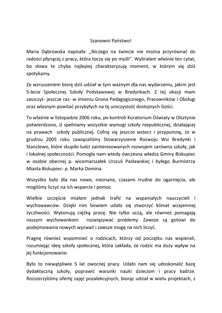 Szanowni Paostwo! Maria Dąbrowska napisała: „Niczego na świecie nie można przyrównad do radości płynącej z pracy, która toczy się po myśli”. Wybrałam właśnie ten cytat, bo słowa te chyba najlepiej charakteryzują moment, w którym się dziś spotykamy. Ze wzruszeniem biorę dziś udział w tym ważnym dla nas wydarzeniu, jakim jest 5-lecie Społecznej Szkoły Podstawowej w Bredynkach. Z tej okazji mam zaszczyt- jeszcze raz- w imieniu Grona Pedagogicznego, Pracowników i Obsługi oraz własnym powitad przybyłych na tę uroczystośd dostojnych Gości. To właśnie w listopadzie 2006 roku, po kontroli Kuratorium Oświaty w Olsztynie potwierdzono, iż spełniamy wszystkie wymogi szkoły niepublicznej, działającej na prawach szkoły publicznej. Cofnę się jeszcze wstecz i przypomnę, że w grudniu 2005 roku zawiązaliśmy Stowarzyszenie Rozwoju Wsi Bredynki i Stanclewo, które skupiło ludzi zainteresowanych rozwojem zarówno szkoły, jak i lokalnej społeczności. Pomogła nam wtedy ówczesna władza Gminy Biskupiec w osobie obecnej p. wicemarszałek Urszuli Pasławskiej i byłego Burmistrza Miasta Biskupiec- p. Marka Domina. Wszystko było dla nas nowe, nieznane, czasami trudne do ogarnięcia, ale mogliśmy liczyd na ich wsparcie i pomoc. Wielkie szczęście miałam jednak trafid na wspaniałych nauczycieli i wychowawców. Dzięki nim bowiem udało się stworzyd klimat wzajemnej życzliwości. Wykonują ciężką pracę. Nie tylko uczą, ale również pomagają naszym wychowankom rozwiązywad problemy. Zawsze są gotowi do podejmowania nowych wyzwao i zawsze mogę na nich liczyd. Pragnę również wspomnied o rodzicach, którzy od początku nas wspierali, rozumiejąc ideę szkoły społecznej, która zakłada, że rodzic ma duży wpływ na jej funkcjonowanie. Było to niewątpliwie 5 lat owocnej pracy. Udało nam się udoskonalid bazę dydaktyczną szkoły, poprawid warunki nauki dzieciom i pracy kadrze. Rozszerzyliśmy ofertę zajęd pozalekcyjnych, biorąc udział w wielu projektach, z których pozyskiwaliśmy dodatkowe środki. Od 4 lat funkcjonuje pod patronatem naszego Stowarzyszenia punkt przedszkolny „Słoneczko”, a od września bieżącego roku prowadzimy także Społeczną Szkołę Podstawową w Borkach Wielkich oraz punkt przedszkolny „Radosne przedszkolaki” współfinansowany z Europejskiego Funduszu Społecznego. Marzę o tym, byśmy jeszcze mogli przez długi czas cieszyd się owocami naszej pracy i rozwijad się, by jednocześnie przynosid korzyśd lokalnej społeczności, która- może powiem to nieskromnie-ma to szczęście, że w ich najbliższym otoczeniu istnieją takie placówki jak nasze. Jesteśmy małą wiejską szkółką, ale mam nadzieję, że robimy rzeczy ważne i potrzebne. Myślę, że jest to dobry moment, by podziękowad wszystkim tym, którzy wspierali nas przez te 5 lat. Często robili to z dużym zaangażowaniem i bezinteresownie, bo jak powiedział Henry Boye: „Najważniejsze wyprawy w życiu, to wychodzenie ludziom naprzeciw”.