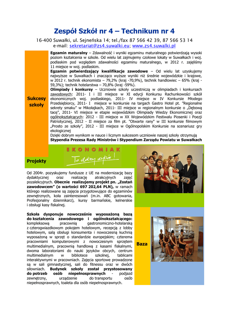 Zespół Szkół nr 4 – Technikum nr 4 16-400 Suwałki, ul. Sejneńska 14; tel./fax 87 566 42 39, 87 566 53 14 e-mail: [email protected]; www.zs4.suwalki.pl Sukcesy szkoły Egzamin maturalny – Zdawalność i wyniki egzaminu maturalnego potwierdzają wysoki poziom kształcenia w szkole. Od wielu lat zajmujemy czołowe lokaty w Suwałkach i woj. podlaskim pod względem zdawalności egzaminu maturalnego, w 2012 r. zajęliśmy 11 miejsce w woj. podlaskim. Egzamin potwierdzający kwalifikacje zawodowe – Od wielu lat uzyskujemy najwyższe w Suwałkach i znacząco wyższe wyniki niż średnie wojewódzkie i krajowe, w 2012 r. technik ekonomista – 79,2% (kraj -70,9%), technik handlowiec – 65% (kraj 59,3%); technik hotelarstwa – 70,8% (kraj -59%). Olimpiady i konkursy – Uczniowie szkoły uczestniczą w olimpiadach i konkursach zawodowych: 2011- I i III miejsce w XI edycji Konkursu Rachunkowości szkół ekonomicznych woj. podlaskiego, 2011- IV miejsce w IV Konkursie Młodego Przedsiębiorcy, 2011- I miejsce w konkursie na targach Gastro Hotel pt. ”Regionalne sekrety smaku” w Mikołajkach, 2011- III miejsce w regionalnym konkursie o „Dębową tacę”, 2011- VI miejsce w etapie wojewódzkim Olimpiady Wiedzy Ekonomicznej oraz ogólnokształcących: 2012 - III miejsce w XX Wojewódzkim Festiwalu Piosenki i Poezji Patriotycznej, 2012 - II miejsce za film pt. "Otwarte rany" w III konkursie filmowym „Prosto ze szkoły”, 2012 - III miejsce w Ogólnopolskim Konkursie na scenariusz gry ekologicznej Dzięki dobrym wynikom w nauce i licznym sukcesom uczniowie naszej szkoły otrzymują Stypendia Prezesa Rady Ministrów i Stypendium Zarządu Powiatu w Suwałkach Projekty Od 2004r. pozyskujemy fundusze z UE na modernizację bazy dydaktycznej oraz realizację atrakcyjnych zajęć pozalekcyjnych. Obecnie realizujemy projekt pn. „Zostań zawodowcem” (o wartości 697 202,64 PLN), w ramach którego realizowane są zajęcia przygotowujące do egzaminów zewnętrznych, koła zainteresowań (m.in. ABC gotowania, Profesjonalny dziennikarz), kursy barmańskie, kelnerskie i obsługi kasy fiskalnej. Szkoła dysponuje nowocześnie wyposażoną bazą do kształcenia zawodowego i ogólnokształcącego: kompleksową pracownią gastronomiczno-hotelarską z czterogwiazdkowym pokojem hotelowym, recepcją z lobby hotelowym, salą obsługi konsumenta i nowoczesną kuchnią wyposażoną w sprzęt o standardzie europejskim; czterema pracowniami komputerowymi z nowoczesnym sprzętem multimedialnym, pracownią handlową z kasami fiskalnymi, dwoma laboratoriami do nauki języków obcych, centrum multimedialnym w bibliotece szkolnej, tablicami interaktywnymi w pracowniach. Zajęcia sportowe prowadzone są w sali gimnastycznej, sali do fitnessu oraz w dwóch siłowniach. Budynek szkoły został przystosowany do potrzeb osób niepełnosprawnych podjazd zewnętrzny, urządzenie do transportu osób niepełnosprawnych, toaleta dla osób niepełnosprawnych. Baza Koła zainteresowań organizowane w szkole odpowiadają zainteresowaniom i potrzebom uczniów, aktualnie działają m.in.: - Redakcja gazetki szkolnej „CDN..”- wielokrotnie nagradzana w Międzyszkolnym Konkursie na Najciekawsze Pismo Szkolne i Klasowe. - Szkolny Kabaret Literacki zdobywający nagrody w konkursach teatralnych. - Miniprzedsiębiorstwo – firma symulacyjna. - Szkolne Koło Caritas wielokrotnie nagradzane za działalność charytatywną. - Bogata oferta zajęć przedmiotowych i sportowych. Koła zainteresowań Oferta edukacyjna Zespołu Szkół nr 4 w roku szkolnym 2013/2014 Klasa Zawód/cykl kształcenia Proponowane rozszerzenia Język obcy Liczba miejsc IE Technik ekonomista - 4 lata matematyka – od 1 klasy geografia – od 2 klasy j. angielski, j. niemiecki/j. francuski 30 IT Technik hotelarstwa - 4 lata j. angielski – od 1 klasy geografia – od 2 klasy j. angielski, j. niemiecki/j. francuski 30 IH Technik handlowiec – 4 lata matematyka – od 1 klasy chemia – od 2 klasy j. angielski, j. niemiecki/j. francuski 15 IŻ Technik żywienia i usług gastronomicznych – 4 lata matematyka – od 1 klasy chemia – od 2 klasy j. angielski, j. niemiecki/j. francuski 15 Technik ekonomista Zawód skierowany jest do osób, które zainteresowane są pracą w: księgowości, działach kadr i płac, marketingu, sekretariacie, na stanowisku asystenta dyrektora. Podczas nauki uczeń nabywa umiejętności wykorzystania programów komputerowych do obsługi finansowo-księgowej przedsiębiorstw, prowadzenia spraw kadrowych, sporządzania list płac, rozliczeń podatkowych i dotyczących ubezpieczeń społecznych, wystawiania faktur. Zdobywa wiedzę z zakresu rachunkowości, tworzenia korespondencji, tworzenia biznesplanów, dokonywania analiz ekonomicznych. Zdaje egzamin potwierdzający dwie kwalifikacje w zawodzie: 1. Planowanie i prowadzenie działalności w organizacji 2. Prowadzenie rachunkowości Podczas nauki w szkole uczeń u pracodawców w wymiarze 6 tygodni. odbywa praktykę zawodową Technik hotelarstwa Zawód skierowany jest do osób, które zainteresowane są pracą w: hotelach, ośrodkach wypoczynkowych, pensjonatach, uzdrowiskach i agroturystyce. Podczas nauki uczeń nabywa umiejętności związane z: prowadzeniem działalności promocyjnej oraz sprzedażą usług hotelarskich, obsługą gości w recepcji hotelu, rezerwacją usług hotelarskich, udzielaniem informacji turystycznej, rozliczaniem kosztów pobytu w hotelu, przygotowaniem sali do obsługi gości, przygotowywaniem potraw i napojów oraz poznaje zasady sporządzania jadłospisów, zasady stosowania technik nakrywania stołu, rodzaje zastawy stołowej. Zdaje egzamin potwierdzający dwie kwalifikacje w zawodzie: 1. Planowanie i realizacja usług w recepcji 2. Obsługa gości w obiekcie świadczącym usługi hotelarskie Podczas nauki w szkole uczeń odbywa praktykę zawodową u pracodawców w wymiarze 8 tygodni. Technik handlowiec Zawód skierowany jest do uczniów, którzy z
