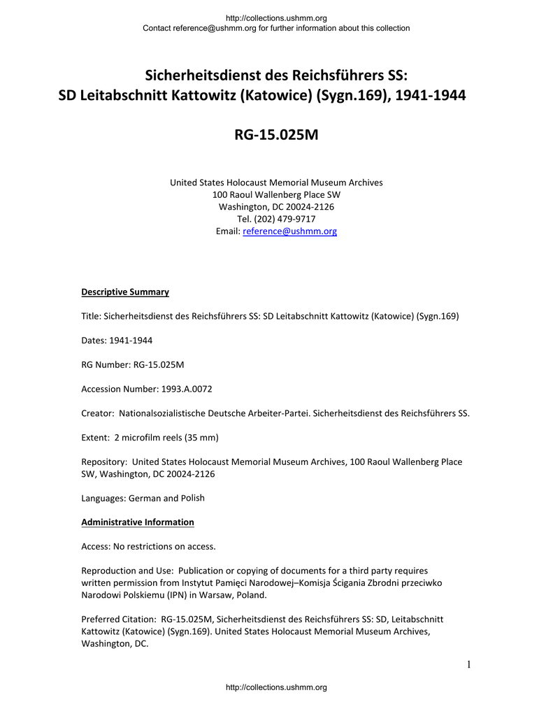 http://collections.ushmm.org Contact [email protected] for further information about this collection Sicherheitsdienst des Reichsführers SS: SD Leitabschnitt Kattowitz (Katowice) (Sygn.169), 1941‐1944 RG‐15.025M United States Holocaust Memorial Museum Archives 100 Raoul Wallenberg Place SW Washington, DC 20024‐2126 Tel. (202) 479‐9717 Email: [email protected] Descriptive Summary Title: Sicherheitsdienst des Reichsführers SS: SD Leitabschnitt Kattowitz (Katowice) (Sygn.169) Dates: 1941‐1944 RG Number: RG‐15.025M Accession Number: 1993.A.0072 Creator: Nationalsozialistische Deutsche Arbeiter‐Partei. Sicherheitsdienst des Reichsführers SS. Extent: 2 microfilm reels (35 mm) Repository: United States Holocaust Memorial Museum Archives, 100 Raoul Wallenberg Place SW, Washington, DC 20024‐2126 Languages: German and Polish Administrative Information Access: No restrictions on access. Reproduction and Use: Publication or copying of documents for a third party requires written permission from Instytut Pamięci Narodowej–Komisja Ścigania Zbrodni przeciwko Narodowi Polskiemu (IPN) in Warsaw, Poland. Preferred Citation: RG‐15.025M, Sicherheitsdienst des Reichsführers SS: SD, Leitabschnitt Kattowitz (Katowice) (Sygn.169). United States Holocaust Memorial Museum Archives, Washington, DC. 1 http://collections.ushmm.org http://collections.ushmm.org Contact [email protected] for further information about this collection Acquisition Information: Purchased from the Instytut Pamięci Narodowej – Komisja Ścigania Zbrodni przeciwko Narodowi Polskiemu, Poland, (Sygn.169). Forms part of the Claims Conference International Holocaust Documentation Archive at the United States Holocaust Memorial Museum. This archive consists of documentation whose reproduction and/or acquisition was made possible with funding from the Conference on Jewish Material Claims against Germany. Accruals: Accruals may have been received since this collection was first processed, see archives catalog at collections.ushmm.org for further information. Custodial History Existence and Location of Originals: The original records are held by the Instytut Pamięci Narodowej–Komisja Ścigania Zbrodni przeciwko Narodowi Polskiemu, ul. Towarowa 28, Warsaw, Poland 00‐839. Tel. 011 48 22 581 85 00. More information about this repository can be found at www.ipn.gov.pl. Processing History: Aleksandra B. Borecka Scope and Content of Collection Contains reports about the public opinion in various towns in the vicinity of Katowice (Kattowitz) from ca. 1941 to ca. 1944. The reports contain information about public opinions on economic matters, political matters, Russians, and members of the National Socialist's Russian movement in Germany; the "Day of German Domestic Music"; and recruitment of women into the air defense service. System of Arrangement The system of arrangement of the source repository has been preserved in the microfilmed reels. This collection is arranged thematically. Historical Note The Sicherheitsdienst des Reichsführers‐SS (Security Service of the Reichsführer‐ SS) (abbreviation SD ) was a part of the Nazi power structure in the time of National Socialism in the German Reich and during the war in occupied Europe. It was founded in 1931 as a secret unit of the NSDAP and operated under the Reich Security Main Office (RSHA). The organization was responsible for numerous crimes and was used especially to combat political opponents and to intimidate the population. The SD was instrumental in the establishment of the SS Einsatzgruppen. Indexing Terms Schukow, Iwan. Police administration‐‐Poland‐‐History‐‐Occupation, 1939‐1944. 2 http://collections.ushmm.org http://collections.ushmm.org Contact [email protected] for further information about this collection Nazi propaganda. National socialism and women. Women and the military‐‐Germany‐‐History‐‐20th century Poland‐‐History‐‐Occupation, 1939‐1945. Katowice (Poland) Reports. CONTAINER LIST Reel File 1 1 2 3 4 5 6 7 7a 8 9 10 11 11a 12 2 12 13 Description Bytom branch, 1943, 47 pages. Bieslko branch, 1943, 65 pages. Bogumin (Orderberg) branch, 1943, 6 pages. Cieszyn branch, 1943‐1944, 80 pages. Dziedzice branch, 1943, 2 pages. Gliwice branch, 1943‐1944, 77 pages. Grottkau branch, 1943, 76 pages. Katowice branch, 1942, 10 pages. Katowice branch, 1943‐1944, 158 pages. Kluczbork branch, 1943, 77 pages. Lubliniec branch, 1943‐1944, 103 pages. Neustadt branch, 1943, 90 pages. Opole branch, 1942, 4 pages. Opole branch, 1943‐1944, pages 1‐187. Continues on Reel 2. Opole branch, 1943‐1944, pages 168‐203. Continued from Reel 1. Pszczyna branch, 1943‐1944, 171 pages. Racibórz branch, 1942‐1943, 3 pages. 3 http://collections.ushmm.org http://collections.ushmm.org Contact [email protected] for further information about this collection 13a 14 14a 15 15a 16 17 18 19 20 21 22 Racibórz branch, 1943‐1944, 119 pages. Rybnik branch, 1942, 3 pages. Rybnik branch, 1943‐1944, 159 pages. Sosnowiec branch, 1942, 8 pages. Sosnowiec branch, 1943‐1944, 170 pages. Opinion concerning the daughter of V. M. (?), 1941, 1 page. Political (expert) opinion concerning Russians, members of the National Socialists Russian movement in Germany; the W‐wa group), 1941, 2 pages. Notice about the appearance of anti‐Nazi slogans on the walls of houses; Report about the "Day of German Domestic Music," 1942‐ 1943, 6 pages. Report about economic matters, 1942, 31 pages. Report about recruitment of women into air defense service, 1942, 4 pages. Report about Iwan Schukow, a Russian, deported to Gross Rosen, 1944, 14 pages. 4 http://collections.ushmm.org