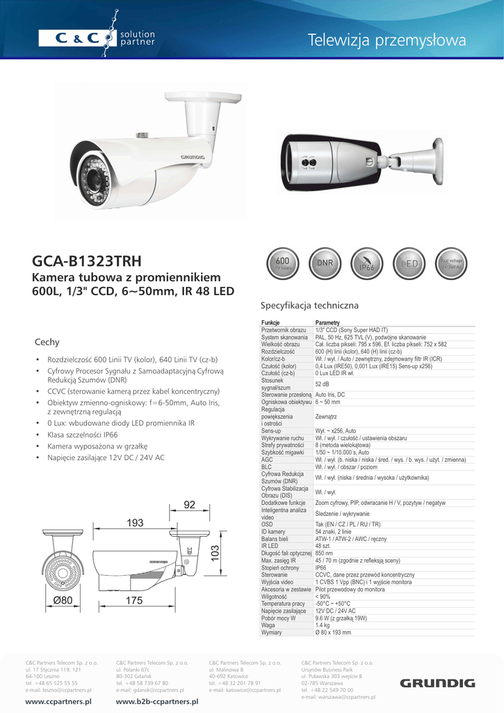 Telewizja przemysłowa GCA-B1323TRH Kamera tubowa z promiennikiem 600L, 1/3" CCD, 6~50mm, IR 48 LED Specyfikacja techniczna Cechy • Rozdzielczość 600 Linii TV (kolor), 640 Linii TV (cz-b) • Cyfrowy Procesor Sygnału z Samoadaptacyjną Cyfrową Redukcją Szumów (DNR) • CCVC (sterowanie kamerą przez kabel koncentryczny) • Obiektyw zmienno-ogniskowy: f=6-50mm, Auto Iris, z zewnętrzną regulacją • 0 Lux: wbudowane diody LED promiennika IR • Klasa szczelności IP66 • Kamera wyposażona w grzałkę • Napięcie zasilające 12V DC / 24V AC C&C Partners Telecom Sp. z o.o. ul. 17 Stycznia 119, 121 64-100 Leszno tel. +48 65 525 55 55 e-mail: [email protected] C&C Partners Telecom Sp. z o.o. ul. Polanki 67c 80-302 Gdańsk tel. +48 58 739 67 80 e-mail: [email protected] www.ccpartners.pl www.b2b-ccpartners.pl Funkcje Przetwornik obrazu System skanowania Wielkość obrazu Rozdzielczość Kolor/cz-b Czułość (kolor) Czułość (cz-b) Stosunek sygnał/szum Sterowanie przesłoną Ogniskowa obiektywu Regulacja powiększenia i ostrości Sens-up Wykrywanie ruchu Strefy prywatności Szybkość migawki AGC BLC Cyfrowa Redukcja Szumów (DNR) Cyfrowa Stabilizacja Obrazu (DIS) Dodatkowe funkcje Inteligentna analiza video OSD ID kamery Balans bieli IR LED Długość fali optycznej Max. zasięg IR Stopień ochrony Sterowanie Wyjścia video Akcesoria w zestawie Wilgotność Temperatura pracy Napięcie zasilające Pobór mocy W Waga Wymiary C&C Partners Telecom Sp. z o.o. ul. Malinowa 8 40-692 Katowice tel. +48 32 201 78 91 e-mail: [email protected] Parametry 1/3" CCD (Sony Super HAD IT) PAL, 50 Hz, 625 TVL (V), podwójne skanowanie Cał. liczba pikseli: 795 x 596, Ef. liczba pikseli: 752 x 582 600 (H) linii (kolor), 640 (H) linii (cz-b) Wł. / wył. / Auto / zewnętrzny, zdejmowany ltr IR (ICR) 0,4 Lux (IRE50), 0,001 Lux (IRE15) Sens-up x256) 0 Lux LED IR wł. 52 dB Auto Iris, DC 6 ~ 50 mm Zewnątrz Wył. ~ x256, Auto Wł. / wył. / czułość / ustawienia obszaru 8 (metoda wielokątowa) 1/50 ~ 1/10.000 s, Auto Wł. / wył. (b. niska / niska / śred. / wys. / b. wys. / użyt. / zmienna) Wł. / wył. / obszar / poziom Wł. / wył. (niska / średnia / wysoka / użytkownika) Wł. / wył. Zoom cyfrowy, PIP, odwracanie H / V, pozytyw / negatyw Śledzenie / wykrywanie Tak (EN / CZ / PL / RU / TR) 54 znaki, 2 linie ATW-1 / ATW-2 / AWC / ręczny 48 szt. 850 nm 45 / 70 m (zgodnie z reeksją sceny) IP66 CCVC, dane przez przewód koncentryczny 1 CVBS 1 Vpp (BNC) i 1 wyjście monitora Pilot przewodowy do monitora < 90% -50°C ~ +50°C 12V DC / 24V AC 9.6 W (z grzałką 19W) 1.4 kg Ø 80 x 193 mm C&C Partners Telecom Sp. z o.o. Ursynów Business Park ul. Puławska 303 wejście B 02-785 Warszawa tel. +48 22 549 70 00 e-mail: [email protected]