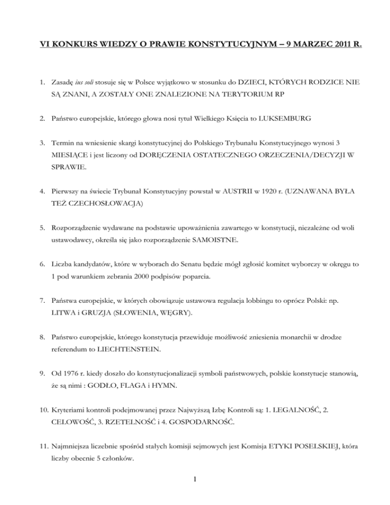 VI KONKURS WIEDZY O PRAWIE KONSTYTUCYJNYM – 9 MARZEC 2011 R. 1. Zasadę ius soli stosuje się w Polsce wyjątkowo w stosunku do DZIECI, KTÓRYCH RODZICE NIE SĄ ZNANI, A ZOSTAŁY ONE ZNALEZIONE NA TERYTORIUM RP 2. Państwo europejskie, którego głowa nosi tytuł Wielkiego Księcia to LUKSEMBURG 3. Termin na wniesienie skargi konstytucyjnej do Polskiego Trybunału Konstytucyjnego wynosi 3 MIESIĄCE i jest liczony od DORĘCZENIA OSTATECZNEGO ORZECZENIA/DECYZJI W SPRAWIE. 4. Pierwszy na świecie Trybunał Konstytucyjny powstał w AUSTRII w 1920 r. (UZNAWANA BYŁA TEś CZECHOSŁOWACJA) 5. Rozporządzenie wydawane na podstawie upowaŜnienia zawartego w konstytucji, niezaleŜne od woli ustawodawcy, określa się jako rozporządzenie SAMOISTNE. 6. Liczba kandydatów, które w wyborach do Senatu będzie mógł zgłosić komitet wyborczy w okręgu to 1 pod warunkiem zebrania 2000 podpisów poparcia. 7. Państwa europejskie, w których obowiązuje ustawowa regulacja lobbingu to oprócz Polski: np. LITWA i GRUZJA (SŁOWENIA, WĘGRY). 8. Państwo europejskie, którego konstytucja przewiduje moŜliwość zniesienia monarchii w drodze referendum to LIECHTENSTEIN. 9. Od 1976 r. kiedy doszło do konstytucjonalizacji symboli państwowych, polskie konstytucje stanowią, Ŝe są nimi : GODŁO, FLAGA i HYMN. 10. Kryteriami kontroli podejmowanej przez NajwyŜszą Izbę Kontroli są: 1. LEGALNOŚĆ, 2. CELOWOŚĆ, 3. RZETELNOŚĆ i 4. GOSPODARNOŚĆ. 11. Najmniejsza liczebnie spośród stałych komisji sejmowych jest Komisja ETYKI POSELSKIEJ, która liczby obecnie 5 członków. 1 12. Do obowiązków obywatela III RP naleŜy obowiązek NP. OBRONY OJCZYZNY, PRZESTRZEGANIE PRAWA, WIERNOŚĆ RP. 13. Państwo europejskie, gdzie wicepremierem zostaje szef największej partii opozycyjnej to LIECHTENSTEIN. 14. Parlament JEDNO- izbowy występuje np. w SZWECJI (DANII, LITWIE, ŁOTWIE, FINLANDII, ETC.) oraz na Węgrzech. 15. Do tej pory Konstytucja RP z 1997 r. została zmieniona DWA razy. Zmiany dotyczyły ZASAD EKSTRADYCJI I OGRANICZENIA BIERNEGO PRAWA WYBORCZEGO. 16. Prezesa Trybunału Konstytucyjnego powołuje PREZYDENT spośród dwóch kandydatów przedstawionych przez ZGROMADZENIE OGÓLNE TK. 17. Republika Korsyki - jako pierwsze państwo na świecie - przyznała kobietom prawa wyborcze w połowie XVIII wieku. 18. Podział na konstytucje normatywne, nominalne i semantyczne został dokonany przez KARLA LOEWENSTEINA. 19. Normę konstytucyjną, która stanowi, Ŝe „Władze publiczne prowadzą politykę zmierzającą do pełnego, produktywnego zatrudnienia”, uznaje się za normę PROGRAMOWĄ. 20. Rozporządzenie z mocą ustawy moŜe być wydawane w Polsce przez PREZYDENTA w czasie stanu WOJENNEGO, gdy SEJM NIE MOśE ZEBRAĆ SIĘ NA POSIEDZENIE. 21. Zasada dyskontynuacji prac parlamentu jest w RP uznawana za przykład PRAWA ZWYCZAJOWEGO. 22. Referendum abrogacyjne jest to REFERENDUM W SPRAWIE UCHYLENIA AKTU NORMATYWNEGO. 2 23. Marsyliusz z Padwy był twórcą zasady SUWERENNOŚCI LUDU, jednego z fundamentów współczesnych państw demokratycznych. 24. Przejęcie odpowiedzialności politycznej przez premiera za wypowiedzi głowy państwa, wygłoszone podczas obecności szefa rządu nosi nazwę KONTRASYGNATY MATERIALNEJ. 25. Głosowanie poprzez Internet w wyborach parlamentarnych jest stosowane tylko w jednym państwie europejskim – ESTONII. 26. Co do zasady, po wpłynięciu do Senatu ustawy uchwalonej przez Sejm, jego komisje mają 18 DNI na przygotowanie projektu uchwały Senatu w sprawie takiej ustawy. 27. O waŜności wyborów i referendów w RP rozstrzyga SĄD NAJWYśSZY. 28. Wydatki komitetów wyborczych w na kampanię wyborczą do Sejmu nie mogą przekroczyć sumy 0,82 PLN w przeliczeniu na jednego wyborcę. 29. RADA LEGISLACYJNA, działająca przy Prezesie Rady Ministrów, jest organem opiniodawczodoradczym Prezesa Rady Ministrów i Rady Ministrów w sprawach stanowienia prawa i oceny jego stanu w określonych dziedzinach. 30. DYSKRYMINACJA WYRÓWNAWCZA (POZYTYWNA) to przyznawanie dodatkowych praw grupom jednostek, których faktyczna pozycja jest słabsza niŜ pozostałej części społeczeństwa. 31. Rząd Szwecji powoływany jest przez TALMANA (PRZEWODNICZĄCEGO PARLAMENTU). 32. Teoretyczne załoŜenia europejskiego modelu kontroli konstytucyjności prawa jako pierwszy opracował HANS KELSEN. 33. Francuska Rada Konstytucyjna obligatoryjnie bada zgodność z konstytucją USTAW ORGANICZNYCH I REGULAMINÓW IZB PARLAMENTU. 34. Konstytucyjny system praw i wolności człowieka i obywatela w Polsce opiera się na zasadach GODNOŚCI, WOLNOŚCI i RÓWNOŚCI. 3 35. Zmiana konstytucji dotycząca istotnych kwestii ustrojowych to REWIZJA. 36. Orzeczenia Polskiego Trybunału Konstytucyjnego mają charakter ostateczny od roku 1999. 37. Inicjatywy ustawodawcze wykonywane przez obywateli nie mogą dotyczyć BUDśETU PAŃSTWA I ZMIANY KONSTYTUCJI. 38. Organem nadzoru nad samorządem terytorialnym jest WOJEWODA. 39. RADĘ GABINETOWĄ tworzy Rada Ministrów obradująca pod przewodnictwem Prezydenta. 40. Referendum lokalne dotyczące odwołania organu samorządu terytorialnego pochodzącego z wyborów jest wiąŜące, jeŜeli weźmie w nim udział 3/5 WYBORCÓW, KTÓRZY BRALI UDZIAŁ W WYBORACH DO TEGO ORGANU. 41. Instytucja konsultacji społecznych przeprowadzonych na poziomie lokalnym regulowana jest w drodze STATUTOWEJ. 42. W skład Trybunał Stanu wchodzi PRZWODNICZĄCY ORAZ DWÓCH ZASTĘPCÓW PRZEWODNICZĄCEGO I 16 CZŁONKÓW wybieranych przez SEJM. 43. Zgodnie z Polską konstytucją w sytuacji szczególnych zagroŜeń moŜe zostać wprowadzony jeden ze stanów nadzwyczajnych: WOJENNY , WYJĄTKOWY lub KLĘSKI śYWIOŁOWEJ. 44. Określenie „negatywny ustawodawca” odnosi się do TRYBUNAŁU KONSTYTUCYJNEGO. 45. Kontrola konstytucyjności projektów ustaw w Polsce dokonywana jest na wniosek Marszałka, po zaopiniowaniu przez Prezydium Sejmu, przez KOMISJĘ USTAWODAWCZĄ. 4
