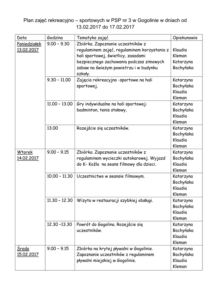Plan zajęć rekreacyjno – sportowych w PSP nr 3 w Gogolinie w dniach od 13.02.2017 do 17.02.2017 Data Poniedziałek 13.02.2017 Godzina 9.00 – 9.30 9.30 – 11.00 Tematyka zajęć Zbiórka. Zapoznanie uczestników z regulaminem zajęć, regulaminem korzystania z hali sportowej, świetlicy, zasadami bezpiecznego zachowania podczas zimowych zabaw na świeżym powietrzu i w budynku szkoły. Zajęcia rekreacyjno -sportowe na hali sportowej. 11.00 – 13.00 Gry indywidualne na hali sportowej: badminton, tenis stołowy, Wtorek 14.02.2017 13.00 Rozejście się uczestników. 9.00 – 9.15 Zbiórka. Zapoznanie uczestników z regulaminem wycieczki autokarowej. Wyjazd do K- Koźla na seans filmowy dla dzieci. 10.00 – 11.30 Uczestnictwo w seansie filmowym. 11.30 – 12.30 Wizyta w restauracji szybkiej obsługi. Środa 15.02.2017 12.30 –13.30 Powrót do Gogolina. Rozejście się uczestników. 9.00 – 9.15 Zbiórka na krytej pływalni w Gogolinie. Zapoznanie uczestników z regulaminem pływalni miejskiej w Gogolinie. Opiekunowie Klaudia Kleman Katarzyna Bochyńska Katarzyna Bochyńska Klaudia Kleman Katarzyna Bochyńska Klaudia Kleman Katarzyna Bochyńska Klaudia Kleman Katarzyna Bochyńska Klaudia Kleman Katarzyna Bochyńska Klaudia Kleman Katarzyna Bochyńska Klaudia Kleman Katarzyna Bochyńska Klaudia Kleman Katarzyna Bochyńska Klaudia Kleman 9.15 – 11.00 Zajęcia sportowe na pływalni miejskiej w Gogolinie. Katarzyna Bochyńska Klaudia Kleman 11.00 – 11.15 Powrót do szkoły autobusem. Katarzyna Bochyńska Klaudia Kleman Katarzyna Bochyńska Klaudia Kleman Katarzyna Bochyńska Klaudia Kleman 11.30 – 13.00 Gry i zabawy na hali sportowej. Czwartek 16.02.2017 Piątek 17.02.2017 13.00 Rozejście się uczestników. 9.00 – 9.30 Zbiórka. Przypomnienie regulaminu wycieczki pieszej. Zabawy na świeżym powietrzu. Katarzyna Bochyńska Klaudia Kleman 9.30 – 12.00 Gry i zabawy w terenowe. 12.00 –13.00 Gry i zabawy stolikowe i integracyjne. Katarzyna Bochyńska Klaudia Kleman Katarzyna Bochyńska Klaudia Kleman 13.00 Rozejście się uczestników. 9.00 – 9.15 Zbiórka. Przypomnienie regulaminu Hali sportowej. Katarzyna Bochyńska Klaudia Kleman Katarzyna Bochyńska Klaudia Kleman 9.15 – 11.00 Gry i zabawy z nagrodami. Rozgrywki sportowe drużynowo i indywidualnie. 11:00 -11:30 Podsumowanie rozgrywek sportowych. Rozdanie nagród uczestnikom. 11:30- 12:50 Wspólne granie uczestników w gry planszowe na świetlicy szkolnej 13:00 Pożegnanie. Rozejście się uczniów do domu. Organizator zastrzega sobie prawo do zmiany planu zajęć. Wycieczka do kina – odpłatne. Bilet do kina 13 zł + 10zł za autobus Bilet na basen kryty w Gogolinie 2zł Zapisy u p. Adama Boszczara, ilość miejsc ograniczona! Katarzyna Bochyńska Klaudia Kleman Katarzyna Bochyńska Klaudia Kleman Katarzyna Bochyńska Klaudia Kleman Katarzyna Bochyńska Klaudia Kleman