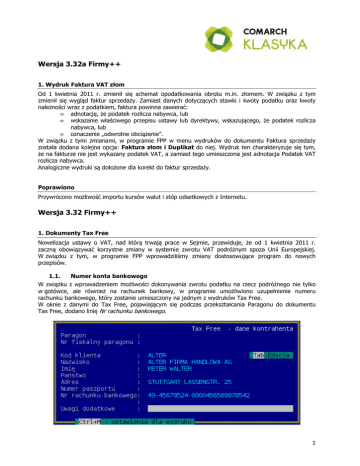 Wersja 3.32a Firmy++ 1. Wydruk Faktura VAT złom Od 1 kwietnia 2011 r. zmienił się schemat opodatkowania obrotu m.in. złomem. W związku z tym zmienił się wygląd faktur sprzedaży. Zamiast danych dotyczących stawki i kwoty podatku oraz kwoty należności wraz z podatkiem, faktura powinna zawierać: • adnotację, że podatek rozlicza nabywca, lub • wskazanie właściwego przepisu ustawy lub dyrektywy, wskazującego, że podatek rozlicza nabywca, lub • oznaczenie „odwrotne obciążenie”. W związku z tymi zmianami, w programie FPP w menu wydruków do dokumentu Faktura sprzedaży została dodana kolejna opcja: Faktura złom i Duplikat do niej. Wydruk ten charakteryzuje się tym, że na fakturze nie jest wykazany podatek VAT, a zamiast tego umieszczona jest adnotacja Podatek VAT rozlicza nabywca. Analogiczne wydruki są dołożone dla korekt do faktur sprzedaży. Poprawiono Przywrócono możliwość importu kursów walut i stóp odsetkowych z Internetu. Wersja 3.32 Firmy++ 1. Dokumenty Tax Free Nowelizacja ustawy o VAT, nad którą trwają prace w Sejmie, przewiduje, że od 1 kwietnia 2011 r. zaczną obowiązywać korzystne zmiany w systemie zwrotu VAT podróżnym spoza Unii Europejskiej. W związku z tym, w programie FPP wprowadziliśmy zmiany dostosowujące program do nowych przepisów. 1.1. Numer konta bankowego W związku z wprowadzeniem możliwości dokonywania zwrotu podatku na rzecz podróżnego nie tylko w gotówce, ale również na rachunek bankowy, w programie umożliwiono uzupełnienie numeru rachunku bankowego, który zostanie umieszczony na jednym z wydruków Tax Free. W oknie z danymi do Tax Free, pojawiającym się podczas przekształcania Paragonu do dokumentu Tax Free, dodano linię Nr rachunku bankowego. 1 Jeżeli dane pobierane są z karty kontrahenta, na której numer rachunku jest uzupełniony, wówczas numer ten przenoszony jest do pola Nr rachunku bankowego. W przeciwnym wypadku numer można uzupełnić ręcznie. 1.2. Zmiany na wydruku Rozporządzenie Ministra Finansów określa niezbędne dane, które powinien zawierać wydruk Tax Free. Tym samym przestaje obowiązywać wzór urzędowy takiego druku. Zachowanie wszystkich wymaganych elementów wskazanych w rozporządzeniu jest wystarczające do tego, aby taki dokument stanowił podstawę do zwrotu VAT. W związku z tymi zmianami, w programie wprowadzono nowe wydruki Tax Free. W momencie przekształcania Paragonu do dokumentu Tax Free <CTRL+F2> mamy do wyboru jedną opcję: TAX FREE – Zwrot VAT. Dopiero po uzupełnieniu okna z danymi do Tax Free pojawi się menu wydruków, w którym możemy wybrać, jaki wydruk będzie wykonany. Dodane zostały dwa nowe wydruki: Rozliczenie gotówkowe (graficzny) i Rozliczenie bezgotówkowe (graficzny). Obydwa wydruki są podobne i zawierają wszystkie niezbędne dane wskazane w rozporządzeniu, dodatkowo wydruk rozliczenia bezgotówkowego zawiera informacje o numerze rachunku bankowego, na który zostanie dokonany zwrot podatku VAT. Wydruki Nadruk tekstowy oraz Nadruk graficzny odpowiadają wydrukom z poprzednich wersji – odpowiednio TAX FREE – zwrot VAT oraz TAX FREE – wydruk graficzny. Nowością jest też opcja Polecenie przelewu, która została dokładniej opisana poniżej. 2 Takie same menu wydruków można również wywołać z poziomu listy dokumentów Tax Free (Historia/ Lista dokumentów TAX FREE). 1.3. Polecenie przelewu Umożliwiono wykonanie polecenia przelewu dla konkretnego dokumentu Tax Free. Funkcja może być wywołana z poziomu listy dokumentów Tax Free (kombinacja klawiszy <CTRL+P>) lub z poziomu formularza dokumentu Tax Free (nowa opcja Polecenie przelewu w menu wydruków). Dane kontrahenta na przelew pobierane są z formularza dokumentu Tax Free. 1.4. Ponad 7 pozycji na Paragonie przekształcanym do Tax Free Umożliwiono przekształcenie do Tax Free Paragonów zawierających ponad 7 pozycji. Przy próbie wykonania nadruku na Tax Free dla takich dokumentów pojawia się komunikat informacyjny: Dla dokumentów zawierających więcej niż 7 pozycji należy korzystać z nowych wydruków Rozliczenie gotówkowe (graficzny) lub Rozliczenie bezgotówkowe (graficzny). 2. Rozliczanie podatku VAT przy obrocie złomem Na podstawie Ustawy z dnia 25 lutego 2011 r. o zmianie ustawy o podatku od towarów i usług oraz ustawy – Prawo o miarach (ustawa jest aktualnie w Senacie/ustawa czeka na podpis Prezydenta) w przypadku skupu złomu obowiązek podatkowy ciąży na nabywcy będącym podatnikiem VAT. Jednocześnie nabywcom przysługuje prawo do odliczenia VAT (w programie mechanizm ten realizowany jest poprzez Faktury Wewnętrzne Sprzedaży i Faktury Wewnętrzne Zakupu). W związku z powyższym umożliwiono przekształcenie Przyjęcia Zewnętrznego do Faktury Wewnętrznej Sprzedaży niezależnie od statusu kontrahenta na PZ. Aby możliwe było takie przekształcenie, żadna pozycja na PZ nie może posiadać naliczonego podatku VAT. Uwaga: Po zmianie stawki VAT na pozycji dokumentu PZ nie jest aktualizowana stawka na karcie towaru w magazynie. 3