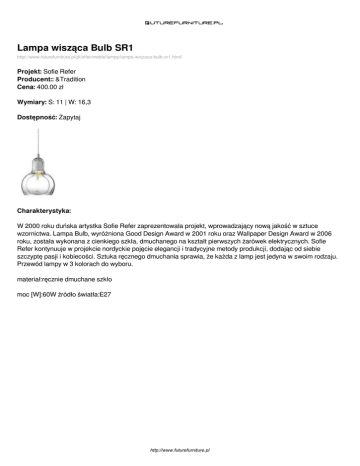 Lampa wisząca Bulb SR1 http://www.futurefurniture.pl/pl/offer/meble/lampy/lampa-wiszaca-bulb-sr1.html/ Projekt: Sofie Refer Producent:: &Tradition Cena: 400.00 zł Wymiary: S: 11 | W: 16,3 Dostępność: Zapytaj Charakterystyka: W 2000 roku duńska artystka Sofie Refer zaprezentowała projekt, wprowadzający nową jakość w sztuce wzornictwa. Lampa Bulb, wyróżniona Good Design Award w 2001 roku oraz Wallpaper Design Award w 2006 roku, została wykonana z cienkiego szkła, dmuchanego na kształt pierwszych żarówek elektrycznych. Sofie Refer kontynuuje w projekcie nordyckie pojęcie elegancji i tradycyjne metody produkcji, dodając od siebie szczyptę pasji i kobiecości. Sztuka ręcznego dmuchania sprawia, że każda z lamp jest jedyna w swoim rodzaju. Przewód lampy w 3 kolorach do wyboru. materiał:ręcznie dmuchane szkło moc [W]:60W źródło światła:E27 http://www.futurefurniture.pl Dostępne wersje produktu: nazwa produktu warianty cena Lampa wisząca Bulb klosz transparentny, 408.00zł SR1 kabel kolor czerwony dostępne Zapytaj Lampa wisząca Bulb klosz transparentny, SR1 kabel kolor czarny 408.00zł Zapytaj Lampa wisząca Bulb klosz transparentny, SR1 kabel kolor transparentny 408.00zł Zapytaj http://www.futurefurniture.pl Zdjęcia produktu: http://www.futurefurniture.pl Powered by TCPDF (www.tcpdf.org)