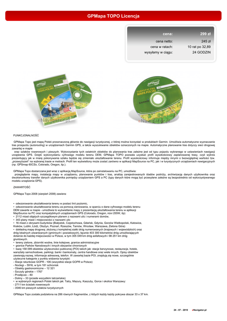 GPMapa TOPO Licencja cena: 299 zł cena netto: 245 zł cena w ratach: 10 rat po 32,89 wysyłamy w ciągu: 24 GODZIN FUNKCJONALNOŚĆ GPMapa Topo jest mapą Polski przeznaczoną głównie do nawigacji turystycznej, z której można korzystać w produktach Garmin. Umożliwia automatyczne wyznaczanie tras przejazdu (autorouting) w urządzeniach Garmin GPS, a także wyszukiwanie obiektów oznaczonych na mapie. Automatyczne planowanie tras dotyczy sieci drogowej zawartej w mapie oraz szlaków rowerowych i pieszych. Wykorzystanie tych ostatnich obiektów do planowania tras zależne jest od typu pojazdu wybranego w ustawieniach nawigacji urządzenia GPS. Dzięki wykorzystaniu cyfrowego modelu terenu DEM, GPMapa TOPO pozwala uzyskać profil wysokościowy zaplanowanej trasy, czyli wykres prezentujący jak w miarę pokonywania szlaku będzie się zmieniało ukształtowanie terenu. Profil wysokościowy informuje między innymi o bezwzględnej wartości tzw. „przewyższeń” na wybranej trasie w metrach. Profil ten wyświetlony może zostać zarówno w aplikacji MapSource na PC, jak i w turystycznych urządzeniach nawigacyjnych (np. GPSmap 60CSx, Colorado, Oregon, itp.). GPMapa Topo dostarczana jest wraz z aplikacją MapSource, która po zainstalowaniu na PC, umożliwia: przeglądanie mapy, instalację mapy w urządzeniu, planowanie punktów i tras, analizę zarejestrowanych śladów podróży, archiwizację danych użytkownika oraz dwukierunkowy transfer danych użytkownika pomiędzy urządzeniem GPS a PC (typy danych które mogą być przesyłane zależne są bezpośrednio od wykorzystywanego modelu urządzenia GPS). ZAWARTOŚĆ GPMapa Topo 2008 (sierpień 2008) zawiera: • odwzorowanie ukształtowania terenu w postaci linii poziomic, • odwzorowanie ukształtowania terenu za pomocą cieniowania, w oparciu o dane cyfrowego modelu terenu DEM zawarte w mapie - umożliwia to wyświetlanie mapy z prezentacją ukształtowania terenu w aplikacji MapSource na PC oraz kompatybilnych urządzeniach GPS (Colorado, Oregon, nüvi 255W, itp) • 2112 miast objętych szczegółowym planem z nazwami ulic i numerami domów, • 343 plany miast i miejscowości z nazwami ulic • 16 miast z obrysami budynków (Białystok, Częstochowa, Gdańsk, Gdynia, Gorzów Wielkopolski, Katowice, Kraków, Lublin, Łódź, Olsztyn, Poznań, Rzeszów, Tarnów, Wrocław, Warszawa, Zielona Góra) • dokładną mapę drogową: złożoną z kompletnej siatki dróg numerowanych (krajowych i wojewódzkich) oraz dróg lokalnych utwardzanych (gminnych i powiatowych), łącznie 403 300 kilometrów dróg umożliwiających dotarcie do każdej miejscowości w Polsce, w tym 305 049 km dróg asfaltowych i 98 251 km dróg gruntowych. • tereny zielone, zbiorniki wodne, linie kolejowe, granice administracyjne • granice Parków Narodowych i innych obszarów chronionych • bazę 158 099 obiektów użyteczności publicznej (POI) takich jak: stacje benzynowe, restauracje, hotele, warsztaty samochodowe, parkingi, banki i bankomaty, centra handlowe oraz wiele innych. Opisy obiektów zawierają nazwę, informacje adresową, telefon. W zawartej bazie POI, znajdują się nowe, szczególnie użyteczne kategorie z punktu widzenia turystyki: - Stacje ratunkowe GOPR - 106 (wszystkie stacje GOPR w Polsce) - Noclegi – 5916, w tym 181 schronisk - Obiekty gastronomiczne – 12 321 - Szczyty górskie – 1767 - Przełęcze – 80 - Doliny – 33 (przede wszystkim tatrzańskie) • w wybranych regionach Polski takich jak: Tatry, Mazury, Kaszuby, Gorce i okolice Warszawy: - 2711 km ścieżek rowerowych - 3546 km pieszych szlaków turystycznych GPMapa Topo została podzielona na 286 równych fragmentów, z któych każdy każdy pokrywa obszar 33 x 37 km. 24 - 07 - 2010 eNavigator.pl Objętość poszczególnych fragmentów mapy nie przekracza 4,5 MB, natomiast łączna objętość mapy w bieżącej wersji, to ok. 342 MB. Mapa może być instalowana w urządzeniu GPS (lub na karcie pamięci) w całości, lub wybranymi przez użytkownika fragmentami. DYSTRYBUCJA I REJESTRACJA GPMapa Topo dostępna jest w sprzedaży w pełnej wersji pudełkowej (BOX), lub w postaci elementu składowego pakietów z urządzeniami GPS (OEM). GPMapa Topo dostępna jest również w obniżonej cenie, dla aktualnych posiadaczy GPMapy w wersji drogowej (ADD). W przypadku produktu w wersji pudełkowej (BOX), klient zakupując GPMapę Topo otrzymuje opakowanie DVD, wewnątrz którego znajduje się płyta CD z wersją instalacyjną GPMapy Topo oraz jej numer licencji umożliwiający rejestrację i odblokowanie produktu dla posiadanego urządzenia GPS. Opakowanie GPMapy jest zabezpieczone plombą, której zerwanie jest równoznaczne z zaakceptowaniem treści licencji na użytkowanie GPMapy Topo, znajdującej się na tylnej stronie opakowania produktu. Rejestracji zakupionego produktu mapowego oraz jego odblokowania dla posiadanego urządzenia GPS dokonuje się poprzez serwis www.gpmapa.garmin.pl. Do pojednyczej licencji GPMapy Topo wydać można tylko jeden klucz odblokowujący, co oznacza iż mapa może pracować wyłącznie w jednym urządzeniu GPS, wybranym przez użytkownika w czasie rejestracji mapy. W przypadku produktu OEM, klient zakupując urządzenie wyposażone w GPMapę Topo, otrzymuje urządzenie z zainstalowaną mapą, a opakowanie produktu oznaczone jest okrągłą naklejką "Opakowanie zawiera GPMapa Topo". Wewnątrz opakowania produktu znajduje się również treść licencji oraz ultoka informacyjna. Numer licencji przysługujący do zakupionej w ten sposób GPMapy, nadawany jest po dokonaniu przez użytkownika rejestracji takiego produktu w serwisie www.gpmapa.garmin.pl. Otrzymany w ten sposób numer licencji jest automatycznie powiązany z urządzeniem GPS wraz z którym zakupiona została GPMapa Topo i nie ma możliwości odblokowania tej mapy dla kolejnego urządzenia Dla użytkowników, którzy aktualnie posiadają produkt GPMapa w wersji drogowej, oferujemy możli