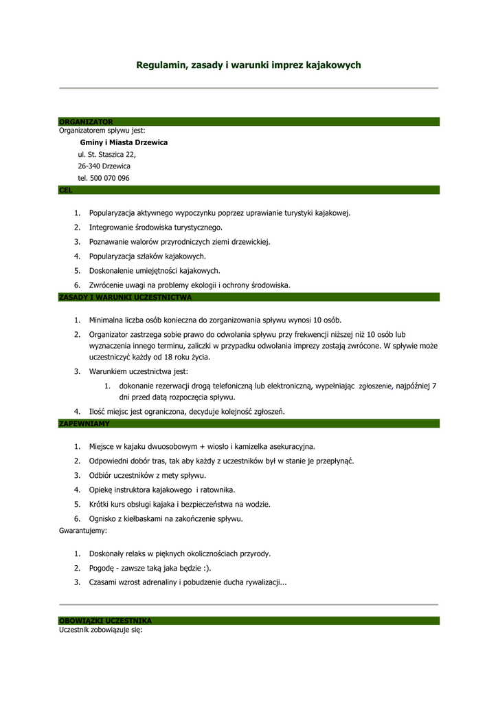 Regulamin, zasady i warunki imprez kajakowych ORGANIZATOR Organizatorem spływu jest: Gminy i Miasta Drzewica ul. St. Staszica 22, 26-340 Drzewica tel. 500 070 096 CEL 1. Popularyzacja aktywnego wypoczynku poprzez uprawianie turystyki kajakowej. 2. Integrowanie środowiska turystycznego. 3. Poznawanie walorów przyrodniczych ziemi drzewickiej. 4. Popularyzacja szlaków kajakowych. 5. Doskonalenie umiejętności kajakowych. 6. Zwrócenie uwagi na problemy ekologii i ochrony środowiska. ZASADY I WARUNKI UCZESTNICTWA 1. Minimalna liczba osób konieczna do zorganizowania spływu wynosi 10 osób. 2. Organizator zastrzega sobie prawo do odwołania spływu przy frekwencji niższej niż 10 osób lub wyznaczenia innego terminu, zaliczki w przypadku odwołania imprezy zostają zwrócone. W spływie może uczestniczyć każdy od 18 roku życia. 3. Warunkiem uczestnictwa jest: 1. dokonanie rezerwacji drogą telefoniczną lub elektroniczną, wypełniając zgłoszenie, najpóźniej 7 dni przed datą rozpoczęcia spływu. 4. Ilość miejsc jest ograniczona, decyduje kolejność zgłoszeń. ZAPEWNIAMY 1. Miejsce w kajaku dwuosobowym + wiosło i kamizelka asekuracyjna. 2. Odpowiedni dobór tras, tak aby każdy z uczestników był w stanie je przepłynąć. 3. Odbiór uczestników z mety spływu. 4. Opiekę instruktora kajakowego i ratownika. 5. Krótki kurs obsługi kajaka i bezpieczeństwa na wodzie. 6. Ognisko z kiełbaskami na zakończenie spływu. Gwarantujemy: 1. Doskonały relaks w pięknych okolicznościach przyrody. 2. Pogodę - zawsze taką jaka będzie :). 3. Czasami wzrost adrenaliny i pobudzenie ducha rywalizacji... OBOWIĄZKI UCZESTNIKA Uczestnik zobowiązuje się: 1. Zapoznać się z regulaminem spływu i zasadami bezpieczeństwa na spływie kajakowym. 2. Podporządkować się regulaminowi imprezy i poleceniom organizatora spływu. 3. Uczestnicy mają obowiązek bezwzględnego wykonywania poleceń instruktorów i ratowników, niezbędnych do przeprowadzenia spływu. 4. Na spływie obowiązuje zakaz spożywania alkoholu i innych środków odurzających. Jeżeli organizator spływu będzie miał wątpliwości co do stanu trzeźwości, uczestnik nie będzie dopuszczony do spływu w danym dniu. 5. Udzielać pomocy w razie potrzeby innym uczestnikom spływu na trasie spływu i obozowisku. 6. Nie zanieczyszczać trasy spływu i miejsc biwakowania. 7. Podczas płynięcia uczestnik ma obowiązek płynięcia w zapiętej kamizelce. 8. W stosunku do uczestników innych spływów oraz ludności miejscowej uczestnik jest zobowiązany do kulturalnego i niekonfliktowego zachowania. 9. Dbać o powierzony sprzęt turystyczny. 10. Uczestnik odpowiada za powierzony sprzęt i ponosi za niego odpowiedzialność finansową, w razie uszkodzenia pokrywa koszty naprawy lub zakupu nowego sprzętu. ZAPISY NA SPŁYW Zgłaszając uczestników na spływ kajakowy proszę dostarczyć dane uczestników wypełniając jeden z poniższych formularzy. Dane są niezbędne do ubezpieczenia uczestników. Dla Państwa wygody umieściliśmy formularz w dwóch popularnych plikach. Formularz należy pobrać, wypełnić i wysłać na nasz adres mailowy. pobierz - EXCEL UWAGA! Wszystkie dane osobowe uczestników służą tylko i wyłącznie identyfikacji uczestników imprezy, ubezpieczeniu uczestników . Dane osobowe nie będą udostępniane innym podmiotom. Wypełnienie formularza wiąże się z udzieleniem zgody na przetwarzanie danych osobowych przez Gminę i Miasto Drzewica. POSTANOWIENIA KOŃCOWE 1. Organizator ma prawo wyłączenia uczestnika ze spływu, który nie stosuje się do regulaminu i zasad bezpieczeństwa bez prawa zwrotu zapłaty. 2. W trakcie imprezy, na jednego instruktora może przypadać maksymalnie 20 uczestników 3. Każdy uczestnik bierze udział w spływie na własną odpowiedzialność. 4. Organizator nie bierze odpowiedzialności za mienie uczestników spływu. 5. Organizator nie bierze odpowiedzialności za szkody wyrządzone na mieniu i osobach trzecich. 6. Organizator imprezy, ze względów bezpieczeństwa uczestników, ma prawo odwołać poszczególne etapy spływu, zmienić je bądź skrócić ze względu na warunki pogodowe. 7. Ostateczna interpretacja postanowień regulaminu spływu należy do organizatora. 8. Nie stosowanie się do któregokolwiek punktu regulaminu może być powodem, do wykluczenia uczestnika ze spływu. 9. Regulamin opracowano w oparciu o regulamin kajakowych spływów turystycznych PZK.