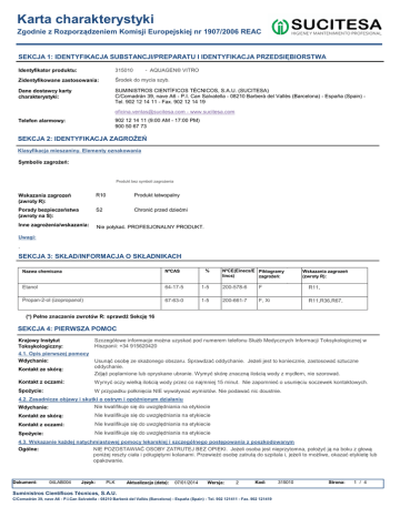 Karta charakterystyki Zgodnie z Rozporządzeniem Komisji Europejskiej nr 1907/2006 REAC SEKCJA 1: IDENTYFIKACJA SUBSTANCJI/PREPARATU I IDENTYFIKACJA PRZEDSIĘBIORSTWA - AQUAGEN® VITRO Identyfikator produktu: 315010 Zidentyfikowane zastosowania: Środek do mycia szyb. Dane dostawcy karty charakterystyki: SUMINISTROS CIENTÍFICOS TÉCNICOS, S.A.U. (SUCITESA) C/Comadrán 39, nave A6 - P.I. Can Salvatella - 08210 Barberà del Vallès (Barcelona) - España (Spain) Tel. 902 12 14 11 - Fax. 902 12 14 19 [email protected] - www.sucitesa.com 902 12 14 11 (9:00 AM - 17:00 PM) 900 50 67 73 Telefon alarmowy: SEKCJA 2: IDENTYFIKACJA ZAGROŻEŃ Klasyfikacja mieszaniny. Elementy oznakowania Symbol/e zagrożeń: Produkt bez symboli zagrożenia Wskazania zagrozeń (zwroty R): R10 Produkt łatwopalny Porady bezpieczeństwa (zwroty na S): S2 Chronić przed dziećmi Inne zagrożenia/wskazania: Nie połykać. PROFESJONALNY PRODUKT. Uwagi: . SEKCJA 3: SKŁAD/INFORMACJA O SKŁADNIKACH % NºCE(Einecs/E Piktogramy lincs) zagrożeń: Nazwa chemiczna NºCAS Etanol 64-17-5 1-5 200-578-6 F R11, Propan-2-ol (izopropanol) 67-63-0 1-5 200-661-7 F, Xi R11,R36,R67, Wskazania zagrozeń (zwroty R): (*) Pełne znaczenie zwrotów R: sprawdź Sekcję 16 SEKCJA 4: PIERWSZA POMOC Krajowy Instytut Toksykologiczny: 4.1. Opis pierwszej pomocy Wdychanie: Szczegółowe informacje można uzyskać pod numerem telefonu Służb Medycznych Informacji Toksykologicznej w Hiszpanii: +34 915620420 Kontakt ze skórą: Usunąć osobę ze skażonego obszaru. Sprawdzać oddychanie. Jeżeli jest to koniecznie, zastosować sztuczne oddychanie. Zdjąć poplamione lub opryskane ubranie. Wymyć skórę znaczną ilością wody z mydłem, nie szorować. Kontakt z oczami: Wymyć oczy wielką ilością wody przez co najmniej 15 minut. Nie zapomnieć o usunięciu soczewek kontaktowych. Spożycie: W przypadku połknięcia NIE wywoływać wymiotów. Nie podawać nic doustnie. 4.2. Zasadnicze objawy i skutki o ostrym i opóźnionym działaniu Nie kwalifikuje się do uwzględniania na etykiecie Wdychanie: Kontakt ze skórą: Nie kwalifikuje się do uwzględniania na etykiecie Kontakt z oczami: Nie kwalifikuje się do uwzględniania na etykiecie Spożycie: Nie kwalifikuje się do uwzględniania na etykiecie 4.3. Wskazanie każdej natychmiastowej pomocy lekarskiej i szczególnego postępowania z poszkodowanym NIE POZOSTAWIAĆ OSOBY ZATRUTEJ BEZ OPIEKI. Jeżeli osoba jest nieprzytomna, położyć ją na boku z głową Ogólne: poniżej reszty ciała i póługiętymi kolanami. Przewieźć osobę zatrutą do szpitala i, jeżeli to możliwe, okazać etykietę lub opakowanie. Dokument: 04LAB004 Język: PLK Aktualizacja (data): 07/01/2014 Wersja: 2 Kod: Suministros Científicos Técnicos, S.A.U. C/Comadrán 39, nave A6 - P.I.Can Salvatella - 08210 Barberà del Vallés (Barcelona) - España (Spain) - Tel. 902 121411 - Fax. 902 121419 315010 Strona: 1 / 4 Karta charakterystyki Zgodnie z Rozporządzeniem Komisji Europejskiej nr 1907/2006 REAC SEKCJA 5: POSTĘPOWANIE W PRZYPADKU POŻARU Dopuszczalne środki gaśnicze: Mgiełka wodna, piana, suche środki gaśnicze. Niedozwolone środki gaśnicze: W przypadku pożaru dozwolone są wszystkie środki gaśnicze. Szczególne zagrożenia pochodnymi substancji lub preparatu: Niepalny. W sytuacji pożaru może wydzielać toksyczne, korozyjne, podrażniające i duszące opary. Dwutlenek węgla (CO2), tlenek węgla (CO) itp. Specjalny sprzęt ochronny dla strażaków: Środki ochrony osobistej: Środki ochrony osobistej przed czynnikami chemicznymi (odzież ochronna, rękawice, ochrona oczu/twarzy itp. Korzystać z masek tlenowych. Polecenia dla strażaków: Natryskiwać pojemniki w celu ich schłodzenia. Niedopuszczać do przedostawania się środków przeciwpożarowych do studzienek ściekowych i cieków wodnych. Wodę wykorzystana do celów przeciwpożarowych należy zutylizować zgodnie z stosownymi przepisami. SEKCJA 6: POSTĘPOWANIE W PRZYPADKU NIEZAMIERZONEGO UWOLNIENIA DO ŚRODOWISKA Indywidualne środki ostrożności, sprzęt ochronny i procedury w nagłych wypadkach: Środki ostrożności w odniesieniu do środowiska naturalnego: Metody i materiały do powstrzymywania i oczyszczania: Stosować odpowiednie środki ochrony indywidualnej. Patrz SEKCJA 8. Nie pozwolić na przedostanie się środka do kanałów ściekowych ani wodociągów. Jeżeli to się jednak zdarzy, powiadomić właściwe władze zgodnie z obowiązującym lokalnym ustawodawstwem. Takie jak zapobieganie przedostaniu się do kanalizacji, wód powierzchniowych i gruntowych. Atrzymać i zebrać odpady przy użyciu środków wchłaniających (ziemia, piasek i inne mineralne środki wchłaniające) i umieścić w odpowiednim pojemniku w celu ich dalszej utylizacji zgodnie z obowiązującym prawem miejscowym. Patrz SEKCJA 13. SEKCJA 7: POSTĘPOWANIE Z SUBSTANCJĄ/PREPARTATEM I JEJ/JEGO MAGAZYNOWANIE Środki ostrożności dotyczące bezpiecznego postępowania: Nie spożywać pokarmów i napojów, nie palić w miejscu pracy. Warunki bezpiecznego magazynowania, łącznie z informacjami dotyczącymi wszelkich wzajemnych niezgodności: Magazynowanie zgodnie z miejscowymi przepisami. Magazynowanie zbiorników w temp. 5 do 35ºC w suchym miejscu o dobrej wentylacji, z dala od źródeł ciepła i bezpośredniego światła słonecznego. Zagwarantować właściwą rotację produktów. Najstarsze powinny zostać zużyte w pierwszej kolejności. Przestrzegać 30-miesięcznego okresu przechowywania produktów, stanowiącego termin ważności przyjęty w odniesieniu do normalnych warunków składowania. Szczególne zastosowania: Patrz SEKCJA 1 Wyłącznie dla specjalistycznego użytku. SEKCJA 8: KONTROLA NARAŻENIA I ŚRODKI OCHRONY INDYWIDUALNEJ Parametry kontroli Wartości graniczne narażenia Nazwa chemiczna VLA-ED (narażenie dzienne) Etanol Propan-2-ol (izopropanol) VLA-EC (narażenie krótkotrwałe) 1000 ppm-1910mg/m3 Nie ustalono 200 ppm-500 mg/m3 400 ppm-1000 mg/m3 