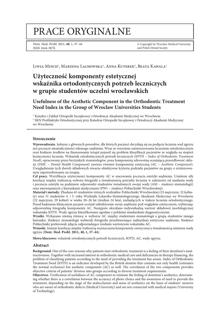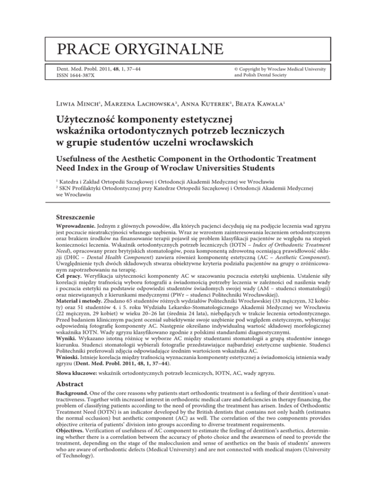 Prace oryginalne Dent. Med. Probl. 2011, 48, 1, 37–44 ISSN 1644-387X © Copyright by Wroclaw Medical University and Polish Dental Society Liwia Minch1, Marzena Lachowska2, Anna Kuterek2, Beata Kawala1 Użyteczność komponenty estetycznej wskaźnika ortodontycznych potrzeb leczniczych w grupie studentów uczelni wrocławskich Usefulness of the Aesthetic Component in the Orthodontic Treatment Need Index in the Group of Wroclaw Universities Students Katedra i Zakład Ortopedii Szczękowej i Ortodoncji Akademii Medycznej we Wrocławiu SKN Profilaktyki Ortodontycznej przy Katedrze Ortopedii Szczękowej i Ortodoncji Akademii Medycznej we Wrocławiu 1 2 Streszczenie Wprowadzenie. Jednym z głównych powodów, dla których pacjenci decydują się na podjęcie leczenia wad zgryzu jest poczucie nieatrakcyjności własnego uzębienia. Wraz ze wzrostem zainteresowania leczeniem ortodontycznym oraz brakiem środków na finansowanie terapii pojawił się problem klasyfikacji pacjentów ze względu na stopień konieczności leczenia. Wskaźnik ortodontycznych potrzeb leczniczych (IOTN – Index of Orthodontic Treatment Need), opracowany przez brytyjskich stomatologów, poza komponentą zdrowotną oceniającą prawidłowość okluzji (DHC – Dental Health Component) zawiera również komponentę estetyczną (AC – Aesthetic Component). Uwzględnienie tych dwóch składowych stwarza obiektywne kryteria podziału pacjentów na grupy o zróżnicowanym zapotrzebowaniu na terapię. Cel pracy. Weryfikacja użyteczności komponenty AC w szacowaniu poczucia estetyki uzębienia. Ustalenie siły korelacji między trafnością wyboru fotografii a świadomością potrzeby leczenia w zależności od nasilenia wady i poczucia estetyki na podstawie odpowiedzi studentów świadomych swojej wady (AM – studenci stomatologii) oraz niezwiązanych z kierunkami medycznymi (PWr – studenci Politechniki Wrocławskiej). Materiał i metody. Zbadano 65 studentów różnych wydziałów Politechniki Wrocławskiej (33 mężczyzn, 32 kobiety) oraz 51 studentów 4. i 5. roku Wydziału Lekarsko-Stomatologicznego Akademii Medycznej we Wrocławiu (22 mężczyzn, 29 kobiet) w wieku 20–26 lat (średnia 24 lata), niebędących w trakcie leczenia ortodontycznego. Przed badaniem klinicznym pacjent oceniał subiektywnie swoje uzębienie pod względem estetycznym, wybierając odpowiednią fotografię komponenty AC. Następnie określano indywidualną wartość składowej morfologicznej wskaźnika IOTN. Wady zgryzu klasyfikowano zgodnie z polskimi standardami diagnostycznymi. Wyniki. Wykazano istotną różnicę w wyborze AC między studentami stomatologii a grupą studentów innego kierunku. Studenci stomatologii wybierali fotografie przedstawiające najbardziej estetyczne uzębienie. Studenci Politechniki preferowali zdjęcia odpowiadające średnim wartościom wskaźnika AC. Wnioski. Istnieje korelacja między trafnością wyznaczania komponenty estetycznej a świadomością istnienia wady zgryzu (Dent. Med. Probl. 2011, 48, 1, 37–44). Słowa kluczowe: wskaźnik ortodontycznych potrzeb leczniczych, IOTN, AC, wady zgryzu. Abstract Background. One of the core reasons why patients start orthodontic treatment is a feeling of their dentition’s unattractiveness. Together with increased interest in orthodontic medical care and deficiencies in therapy financing, the problem of classifying patients according to the need of providing the treatment has arisen. Index of Orthodontic Treatment Need (IOTN) is an indicator developed by the British dentists that contains not only health (estimates the normal occlusion) but aesthetic component (AC) as well. The correlation of the two components provides objective criteria of patients’ division into groups according to diverse treatment requirements. Objectives. Verification of usefulness of AC component to estimate the feeling of dentition’s aesthetics, determining whether there is a correlation between the accuracy of photo choice and the awareness of need to provide the treatment, depending on the stage of the malocclusion and sense of aesthetics on the basis of students’ answers who are aware of orthodontic defects (Medical University) and are not connected with medical majors (University of Technology). 38 L. Minch et al. Material and Methods. The tested material included 65 students of various departments of the Wroclaw University of Technology (33 men, 32 women) and 51 students of the Faculty of Dentistry of Wroclaw Medical University (22 men, 29 women) aged from 20 to 26 (average 24 years) that were not undergoing orthodontic treatment at that time. Before the examination the patients assessed subjectively their dentition in terms of aesthetics – by choosing the value of AC component. Then the individual value of morphological IOTN component was quantified. Malocclusions were classified according to the polish diagnostic standards. Results. There was a significant difference in the choice of AC component between students of dentistry, and the group of students of other faculties. Dentistry students selected photographs of the most aesthetic dentitions. Students of University of Technology tended to choose pictures corresponding with average values of AC component. Conclusions. There is a correlation between the accuracy of determining the AC value andawareness of the malocclusion existence (Dent. Med. Probl. 2011, 48, 1, 37–44). Key words: Index of Orthodontic Treatment Need, IOTN, AC, malocclusion. Jednym z głównych powodów, dla których pacjenci decydują się na rozpoczęcie leczenia ortodontycznego jest poczucie braku atrakcyjności własnego uzębienia [1–4]. Ważne jest, aby przed podjęciem tego leczenia wziąć pod uwagę ten czynnik. Atrakcyjność jest pojęciem względnym, każdy z nas może inaczej ją postrzegać. Estetyka uzębienia może w różny sposób wpływać na życie pacjentów, co zależy od determinant środowiskowych [5, 6] i kulturowych [7, 8]. Wra