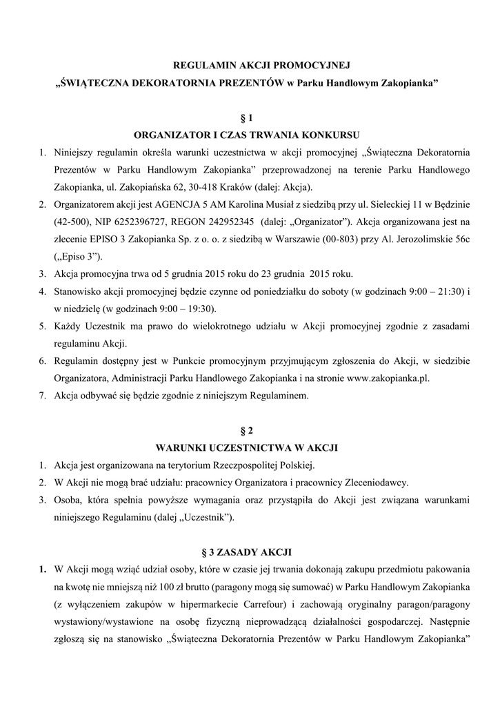 REGULAMIN AKCJI PROMOCYJNEJ „ŚWIĄTECZNA DEKORATORNIA PREZENTÓW w Parku Handlowym Zakopianka” §1 ORGANIZATOR I CZAS TRWANIA KONKURSU 1. Niniejszy regulamin określa warunki uczestnictwa w akcji promocyjnej „Świąteczna Dekoratornia Prezentów w Parku Handlowym Zakopianka” przeprowadzonej na terenie Parku Handlowego Zakopianka, ul. Zakopiańska 62, 30-418 Kraków (dalej: Akcja). 2. Organizatorem akcji jest AGENCJA 5 AM Karolina Musiał z siedzibą przy ul. Sieleckiej 11 w Będzinie (42-500), NIP 6252396727, REGON 242952345 (dalej: „Organizator”). Akcja organizowana jest na zlecenie EPISO 3 Zakopianka Sp. z o. o. z siedzibą w Warszawie (00-803) przy Al. Jerozolimskie 56c („Episo 3”). 3. Akcja promocyjna trwa od 5 grudnia 2015 roku do 23 grudnia 2015 roku. 4. Stanowisko akcji promocyjnej będzie czynne od poniedziałku do soboty (w godzinach 9:00 – 21:30) i w niedzielę (w godzinach 9:00 – 19:30). 5. Każdy Uczestnik ma prawo do wielokrotnego udziału w Akcji promocyjnej zgodnie z zasadami regulaminu Akcji. 6. Regulamin dostępny jest w Punkcie promocyjnym przyjmującym zgłoszenia do Akcji, w siedzibie Organizatora, Administracji Parku Handlowego Zakopianka i na stronie www.zakopianka.pl. 7. Akcja odbywać się będzie zgodnie z niniejszym Regulaminem. §2 WARUNKI UCZESTNICTWA W AKCJI 1. Akcja jest organizowana na terytorium Rzeczpospolitej Polskiej. 2. W Akcji nie mogą brać udziału: pracownicy Organizatora i pracownicy Zleceniodawcy. 3. Osoba, która spełnia powyższe wymagania oraz przystąpiła do Akcji jest związana warunkami niniejszego Regulaminu (dalej „Uczestnik”). § 3 ZASADY AKCJI 1. W Akcji mogą wziąć udział osoby, które w czasie jej trwania dokonają zakupu przedmiotu pakowania na kwotę nie mniejszą niż 100 zł brutto (paragony mogą się sumować) w Parku Handlowym Zakopianka (z wyłączeniem zakupów w hipermarkecie Carrefour) i zachowają oryginalny paragon/paragony wystawiony/wystawione na osobę fizyczną nieprowadzącą działalności gospodarczej. Następnie zgłoszą się na stanowisko „Świąteczna Dekoratornia Prezentów w Parku Handlowym Zakopianka” (dalej” Punkt promocyjny”) w celu ostemplowania paragonu/paragonów i zapakowania prezentu przez Obsługę. 2. Ostemplowany paragon lub paragony na łączną kwotę minimum 100 zł uprawniają do jednorazowego udziału w Akcji promocyjnej, a każdemu Klientowi jednorazowo przysługuje zapakowanie prezentu/prezentów. 3. W przypadku powzięcia przez Organizatora uzasadnionych wątpliwości co do autentyczności paragonu, przystąpienie do Akcji promocyjnej może zostać wstrzymane do momentu potwierdzenia oryginalności lub pochodzenia paragonu, nie dłużej jednak niż do 5. dnia od daty przedstawienia przez Uczestnika paragonu. 4. Akcja dotyczy zakupu wszelkich produktów lub usług, z wyłączeniem artykułów alkoholowych w rozumieniu ustawy z dnia 26 października 1982 r. o wychowaniu w trzeźwości i przeciwdziałaniu alkoholizmowi, wyrobów tytoniowych, produktów leczniczych. 5. W akcji promocyjnej nie biorą udziału produkty i paragony za zakupy dokonane w innych punktach handlowych, poza terenem Parku Handlowego Zakopianka w Krakowie czy też przedmioty stanowiące własność Klientów. 6. Uczestnik jest zobowiązany do obecności podczas pakowania prezentu w Punkcie promocyjnym. 7. Uczestnik ma prawo wskazać Obsłudze stanowiska preferowany papier do pakowania, wzór wstążki i dodatkowe elementy dekoracyjne. W innym przypadku Obsługa sama dokona wyboru materiałów do pakowania. 8. Na paragonie lub paragonach uprawniających do udziału w akcji, Obsługa odnotuje fakt wykorzystania paragonu do Akcji promocyjnej. 9. Organizator ma prawo do odmówienia zapakowania prezentów wielkogabarytowych lub nietypowych, takich jak np. telewizory, meble. Decyzja o możliwości pakowania danego produktu pozostaje do uznania Obsługi Punktu promocyjnego. 10. Obsługa ma prawo odmówić przyjęcia do zapakowania produktów noszących znamiona uszkodzenia. 11. Obsługa/Organizator nie odpowiada za szkody powstałe na zapakowanym produkcie oraz nie uwzględnia reklamacji po opuszczeniu przez Uczestnika Punktu promocyjnego 12. Stanowisko „Świąteczna Dekoratornia Prezentów w Parku Handlowym Zakopianka” obsługiwane jest przez osoby, wyznaczone przez Organizatora (dalej „Obsługa”). 13. Pakowanie prezentów jest usługą nieodpłatną. 14. Niedopuszczalne jest podejmowanie przez Uczestników działań sprzecznych z Regulaminem, obowiązującym prawem, sprzecznych z zasadami współżycia społecznego, uznanych powszechnie za naganne moralnie, obraźliwe, społecznie niewłaściwe lub godzące w dobra innych osób itp. W przypadku takich działań lub uzasadnionego podejrzenia możliwości wystąpienia takich działań – Organizator ma prawo wykluczyć Uczestnika z udziału z Akcji. § 4. POSTĘPOWANIE REKLAMACYJNE 1. Każdemu Uczestnikowi Akcji przysługuje prawo wniesienia pisemnej reklamacji dotyczącej sposobu przeprowadzenia Konkursu oraz jego rozstrzygnięcia nie później niż 14 dni od daty zakończenia Akcji (tj. od dnia 23.12.2014r.). Reklamacje wniesione po upływie powyższego terminu nie będą rozpatrywane. Za datę wniesienia reklamacji uważa się datę stempla pocztowego na przesyłce zawierającej reklamację. 2. Zgłoszenie reklamacyjne musi zawierać dokładne dane personalne zgłaszającego (imię, nazwisko, dokładny adres wraz z kodem pocztowym reklamującego) oraz przyczynę reklamacji, treść żądania reklamującego oraz opis okoliczności uzasadniających reklamację. 3. Reklamacje należy kierować pisemnie na adres Organizatora Konkursu: AGENCJA 5 AM Karolina Musiał z siedzibą ul. Krakowska 7/3, 41-400 Mysłowice, z dopiskiem na kopercie ZAKOPIANKA. 4. Osoba wnosząca reklamację zostanie powiadomiona o rozstrzygnięciu reklamacji za pomocą listu poleconego, najpóźniej w terminie 21 dni od daty otrzymania reklamacji przez Organizat