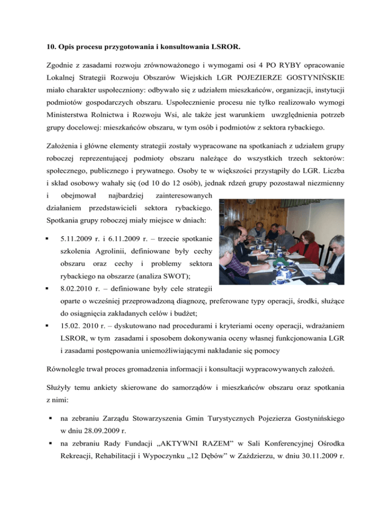 10. Opis procesu przygotowania i konsultowania LSROR. Zgodnie z zasadami rozwoju zrównoważonego i wymogami osi 4 PO RYBY opracowanie Lokalnej Strategii Rozwoju Obszarów Wiejskich LGR POJEZIERZE GOSTYNIŃSKIE miało charakter uspołeczniony: odbywało się z udziałem mieszkańców, organizacji, instytucji podmiotów gospodarczych obszaru. Uspołecznienie procesu nie tylko realizowało wymogi Ministerstwa Rolnictwa i Rozwoju Wsi, ale także jest warunkiem uwzględnienia potrzeb grupy docelowej: mieszkańców obszaru, w tym osób i podmiotów z sektora rybackiego. Założenia i główne elementy strategii zostały wypracowane na spotkaniach z udziałem grupy roboczej reprezentującej podmioty obszaru należące do wszystkich trzech sektorów: społecznego, publicznego i prywatnego. Osoby te w większości przystąpiły do LGR. Liczba i skład osobowy wahały się (od 10 do 12 osób), jednak rdzeń grupy pozostawał niezmienny i obejmował najbardziej działaniem przedstawicieli zainteresowanych sektora rybackiego. Spotkania grupy roboczej miały miejsce w dniach: 5.11.2009 r. i 6.11.2009 r. – trzecie spotkanie szkolenia Agrolinii, definiowane były cechy obszaru oraz cechy i problemy sektora rybackiego na obszarze (analiza SWOT); 8.02.2010 r. – definiowane były cele strategii oparte o wcześniej przeprowadzoną diagnozę, preferowane typy operacji, środki, służące do osiągnięcia zakładanych celów i budżet; 15.02. 2010 r. – dyskutowano nad procedurami i kryteriami oceny operacji, wdrażaniem LSROR, w tym zasadami i sposobem dokonywania oceny własnej funkcjonowania LGR i zasadami postępowania uniemożliwiającymi nakładanie się pomocy Równolegle trwał proces gromadzenia informacji i konsultacji wypracowywanych założeń. Służyły temu ankiety skierowane do samorządów i mieszkańców obszaru oraz spotkania z nimi: na zebraniu Zarządu Stowarzyszenia Gmin Turystycznych Pojezierza Gostynińskiego w dniu 28.09.2009 r. na zebraniu Rady Fundacji „AKTYWNI RAZEM” w Sali Konferencyjnej Ośrodka Rekreacji, Rehabilitacji i Wypoczynku „12 Dębów” w Zaździerzu, w dniu 30.11.2009 r. w Stowarzyszeniu Ekologiczno – Kulturalnym „ZIARNO” w Grzybowie w dniu 07.12.2009 r. w ‘Zielonej Szkole’ w Goreniu Dużym w dniu 08.12.2009 r. w ‘Zielonej Szkole’ w Sendeniu Małym w dniu 09.12.2009 r. Założenia LSROR były też na bieżąco zamieszczane na stronie www.pojezierzegostyninskie.pl oraz prezentowane (przy okazji podejmowania decyzji o przystąpieniu do LGR) na posiedzeniach Rad Gmin: − Rady Gminy Nowy Duninów - w dniu 20.11.2009 − Rady Gminy Kowal - w dniu 25.11.2009 − Rady Gminy Baruchowo - w dniu 21.12.2009 − Rady Gminy Łąck – w dniu 29.12.2009 − Rady Gminy Gostynin – w dniu 30.12.2009 − Rady Miasta Gostynina – w dniu 16 lutego 2010 − Rady Miasta Kowala – w dniu 26 lutego 2010 Uczestnicy ankiety byli proszeni o udzielenie odpowiedzi na następujące pytania: 1. Jaki jest główny atut dla rozwoju obszaru Pojezierza Gostynińskiego ? 2. Jakie są główne bariery ograniczające obecnie ten rozwój ? 3. Jakie konkretne działania mogą wesprzeć rozwój obszaru Pojezierza Gostynińskiego? 4. Jakie działania mogą wesprzeć rozwój sektora rybackiego na obszarze ? 5. Jakiego typu projekty, przyczyniające się do rozwoju obszaru, chciał(a)by zrealizować Pan(i) lub firma/instytucja/organizacja, w której Pan(i) pracuje/działa ? Uzyskane dzięki tym działaniom informacje i opinie stały się podstawą i rdzeniem treści LSROR LGR POJEZIERZE GOSTYNIŃSKIE. Uzupełniające informacje czerpano z dokumentów uprzednio dla obszaru, opracowanych takich jak Zintegrowana Strategia Rozwoju Obszarów Wiejskich LGD AKTYWNI RAZEM i Lokalna Strategia Rozwoju LGD AKTYWNI RAZEM, które także zostały opracowane z udziałem społeczności obszaru. W pracach grup roboczych, obok innych podmiotów, uczestniczyli następujący przedstawiciele sektora rybackiego obszaru: − Tadeusz Lubowiecki – Prezes Polskiego Związku Wędkarskiego, Okręg PłockoWłocławski, − Janusz Łojko – Dyrektor Biura Zarządu Polskiego Związku Wędkarskiego, Okręg Płocko-Włocławski, − Henryk Kierzkowski – właściciel stawów rybnych, − Mirosław Lewandowski – właściciel stawów rybnych, − Sławomir Sztygiel – Z-ca Dyrektora, Zespół Szkół im. Stanisława Staszica w Gąbinie, członek Koła PZW w Gąbinie, − Ryszard Wajnczak – przedstawiciel branży rybackiej, − Andrzej Lewandowski – właściciel stawów rybnych, − Leszek Podkański – prowadzący gospodarkę rybacką na jeziorze Łąckim Dużym (Nadleśnictwo Łąck) − Wiktor Kruczyński – właściciel stawów rybnych, − Wiesław Latus – prowadzący gospodarkę rybacką właściciel jeziora w gminie Kowal. Ich opinie i postulaty zostały uwzględnione w dokumencie strategii, czego potwierdzeniem było przyjęcie dokumentu na Walnym GOSTYNIŃSKIE w dniu 22 lutego 2010 roku. Zebraniu Członków LGR POJEZIERZE