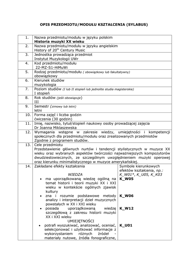 OPIS PRZEDMIOTU/MODUŁU KSZTAŁCENIA (SYLABUS) 1. 2. 3. 4. 5. 6. 7. 8. 9. 10. 11. 12. 13. 14. Nazwa przedmiotu/modułu w języku polskim Historia muzyki XX wieku Nazwa przedmiotu/modułu w języku angielskim History of 20th Century Music Jednostka prowadząca przedmiot Instytut Muzykologii UWr Kod przedmiotu/modułu 22-MZ-S1-HiMuWi Rodzaj przedmiotu/modułu ( obowiązkowy lub fakultatywny) obowiązkowy Kierunek studiów muzykologia Poziom studiów (I lub II stopień lub jednolite studia magisterskie) I stopień Rok studiów (jeśli obowiązuje) III Semestr (zimowy lub letni) letni Forma zajęć i liczba godzin ćwiczenia (30 godzin) Imię, nazwisko, tytuł/stopień naukowy osoby prowadzącej zajęcia Dr Joanna Miklaszewska Wymagania wstępne w zakresie wiedzy, umiejętności i kompetencji społecznych dla przedmiotu/modułu oraz zrealizowanych przedmiotów Zgodnie z programem studiów. Cele przedmiotu Przedstawienie głównych nurtów i tendencji stylistycznych w muzyce XX wieku oraz wybranych aspektów twórczości najważniejszych kompozytorów dwudziestowiecznych, ze szczególnym uwzględnieniem muzyki operowej oraz kierunku minimalistycznego w muzyce amerykańskiej. Zakładane efekty kształcenia Symbole kierunkowych efektów kształcenia, np.: WIEDZA K_W01*, K_U05, K_K03 ma uporządkowaną wiedzę ogólną na K_W05 temat historii i teorii muzyki XX i XXI wieku w kontekście ogólnych zjawisk kultury zna i rozumie podstawowe metody K_W06 analizy i interpretacji dzieł muzycznych powstałych w XX i XXI wieku posiada uporządkowaną wiedzę K_W12 szczegółową z zakresu historii muzyki XX i XXI wieku UMIEJĘTNOŚCI potrafi wyszukiwać, analizować, oceniać, K_U01 selekcjonować i użytkować informacje z wykorzystaniem różnych źródeł materiały nutowe, źródła fonograficzne, grafiki, materiały archiwalne posiada umiejętność charakteryzowania K_U07 stylów i gatunków w muzyce XX i XXI wieku; orientuje się w twórczości najważniejszych kompozytorów działających w XX i XXI wieku posiada umiejętność przygotowania K_U16 wystąpień ustnych i prezentacji wyników badań, dotyczących zagadnień z dziedziny historii i teorii muzyki XX i XXI wieku, z wykorzystaniem podstawowych ujęć teoretycznych, a także różnych źródeł KOMPETENCJE SPOŁECZNE ma świadomość poziomu swojej wiedzy i K_K01 umiejętności, rozumie potrzebę ciągłego zdobywania wiedzy, dokształcania się zawodowego i zdobywania umiejętności ma świadomość odpowiedzialności za K_K05 zachowanie europejskiego i polskiego dziedzictwa muzycznego, uczestniczy w życiu muzycznym i K_K06 różnych jego formach (koncerty muzyki współczesnej, przedstawienia operowe, spotkania z artystami, warsztaty muzyczne) 15. Treści programowe Tematyka zajęć obejmuje następujące zagadnienia: – – – – – – – – – – – – – Impresjonizm (C. Debussy, M. Ravel), symbolizm (C. Debussy). Ekspresjonizm w muzyce A. Skriabina i R. Straussa. Futuryzm (Francisco Balilla Pratella, Luigi Russolo). Folkloryzm (B. Bartók, Z. Kodály). Neoklasycyzm w twórczości kompozytorów francuskich (Grupa Sześciu), niemieckich (P. Hindemith), rosyjskich (S. Prokofiew), włoskich, amerykańskich i polskich. Przemiany stylistyczne w muzyce I. Strawińskiego. Dodekafonia – twórczość kompozytorów wiedeńskiej szkoły dodekafonicznej. Totalny serializm (L. Nono, P. Boulez, K. Stockhausen, G. Ligeti). System modalny O. Messiaena. Aleatoryzm w twórczości J. Cage’a, K. Stockhausena, aleatoryzm kontrolowany W. Lutosławskiego. Rozwój muzyki elektronicznej w XX w., od powstania pierwszych instrumentów elektronicznych po utwory muzyki konkretnej (P. Schaeffer, P. Henry) i współczesne dzieła z użyciem taśmy (m.in. M. Kagel, L. Berio, W. Kotoński). Sonoryzm w twórczości polskich kompozytorów, m.in. K. Pendereckiego, K. Serockiego, K. Moszumańskiej-Nazar, W. Szalonka. Amerykańscy prekursorzy muzyki eksperymentalnej (Ch. Ives, H. Cowell). Nurt muzyki eksperymentalnej (J. Cage, E. Brown, H. Skempton), grafika muzyczna (E. Brown, S. Bussotti, A. Logothetis), muzyka konceptualna; kompozycje oraz dzieła teoretyczne B. Schaeffera. – Koncepcja ekologii akustycznej R. Murraya Schafera. – Minimalizm w twórczości kompozytorów amerykańskich: L. M. Younga, T. Rileya, S. Reicha, Ph. Glassa, J. Adamsa, angielskich: M.. Nymana i J. Tavenera, rosyjskich (W. Artiomow), japońskich (T. Takemitsu), estońskich (A. Pärt) i polskich (T. Sikorski, Z. Krauze, tendencje minimalistyczne w muzyce H.M. Góreckiego i W. Kilara). – Nowy romantyzm w muzyce polskiej (Eugeniusz Knapik, Aleksander Lasoń, Andrzej Krzanowski) . 16. Zalecana literatura (podręczniki) Literatura podstawowa: – K. Baculewski Współczesność: cz. 1, 1939-1974, «Historia Muzyki Polskiej», tom 7, Warszawa 1996; – M. Gołąb Dodekafonia. Studia nad teorią i kompozycją I połowy XX w., Bydgoszcz 1987; – M. Gołąb Muzyczna moderna w XX wieku. Między kontynuacją, nowością a zmianą fonosystemu, Wrocław 2011; – Z. Helman Neoklasycyzm w muzyce polskiej XX wieku, Kraków 1985; – V. Jankélévitch Ravel, Paryż 1939, wyd. 2. 1956, tłum. pol. Kraków 1961; – A. Jarzębska Strawiński. Myśli i muzyka, Kraków 2002; – A. Jarzębska Idee relacji serialnych w muzyce XX wieku, Kraków 1995; – T. Kaczyński Messiaen, Kraków 1984; – W. Kotoński Muzyka elektroniczna, wyd. 2, Kraków 2002; – M. Nyman Muzyka eksperymentalna. Cage i po Cage’u, tłum. M. Mendyk, Gdańsk 2011; – J. Paja-Stach Lutosławski i jego styl muzyczny, Kraków 1997; – J. Paja-Stach Muzyka polska od Paderewskiego do Pendereckiego, Kraków 2009; – L. Polony Kilar. Żywioł i modlitwa, Kraków 2005; – A. Ross Reszta jest hałasem. Słuchając dwudziestego wieku, tłum. A. Laskowski, Warszawa 2011; – B. Schaeffer Muzyka XX wieku, Kraków 1975; – Z. Skowron Nowa muzyka amerykańska, Kraków 1995; – Thomas Górecki, Kraków 1998; – M. Tomaszewski 