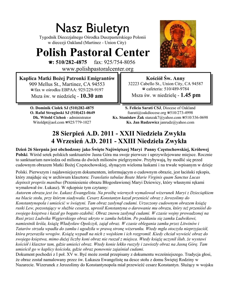 Nasz Biuletyn Tygodnik Diecezjalnego Ośrodka Duszpasterskiego Polonii w diecezji Oakland (Martinez - Union City) Polish Pastoral Center ?: 510/282-4875 fax: 925/754-8056 www.polishpastoralcenter.org Kaplica Matki Bożej Patronki Emigrantów 909 Mellus St., Martinez, CA 94553 ?/fax w ośrodku EBPAA: 925/229-9197 Msza św. w niedzielę - 10.30 am O. Dominik Ciołek SJ (510)282-4875 O. Rafał Struginski SJ (510)421-0649 Dk. Witold Cichoń - administrator [email protected] ?925/779-1027 Kościół Św. Anny 32223 Cabello St., Union City, CA 94587 ? cafeteria: 510/489-9784 Msza św. w niedzielę - 1.45 pm S. Felicia Sarati CSJ, Diocese of Oakland [email protected] ?510/273-4998 Ks. Stanisław Żak [email protected] ?510/336-0698 Ks. Jan Rudzewicz [email protected] 28 Sierpień A.D. 2011 - XXII Niedziela Zwykła 4 Wrzesień A.D. 2011 - XXIII Niedziela Zwykła Dzień 26 Sierpnia jest obchodzony jako Święto Najświętszej Maryi Panny Częstochowskiej, Królowej Polski. Wśród setek polskich sanktuariów Jasna Góra ma swoje pierwsze i uprzywilejowane miejsce. Rocznie to sanktuarium nawiedza od miliona do dwóch milionów pielgrzymów. Przybywają, by modlić się przed cudownym obrazem Matki Bożej Częstochowskiej, słynącym wieloma łaskami i na trwałe wpisanym w dzieje Polski. Pierwszym i najdawniejszym dokumentem, informującym o cudownym obrazie, jest łaciński rękopis, który znajduje się w archiwum klasztoru: Translatio tabulae Beate Marie Virginis quam Sanctus Lucas depinxit propriis manibus (Przeniesienie obrazu Błogosławionej Maryi Dziewicy, który własnymi rękami wymalował św. Łukasz). W rękopisie tym czytamy: Autorem obrazu jest św. Łukasz Ewangelista. Na prośbę wiernych wymalował wizerunek Maryi z Dzieciątkiem na blacie stołu, przy którym siadywała. Cesarz Konstantyn kazał przenieść obraz z Jerozolimy do Konstantynopola i umieścić w świątyni. Tam obraz zasłynął cudami. Urzeczony cudownym obrazem książę ruski Lew, pozostający w służbie cesarza, uprosił Konstantyna o darowanie mu obrazu, który też przeniósł do swojego księstwa i kazał go bogato ozdobić. Obraz znowu zasłynął cudami. W czasie wojny prowadzonej na Rusi przez Ludwika Węgierskiego obraz ukryto w zamku bełzkim. Po poddaniu się zamku Ludwikowi, namiestnik króla, książę Władysław Opolczyk, zajął obraz. W czasie oblegania zamku przez Litwinów i Tatarów strzała wpadła do zamku i ugodziła w prawą stronę wizerunku. Wtedy mgła otoczyła nieprzyjaciół, która przeraziła wrogów. Książę wypadł na nich z wojskiem i ich rozgromił. Kiedy chciał wywieść obraz do swojego księstwa, mimo dużej liczby koni obraz nie ruszał z miejsca. Wtedy książę uczynił ślub, że wystawi kościół i klasztor tam, gdzie umieści obraz. Wtedy konie lekko ruszyły i zawiozły obraz na Jasną Górę. Tam umieścił go w kaplicy kościoła, gdzie obraz ponownie zajaśniał cudami. Dokument pochodzi z I poł. XV w. Być może został przepisany z dokumentu wcześniejszego. Tradycja głosi, że obraz został namalowany przez św. Łukasza Ewangelistę na desce stołu z domu Świętej Rodziny w Nazarecie. Wizerunek z Jerozolimy do Konstantynopola miał przewieźć cesarz Konstantyn. Służący w wojsku cesarskim książę ruski Lew zapragnął przenieść obraz na Ruś. Cesarz podarował mu wizerunek i od tego czasu obraz otaczany był na Rusi wielką czcią. Obraz rzeczywiście mógł dostać się na Ruś z Konstantynopola, gdyż w XI-XIV w. pomiędzy Cesarstwem Bizantyjskim a Rusią trwał żywy kontakt. Nie jest również wykluczone, że obraz został zraniony strzałą w czasie bitwy. W czasie walk prowadzonych przez Kazimierza Wielkiego i Ludwika Węgierskiego na Rusi, obraz ukryto w zamku w Bełzie. W roku 1382 znalazł go tam książę Władysław Opolczyk. Doznając wielu łask przez wstawiennictwo Matki Bożej, książę zabrał obraz i przywiózł do Częstochowy. Na Jasnej Górze wielokrotnie modlili się polscy królowie i książęta, m.in. Kazimierz Jagiellończyk (1448 i 1472), św. Kazimierz królewicz (1472), Zygmunt I Stary (1510 i 1514), Stefan Batory (1581), Zygmunt III Waza (1616, 1620, 1630), Władysław IV (1621, 1633, 1638, 1642, 1644, 1646), Jan Kazimierz (1649, 1656, 1658, 1661), Michał Korybut Wiśniowiecki (1669, 1670), Jan III Sobieski (1676, 1683), August II Sas (1704), August III Sas (1734). W roku 1655 miała miejsce słynna obrona Jasnej Góry. 9 listopada 1655 r. hrabia Wejhard podszedł pod Jasną Górę w 3 tys. żołnierzy i zażądał bezwzględnej kapitulacji. Przeor klasztoru o. Augustyn Kordecki odmówił. Zaczęło się więc oblężenie. 19 listopada przybył generał Burhardt Miller oraz pułkownik Wacław Sadowski. Oblężenie trwało do Bożego Narodzenia, a więc ponad miesiąc. O. Kordecki miał do dyspozycji 160 żołnierzy i 70 zakonników. Obroną klasztoru dowodzili Stefan Zamojski i Piotr Czarnecki. Miller do rozbicia klasztoru i kościoła oraz otaczających murów użył najcięższych dział. Wyrzucono 340 armatnich kul o masie 6 kg, a nawet 12 kg. Naród zerwał się do walki. To zmusiło Millera do opuszczenia Jasnej Góry nocą 27 grudnia. Usiłował on jeszcze powrócić i z nagła zaskoczyć 24 i 28 lutego, a potem 9 kwietnia 1656 r., ale również bezskutecznie. Maryja, Najświętsza Panna Częstochowska była, jest i pozostanie naszą Matką i Królową na zawsze, ponieważ nasz Naród szczególnie umiłowała i Sama naszą Krolową sie ogłosiła. Rozważanie tekstu Ewangelii, który Kościół podaje na XXII Niedzielę Zwykłą. Jezus wielokrotnie w czasie swojej działalności próbował ludziom uświadomić, że w rzeczywistości ciało jest mniej ważne od duszy. Jest ono bowiem jedynie zewnętrzną częścią człowieka. Najważniejsze jest to – jak powtórzył Mały Książę za lisem – co niewidoczne dla oczu. Chrystus w dzisiejszej Ewangelii przestrzega nas przed dążeniem do celu za wszelką cen