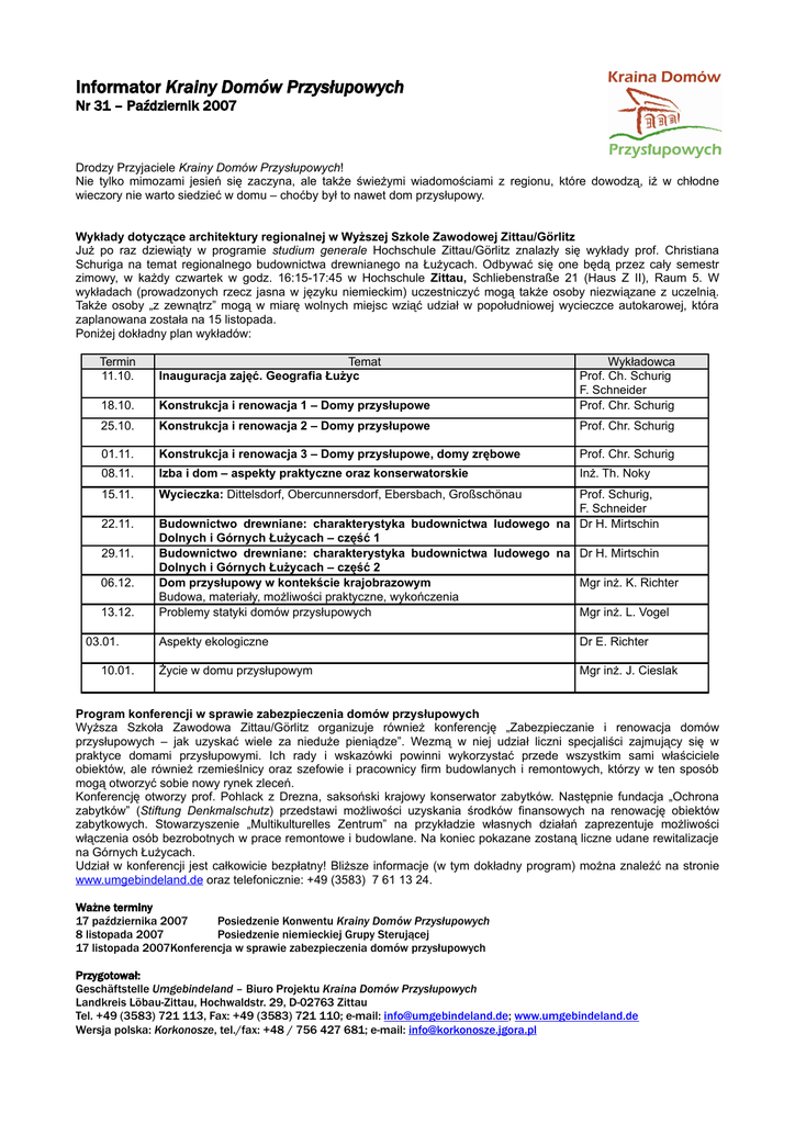 Informator Krainy Domów Przysłupowych Nr 31 – Październik 2007 Drodzy Przyjaciele Krainy Domów Przysłupowych! Nie tylko mimozami jesień się zaczyna, ale także świeżymi wiadomościami z regionu, które dowodzą, iż w chłodne wieczory nie warto siedzieć w domu – choćby był to nawet dom przysłupowy. Wykłady dotyczące architektury regionalnej w Wyższej Szkole Zawodowej Zittau/Görlitz Już po raz dziewiąty w programie studium generale Hochschule Zittau/Görlitz znalazły się wykłady prof. Christiana Schuriga na temat regionalnego budownictwa drewnianego na Łużycach. Odbywać się one będą przez cały semestr zimowy, w każdy czwartek w godz. 16:15-17:45 w Hochschule Zittau, Schliebenstraße 21 (Haus Z II), Raum 5. W wykładach (prowadzonych rzecz jasna w języku niemieckim) uczestniczyć mogą także osoby niezwiązane z uczelnią. Także osoby „z zewnątrz” mogą w miarę wolnych miejsc wziąć udział w popołudniowej wycieczce autokarowej, która zaplanowana została na 15 listopada. Poniżej dokładny plan wykładów: Termin 11.10. Temat Inauguracja zajęć. Geografia Łużyc 18.10. Konstrukcja i renowacja 1 – Domy przysłupowe Wykładowca Prof. Ch. Schurig F. Schneider Prof. Chr. Schurig 25.10. Konstrukcja i renowacja 2 – Domy przysłupowe Prof. Chr. Schurig 01.11. Konstrukcja i renowacja 3 – Domy przysłupowe, domy zrębowe Prof. Chr. Schurig 08.11. Izba i dom – aspekty praktyczne oraz konserwatorskie Inż. Th. Noky 15.11. Wycieczka: Dittelsdorf, Obercunnersdorf, Ebersbach, Großschönau 22.11. 29.11. 06.12. 13.12. 03.01. 10.01. Prof. Schurig, F. Schneider Budownictwo drewniane: charakterystyka budownictwa ludowego na Dr H. Mirtschin Dolnych i Górnych Łużycach – część 1 Budownictwo drewniane: charakterystyka budownictwa ludowego na Dr H. Mirtschin Dolnych i Górnych Łużycach – część 2 Dom przysłupowy w kontekście krajobrazowym Mgr inż. K. Richter Budowa, materiały, możliwości praktyczne, wykończenia Problemy statyki domów przysłupowych Mgr inż. L. Vogel Aspekty ekologiczne Dr E. Richter Życie w domu przysłupowym Mgr inż. J. Cieslak Program konferencji w sprawie zabezpieczenia domów przysłupowych Wyższa Szkoła Zawodowa Zittau/Görlitz organizuje również konferencję „Zabezpieczanie i renowacja domów przysłupowych – jak uzyskać wiele za nieduże pieniądze”. Wezmą w niej udział liczni specjaliści zajmujący się w praktyce domami przysłupowymi. Ich rady i wskazówki powinni wykorzystać przede wszystkim sami właściciele obiektów, ale również rzemieślnicy oraz szefowie i pracownicy firm budowlanych i remontowych, którzy w ten sposób mogą otworzyć sobie nowy rynek zleceń. Konferencję otworzy prof. Pohlack z Drezna, saksoński krajowy konserwator zabytków. Następnie fundacja „Ochrona zabytków” (Stiftung Denkmalschutz) przedstawi możliwości uzyskania środków finansowych na renowację obiektów zabytkowych. Stowarzyszenie „Multikulturelles Zentrum” na przykładzie własnych działań zaprezentuje możliwości włączenia osób bezrobotnych w prace remontowe i budowlane. Na koniec pokazane zostaną liczne udane rewitalizacje na Górnych Łużycach. Udział w konferencji jest całkowicie bezpłatny! Bliższe informacje (w tym dokładny program) można znaleźć na stronie www.umgebindeland.de oraz telefonicznie: +49 (3583) 7 61 13 24. Ważne terminy 17 października 2007 Posiedzenie Konwentu Krainy Domów Przysłupowych 8 listopada 2007 Posiedzenie niemieckiej Grupy Sterującej 17 listopada 2007Konferencja w sprawie zabezpieczenia domów przysłupowych Przygotował: Geschäftstelle Umgebindeland – Biuro Projektu Kraina Domów Przysłupowych Landkreis Löbau-Zittau, Hochwaldstr. 29, D-02763 Zittau Tel. +49 (3583) 721 113, Fax: +49 (3583) 721 110; e-mail: [email protected]; www.umgebindeland.de Wersja polska: Korkonosze, tel./fax: +48 / 756 427 681; e-mail: [email protected]