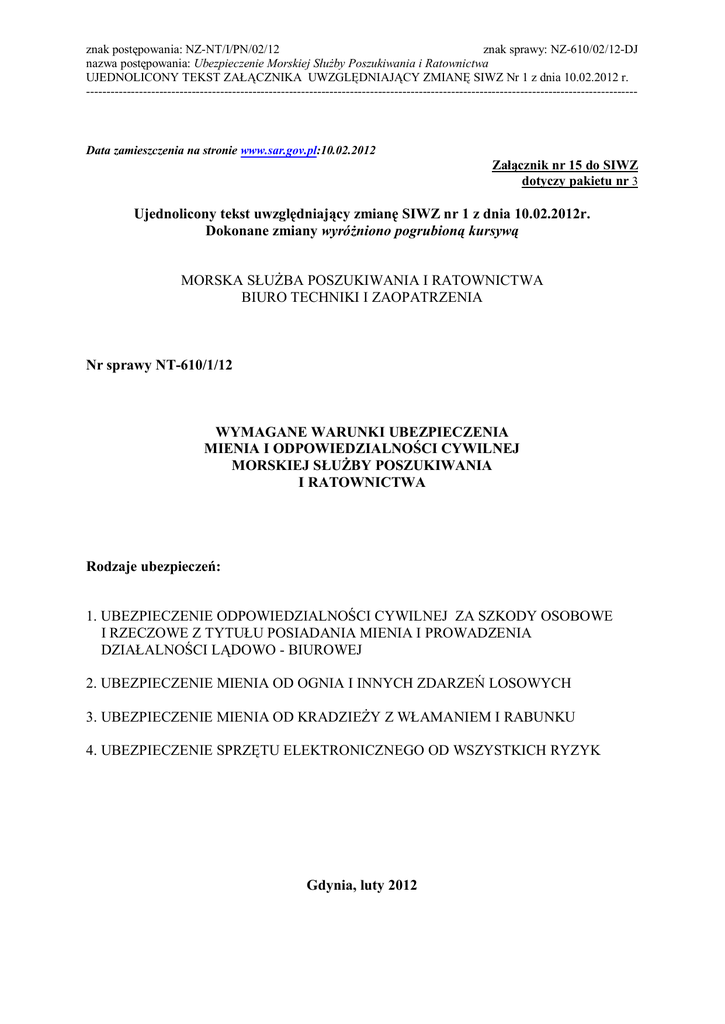 znak postępowania: NZ-NT/I/PN/02/12 znak sprawy: NZ-610/02/12-DJ nazwa postępowania: Ubezpieczenie Morskiej Służby Poszukiwania i Ratownictwa UJEDNOLICONY TEKST ZAŁĄCZNIKA UWZGLĘDNIAJĄCY ZMIANĘ SIWZ Nr 1 z dnia 10.02.2012 r. ---------------------------------------------------------------------------------------------------------------------------------------- Data zamieszczenia na stronie www.sar.gov.pl:10.02.2012 Załącznik nr 15 do SIWZ dotyczy pakietu nr 3 Ujednolicony tekst uwzględniający zmianę SIWZ nr 1 z dnia 10.02.2012r. Dokonane zmiany wyróżniono pogrubioną kursywą MORSKA SŁUŻBA POSZUKIWANIA I RATOWNICTWA BIURO TECHNIKI I ZAOPATRZENIA Nr sprawy NT-610/1/12 WYMAGANE WARUNKI UBEZPIECZENIA MIENIA I ODPOWIEDZIALNOŚCI CYWILNEJ MORSKIEJ SŁUŻBY POSZUKIWANIA I RATOWNICTWA Rodzaje ubezpieczeń: 1. UBEZPIECZENIE ODPOWIEDZIALNOŚCI CYWILNEJ ZA SZKODY OSOBOWE I RZECZOWE Z TYTUŁU POSIADANIA MIENIA I PROWADZENIA DZIAŁALNOŚCI LĄDOWO - BIUROWEJ 2. UBEZPIECZENIE MIENIA OD OGNIA I INNYCH ZDARZEŃ LOSOWYCH 3. UBEZPIECZENIE MIENIA OD KRADZIEŻY Z WŁAMANIEM I RABUNKU 4. UBEZPIECZENIE SPRZĘTU ELEKTRONICZNEGO OD WSZYSTKICH RYZYK Gdynia, luty 2012 znak postępowania: NZ-NT/I/PN/02/12 znak sprawy: NZ-610/02/12-DJ nazwa postępowania: Ubezpieczenie Morskiej Służby Poszukiwania i Ratownictwa UJEDNOLICONY TEKST ZAŁĄCZNIKA UWZGLĘDNIAJĄCY ZMIANĘ SIWZ Nr 1 z dnia 10.02.2012 r. ---------------------------------------------------------------------------------------------------------------------------------------- 1.0. POSTANOWIENIA OGÓLNE 1.1. UBEZPIECZONY I ZAKRES JEGO DZIAŁALNOŚCI Morska Służba Poszukiwania i Ratownictwa w Gdyni ul. Hryniewickiego 10 jest państwową jednostką organizacyjną przeznaczoną do wykonywania: 1) zadań poszukiwania i ratowania życia na morzu, 2) zadań w zakresie zwalczania zagrożeń i zanieczyszczeń na morzu 3) innych zadań związanych z bezpieczeństwem morskim. 1.2. OKRES UBEZPIECZENIA Umowa ubezpieczenia winna obejmować okres jednego roku tj.: od 22.03.2012 do 21.03.2013 2.0. UBEZPIECZENIE ODPOWIEDZIALNOŚCI CYWILNEJ ZA SZKODY OSOBOWE I RZECZOWE Z TYTUŁU POSIADANIA MIENIA ORAZ PROWADZENIA DZIAŁALNOŚCI LĄDOWO - BIUROWEJ 2.1. Ubezpieczenie winno dotyczyć: Odpowiedzialności cywilnej za szkody osobowe i rzeczowe wobec osób trzecich z tytułu posiadania mienia i prowadzenia działalności lądowo – biurowej z wyłączeniem ryzyk morskich (tj. związanych z posiadaniem i eksploatacją jednostek pływających oraz działalności MSPiR na morzu) objętych odrębnym ubezpieczeniem. 2.2 Miejsce ubezpieczenia: teren Rzeczypospolitej Polskiej 2.3 Suma ubezpieczenia: 500.000,00 PLN na jedno zdarzenie w okresie ubezpieczenia 1.000.000,00 PLN na wszystkie zdarzenia w okresie ubezpieczenia 2.4. Franszyza redukcyjna: zniesiona 2.5. Franszyza integralna: zniesiona 3.0. UBEZPIECZENIE MIENIA OD OGNIA I INNYCH ZDARZEŃ LOSOWYCH 3.1. Przedmiot ubezpieczenia: Przedmiotem umowy ubezpieczenia jest poniżej wymienione mienie będące w prawnym posiadaniu Zamawiającego: 1. Środki trwałe: a. Budynki i budowle – zgodnie z załącznikiem nr 2 b. Maszyny, urządzenia i wyposażenie (suma ubezpieczenia 600.000,00 PLN) 20% ubezpieczenie od kradzieży z włamaniem i rabunku znak postępowania: NZ-NT/I/PN/02/12 znak sprawy: NZ-610/02/12-DJ nazwa postępowania: Ubezpieczenie Morskiej Służby Poszukiwania i Ratownictwa UJEDNOLICONY TEKST ZAŁĄCZNIKA UWZGLĘDNIAJĄCY ZMIANĘ SIWZ Nr 1 z dnia 10.02.2012 r. ---------------------------------------------------------------------------------------------------------------------------------------- Wejście do budynków jest monitorowane, pod nadzorem służby operacyjnej lub straży portowej pracującej 24h na dobę. W budynku biurowym zainstalowana jest sygnalizacja przeciwpożarowa. 2. Środki obrotowe: - Magazyn Główny - Magazyn Sprzętu Nurkowego - Magazyn Sprzętu Ratowniczego - Magazyn Odzieży wartość środków 1.453.760,32 PLN wartość środków 66.206,74 PLN wartość środków 19.206,69 PLN wartość środków 766.011,50 PLN --------------------------------------------Razem: 2.305.185,25 PLN 3. Mienie pracownicze – zgodnie z załącznikiem nr 1 na kwotę 1.200,00 PLN od osoby 4. Gotówka – suma ubezpieczenia 100.000,00 PLN 3.2. Ubezpieczenie winno dotyczyć: Ochrony ubezpieczeniowej od wszelkiego rodzaju szkód poniesionych z przyczyn niezależnych od Zamawiającego, polegających na nagłej i nieprzewidzianej utracie, zniszczeniu lub uszkodzeniu przedmiotu ubezpieczenia, a w szczególności spowodowanych przez: pożar; uderzenie pioruna; wybuch; implozję; upadek statku powietrznego; powódź; huragan; deszcz nawalny; grad; działanie ciężaru śniegu i lodu; trzęsienie, zapadanie i osuwanie się ziemi; dym i sadzę; uderzenie pojazdu; huk ponaddźwiękowy; upadek drzew, budynków, budowli, urządzeń technicznych; zalanie; 3.3. Wartość ubezpieczonego mienia: Wartość ubezpieczonego mienia stanowi suma ubezpieczenia dla poszczególnego środka trwałego podanego w ewidencji środków trwałych, bez względu na wiek i stopień zużycia technicznego oraz amortyzację księgową. 3.4. Franszyza redukcyjna i integralna: nie wyższa niż 500,00 zł. 4.0. UBEZPIECZENIE MIENIA OD KRADZIEŻY Z WŁAMANIEM I RABUNKU 4.1.Przedmiot ubezpieczenia: 1. Wartości pieniężne od kradzieży z włamaniem i rabunku Suma ubezpieczenia – 100.000,00 PLN 2. Wartości pieniężne od rabunku w lokalu Suma ubezpieczenia – 50.000,00 PLN 3. Wartości pieniężne od rabunku w transporcie Suma ubezpieczenia – 50.000,00 PLN znak postępowania: NZ-NT/I/PN/02/12 znak sprawy: NZ-610/02/12-DJ nazwa postępowania: Ubezpieczenie Morskiej Służby Poszukiwania i Ratownictwa UJEDNOLICONY TEKST ZAŁĄCZNIKA UWZGLĘDNIAJĄCY ZMIANĘ SIWZ Nr 1 z dnia 10.02.2012 r. ---------------------------------------------------------------------------------------------------------------------------------------- 4.2.System ubezpieczenia