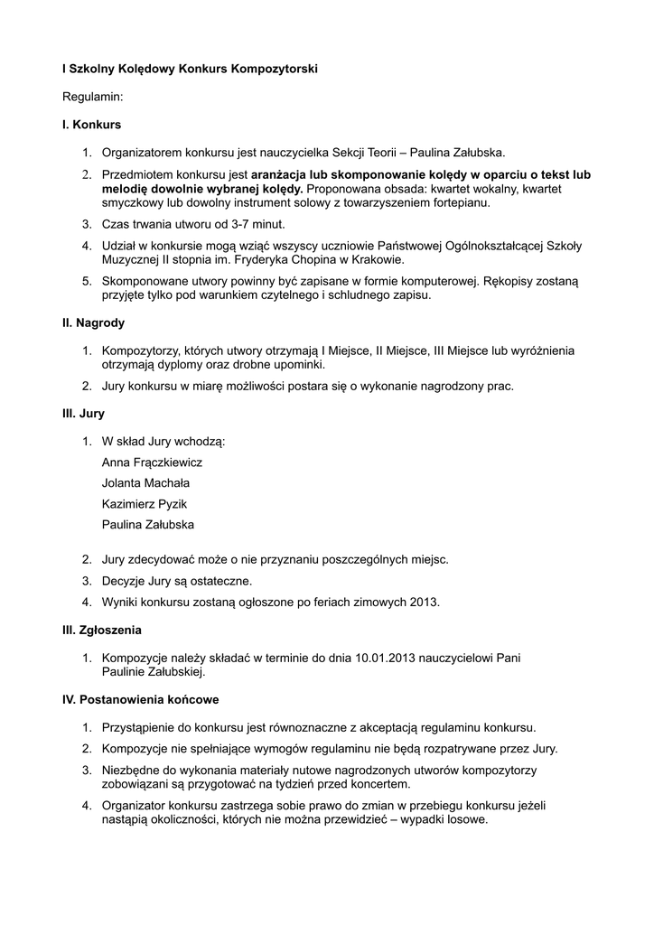 I Szkolny Kolędowy Konkurs Kompozytorski Regulamin: I. Konkurs 1. Organizatorem konkursu jest nauczycielka Sekcji Teorii – Paulina Załubska. 2. Przedmiotem konkursu jest aranżacja lub skomponowanie kolędy w oparciu o tekst lub melodię dowolnie wybranej kolędy. Proponowana obsada: kwartet wokalny, kwartet smyczkowy lub dowolny instrument solowy z towarzyszeniem fortepianu. 3. Czas trwania utworu od 3-7 minut. 4. Udział w konkursie mogą wziąć wszyscy uczniowie Państwowej Ogólnokształcącej Szkoły Muzycznej II stopnia im. Fryderyka Chopina w Krakowie. 5. Skomponowane utwory powinny być zapisane w formie komputerowej. Rękopisy zostaną przyjęte tylko pod warunkiem czytelnego i schludnego zapisu. II. Nagrody 1. Kompozytorzy, których utwory otrzymają I Miejsce, II Miejsce, III Miejsce lub wyróżnienia otrzymają dyplomy oraz drobne upominki. 2. Jury konkursu w miarę możliwości postara się o wykonanie nagrodzony prac. III. Jury 1. W skład Jury wchodzą: Anna Frączkiewicz Jolanta Machała Kazimierz Pyzik Paulina Załubska 2. Jury zdecydować może o nie przyznaniu poszczególnych miejsc. 3. Decyzje Jury są ostateczne. 4. Wyniki konkursu zostaną ogłoszone po feriach zimowych 2013. III. Zgłoszenia 1. Kompozycje należy składać w terminie do dnia 10.01.2013 nauczycielowi Pani Paulinie Załubskiej. IV. Postanowienia końcowe 1. Przystąpienie do konkursu jest równoznaczne z akceptacją regulaminu konkursu. 2. Kompozycje nie spełniające wymogów regulaminu nie będą rozpatrywane przez Jury. 3. Niezbędne do wykonania materiały nutowe nagrodzonych utworów kompozytorzy zobowiązani są przygotować na tydzień przed koncertem. 4. Organizator konkursu zastrzega sobie prawo do zmian w przebiegu konkursu jeżeli nastąpią okoliczności, których nie można przewidzieć – wypadki losowe.