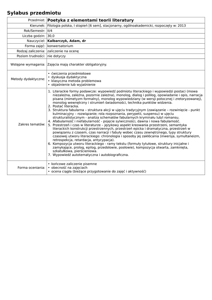 Sylabus przedmiotu Przedmiot: Poetyka z elementami teorii literatury Kierunek: Filologia polska, I stopień [6 sem], stacjonarny, ogólnoakademicki, rozpoczęty w: 2013 Rok/Semestr: II/4 Liczba godzin: 30,0 Nauczyciel: Kalbarczyk, Adam, dr Forma zajęć: konwersatorium Rodzaj zaliczenia: zaliczenie na ocenę Poziom trudności: nie dotyczy Wstępne wymagania: Zajęcia mają charakter obligatoryjny. • • Metody dydaktyczne: • • ćwiczenia przedmiotowe dyskusja dydaktyczna klasyczna metoda problemowa objaśnienie lub wyjaśnienie 1. Literackie formy podawcze: wypowiedź podmiotu literackiego i wypowiedzi postaci (mowa niezależna, zależna, pozornie zależna), monolog, dialog i polilog, opowiadanie i opis, narracja pisana (mimetyzm formalny), monolog wypowiedziany (w wersji potocznej i zretoryzowanej), monolog wewnętrzny i strumień świadomości, technika punktów widzenia. 2. Postać literacka. 3. Struktura fabularna – struktura akcji w ujęciu tradycyjnym (zawiązanie – rozwinięcie - punkt kulminacyjny – rozwiązanie; rola rozpoznania, perypetii, suspensu) w ujęciu strukturalistycznym - analiza schematów fabularnych kryminału lub/i romansu. 4. Afabularność i niefabularność - pojęcie sylwiczności, dawna i nowa fabularność. Zakres tematów: 5. Przestrzeń i czas w literaturze – językowy aspekt kreowania przestrzeni, semantyka literackich konstrukcji przestrzennych, przestrzeń epicka i dramatyczna, przestrzeń w powiązaniu z czasem, czas narracji i fabuły wobec czasu zewnętrznego, typy struktury czasowej utworu literackiego: chronologia i sposoby jej zakłócania (inwersja, symultaneizm, retrospekcja, retardacja, antycypacja). 6. Kompozycja utworu literackiego - ramy tekstu (formuły tytułowe, struktury inicjalne i zamykające, prolog, epilog, przedsłowie, posłowie), kompozycja otwarta, zamknięta, szkatułkowa, pierścieniowa. 7. Wypowiedź autotematyczna i autobiograficzna. • końcowe zaliczenie pisemne Forma oceniania: • obecność na zajęciach • ocena ciągła (bieżące przygotowanie do zajęć i aktywność) Podręczniki: 1. Chrząstowska Bożena, Wysłouch Seweryna,Poetyka stosowana, wyd. trzecie zmienione. 2. Kulawik Adam, Poetyka.Wstęp do teorii dzieła literackiego, wyd. dowolne. Literatura szczegółowa: 1. Bachórz Józef,Romans w powieści, czyli o wątkach miłosnych w powieściopisarstwie polskim okresu międzypowstaniowego 1831-1863,[w:]Romantyzm a romanse. Studia i szkice o prozie polskiej w pierwszej połowie XIX wieku, Gdańsk 2005. 2. Barthes Roland,Wstęp do analizy strukturalnej opowiadań, [w:]Studia z teorii literatury. Archiwum przekładów „Pamiętnika Literackiego”, t. I, Wrocław 1977. 3. Bartoszyński Kazimierz,Problem konstrukcji czasu w utworach epickich, [w:]Problemy teorii literatury, seria 2, Wrocław 1987. Literatura: 4. Błoński Jan,Dramat i przestrzeń,[w:]Problemy teorii dramatu i teatru, t. I, wybór i oprac. J. Degler, Wrocław 2003. 5. Czermińska Małgorzata,Obszar prozy niefikcjonalnejorazAutobiograficzny trójkąt: świadectwo, wyznanie i wyzwanie, [w:]Autobiograficzny trójkąt. Świadectwo, wyznanie i wyzwanie , Kraków 2000. 6. Głowiński Michał,Przestrzenne tematy i wariacje, [w:] tegoż,Prace wybrane, t. III, Kraków 1998. 7. Gosk Hanna, Wstęp [do:]Bohater swoich czasów. Postać literacka w powojennej prozie polskiej o tematyce współczesnej, Warszawa 2002. 8. Lasić Stanko,Schemat podstawowy kompozycji powieści kryminalnej, [w:]Poetyka powieści kryminalnej: próba analizy strukturalnej, przeł. M. Petryńska, Warszawa 1976. 9. Kasperski Edward,Między poetyką i antropologią postaci. Szkic zagadnień, [w:]Postaćliteracka. Teoria i historia, red. E. Kasperski, Warszawa 1998. 10. Woźniakiewicz-Dziadosz Maria,Dawna i nowa fabularność,[:]Obrzeża formy powieściowej, Lublin 1998. Lektury nadobowiązkowe: 1. Bachtin Michał,Formy czasu i czasoprzestrzeni w powieści, [w:] tegożProblemy literatury i estetyki, przeł. W. Grajewski, Warszawa 1982. 2. Głowiński Michał,Narracja jako monolog wypowiedziany, [w:] tegożGry powieściowe. Szkice z teorii i historii form narracyjnych, Warszawa 1973 lub [w:] tegoż:Narracje literackie i nieliterackie, Kraków 1997. 3. Humphrey Robert,Strumień świadomości – techniki,[w:]Studia z teorii literatury. Archiwum przekładów „Pamiętnika Literackiego”, t. I, Wrocław 1977. Dodatkowe informacje: 4. Lejeune Philippe,Pakt autobiograficzny, [w:]Wariacje na temat pewnego paktu. O autobiografii , przeł. A. Labuda, Kraków 2001 . 5. Lotman Jurij,Problem przestrzeni artystycznej,[w:]Studia z teorii literatury.Archiwum przekładów „Pamiętnika Literackiego”, t. I, Wrocław 1977. 6. Nycz Ryszard,Współczesne sylwy wobec literackości,[w:]Problemy teorii literatury, seria 3, 7. Sławiński Janusz,Analiza, interpretacja i wartościowanie dzieła literackiego, [w:]Próby teoretycznoliterackie, Warszawa 1992 lub [w:]Problemy metodologiczne współczesnego literaturoznawstwa, red. H. Markiewicz i J. Sławiński, Kraków 1976. 8. Sławiński Janusz,O opisie, [w:]Problemy teorii literatury, seria 3, dz. cyt. lub [w:] tegożPróby teoretycznoliterackie, Warszawa 1992 .