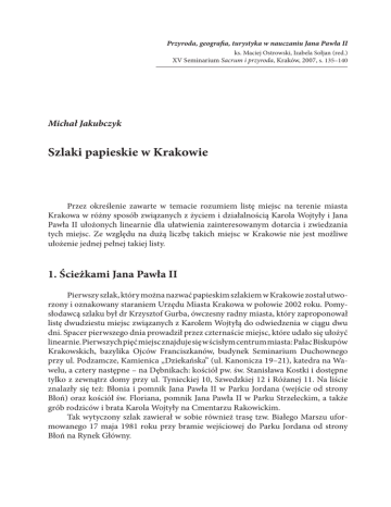 Przyroda, geografia, turystyka w nauczaniu Jana Pawła II ks. Maciej Ostrowski, Izabela Sołjan (red.) XV Seminarium Sacrum i przyroda, Kraków, 2007, s. 135–140 Michał Jakubczyk Szlaki papieskie w Krakowie Przez określenie zawarte w temacie rozumiem listę miejsc na terenie miasta Krakowa w różny sposób związanych z życiem i działalnością Karola Wojtyły i Jana Pawła II ułożonych linearnie dla ułatwienia zainteresowanym dotarcia i zwiedzania tych miejsc. Ze względu na dużą liczbę takich miejsc w Krakowie nie jest możliwe ułożenie jednej pełnej takiej listy. 1. Ścieżkami Jana Pawła II Pierwszy szlak, który można nazwać papieskim szlakiem w Krakowie został utworzony i oznakowany staraniem Urzędu Miasta Krakowa w połowie 2002 roku. Pomysłodawcą szlaku był dr Krzysztof Gurba, ówczesny radny miasta, który zaproponował listę dwudziestu miejsc związanych z Karolem Wojtyłą do odwiedzenia w ciągu dwu dni. Spacer pierwszego dnia prowadził przez czternaście miejsc, które udało się ułożyć linearnie. Pierwszych pięć miejsc znajduje się w ścisłym centrum miasta: Pałac Biskupów Krakowskich, bazylika Ojców Franciszkanów, budynek Seminarium Duchownego przy ul. Podzamcze, Kamienica „Dziekańska” (ul. Kanonicza 19–21), katedra na Wawelu, a cztery następne – na Dębnikach: kościół pw. św. Stanisława Kostki i dostępne tylko z zewnątrz domy przy ul. Tynieckiej 10, Szwedzkiej 12 i Różanej 11. Na liście znalazły się też: Błonia i pomnik Jana Pawła II w Parku Jordana (wejście od strony Błoń) oraz kościół św. Floriana, pomnik Jana Pawła II w Parku Strzeleckim, a także grób rodziców i brata Karola Wojtyły na Cmentarzu Rakowickim. Tak wytyczony szlak zawierał w sobie również trasę tzw. Białego Marszu uformowanego 17 maja 1981 roku przy bramie wejściowej do Parku Jordana od strony Błoń na Rynek Główny. Michał Jakubczyk Drugi dzień szlaku przewidywał odwiedzenie sześciu miejsc usytuowanych w różnych miejscach Krakowa, stosunkowo w dużej odległości od siebie: Szpital im. Jana Pawła II przy ul. Prądnickiej, kościoły – Arka Pana w Bieńczycach i św. Maksymiliana w Mistrzejowicach, kamieniołom na Zakrzówku i dawne zakłady sodowe Solvay oraz sanktuarium Bożego Miłosierdzia w Łagiewnikach. Szlak otrzymał nazwę Ścieżkami Jana Pawła II. Jako pracownikowi pionu promocji turystycznej w Urzędzie Miasta Krakowa przypadła mi realizacja oznakowania tych miejsc w terenie oraz wydanie folderu zawierającego opis trasy. Zasadniczym problemem było znalezienie stosownej formy oznakowania miejsc położonych na szlaku. Takiego oznakowania, które zostałoby zaakceptowane przez władze kościelne, konserwatorskie (dotyczy zabytków) oraz innych właścicieli lub administratorów miejsc na trasie. Pierwszą propozycją były tablice nawiązujące do kształtu gotyckich okien zawierające m.in. opisy poszczególnych miejsc. Propozycja ta jednak nie znalazła uznania ówczesnego metropolity krakowskiego, kard. Franciszka Macharskiego, który zasugerował dalsze poszukiwania zmierzające do ograniczenia rozmiarów i uproszczenia formy tablic. Kamieniem milowym w tych poszukiwaniach okazała się propozycja ks. Jana Zająca, ówczesnego dyrektora Wydziału Duszpasterstwa krakowskiej kurii metropolitalnej, z którym – zdesperowany – konsultowałem różne propozycje oznakowania. Ksiądz, obecnie biskup Jan zaproponował wykorzystanie papieskiego Krzyża Pielgrzyma, który cały świat kojarzy z Janem Pawłem II. Ostatecznie autorka projektu tablic, pani Urszula Pabian, opracowała zaakceptowaną przez kard. Macharskiego formę tablicy w postaci trójkąta równoramiennego o boku 32 cm ze stali nierdzewnej zawierajacego wpisany weń Krzyż Pielgrzyma, a także nazwę trasy, danego miejsca i jedno zdanie o nim. Następnie udało się pozyskać potrzebne zgody i charakterystyczne trójkątne tablice zostały umieszczone na wszystkich wymienionych wyżej obiektach. Wielkie zasługi dla realizacji tego przedsięwzięcia miał ks. prof. Maciej Ostrowski, duszpasterz środowisk turystycznych w Krakowie, patron i konsultant wszelkich poczynań wokół realizacji szlaku Ścieżkami Jana Pawła II. Ze względu na zmianę terminu przyjazdu Ojca Świętego z czerwca na sierpień 2002 roku otrzymaliśmy dodatkowy czas na równoległe przygotowanie i oznaczenie jeszcze innego szlaku nazwanego Krakowskim Szlakiem Świętych. Prowadzi on po grobach krakowskich świętych, błogosławionych i kandydatów na ołtarze znajdujących się w szesnastu kościołach miasta. Krakowski Szlak Świętych spotyka się ze Ścieżkami Jana Pawła II w czterech bazylikach: ojców franciszkanów, katedralnej, św. Floriana i w bazylice Miłosierdzia Bożego w Łagiewnikach. Jednak pozostałe świątynie z grobami świętych: bazyliki – Ojców Paulinów na Skałce, Mariacka, Księży Jezuitów i Ojców Dominikanów, czy kościoły pw. św. Marka, św. Anny, Sióstr Sercanek przy ul. Smoleńsk, św. Katarzyny Aleksandryjskiej, Bożego Ciała, Ecce Homo Sióstr Albertynek też mogłyby znaleźć się na szaku papieskim. 136 Szlaki papieskie w Krakowie Oba wspomniane wyżej szlaki zostały uroczyście otwarte przez metropolitę krakowskiego kard., F. Macharskiego i prezydenta miasta Krakowa, A. Gołasia, w przeddzień ostatniej wizyty Ojca Świętego Jana Pawła II w Krakowie. Przygotowaniu szlaków towarzyszyły foldery z ich opisami. W pierwszej wersji folder z opisem Ścieżek Jana Pawła II ukazał się w formacie 1/3 A4 w nakładzie 10 tys. egz. jedynie w języku polskim. Wiosną roku 2003 roku szlak został rozbudowany o kolejne 6 oznakowanych miejsc (klasztor na Skałce, Collegium Novum UJ, bazylika mariacka, kościół pw. św. Jadwigi Królowej na Krowodrzy, Port Lotniczy im. Jana Pawła II w Balicach oraz dom przy ul. Felicjanek 10, w którym mieszkała rodzina Kydryńskich. Ten ostatni nie został jednak uwzględniony w rozszer