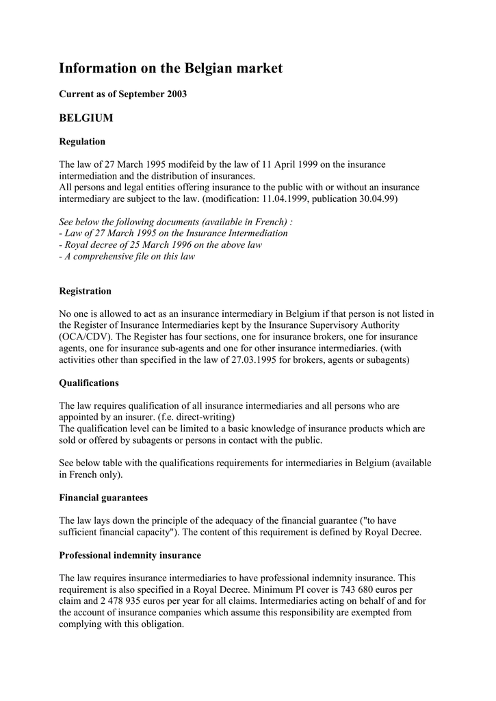 - Law of 27 March 1995 on the Insurance Intermediation