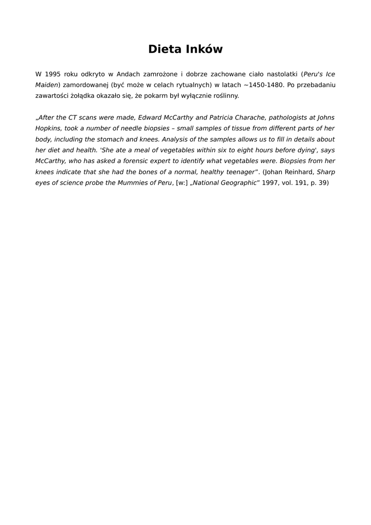Dieta Inków W 1995 roku odkryto w Andach zamrożone i dobrze zachowane ciało nastolatki (Peru's Ice Maiden) zamordowanej (być może w celach rytualnych) w latach ~1450-1480. Po przebadaniu zawartości żołądka okazało się, że pokarm był wyłącznie roślinny. „After the CT scans were made, Edward McCarthy and Patricia Charache, pathologists at Johns Hopkins, took a number of needle biopsies – small samples of tissue from different parts of her body, including the stomach and knees. Analysis of the samples allows us to fill in details about her diet and health. 'She ate a meal of vegetables within six to eight hours before dying', says McCarthy, who has asked a forensic expert to identify what vegetables were. Biopsies from her knees indicate that she had the bones of a normal, healthy teenager”. (Johan Reinhard, Sharp eyes of science probe the Mummies of Peru, [w:] „National Geographic” 1997, vol. 191, p. 39)
