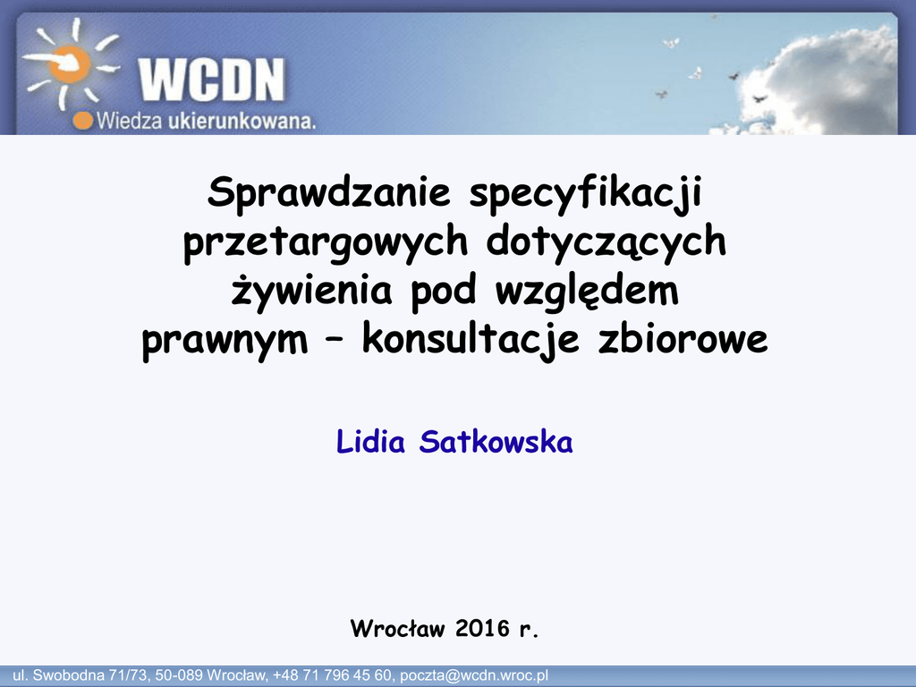 Sprawdzanie specyfikacji przetargowych dotyczących żywienia pod względem prawnym – konsultacje zbiorowe Lidia Satkowska Wrocław 2016 r. ul. Swobodna 71/73, 50-089 Wrocław, +48 71 796 45 60, [email protected] Akty prawne Rozporządzenie Ministra Zdrowia (1) z dnia 26 lipca 2016 r. w sprawie grup środków spożywczych przeznaczonych do sprzedaży dzieciom i młodzieży w jednostkach systemu oświaty oraz wymagań, jakie muszą spełniać środki spożywcze stosowane w ramach żywienia zbiorowego dzieci i młodzieży w tych jednostkach. • Na podstawie art. 52c ust. 6 ustawy z dnia 25 sierpnia 2006 r. o bezpieczeństwie żywności i żywienia (Dz. U. z 2015 r. poz. 594 i 1893 oraz z 2016 r. poz. 65) zarządza się, co następuje: ul. Swobodna 71/73, 50-089 Wrocław, +48 71 796 45 60, [email protected] § 1. 1. Określa się grupy środków spożywczych przeznaczonych do sprzedaży dzieciom i młodzieży w jednostkach systemu oświaty: 1) pieczywo, z wyłączeniem pieczywa produkowanego z ciasta głęboko mrożonego; 2) pieczywo półcukiernicze i cukiernicze, z wyłączeniem pieczywa produkowanego z ciasta głęboko mrożonego; 3) kanapki; 4) sałatki i surówki; 5) mleko; 6) napoje zastępujące mleko, takie jak napój: sojowy, ryżowy, owsiany, kukurydziany, gryczany, orzechowy, jaglany, kokosowy lub migdałowy; 7) produkty mleczne, takie jak: jogurt, kefir, maślanka, mleko zsiadłe, mleko acidofilne, mleko smakowe, serwatka, ser twarogowy, serek homogenizowany lub produkty zastępujące produkty mleczne na bazie soi, ryżu, owsa, orzechów lub migdałów; 8) zbożowe produkty śniadaniowe oraz inne produkty zbożowe; 9) warzywa; 10) owoce; ul. Swobodna 71/73, 50-089 Wrocław, +48 71 796 45 60, [email protected] 11) suszone warzywa i owoce, orzechy oraz nasiona bez dodatku cukrów, substancji słodzących zdefiniowanych w rozporządzeniu Parlamentu Europejskiego i Rady (WE) nr 1333/2008 z dnia 16 grudnia 2008 r. w sprawie dodatków do żywności (Dz. Urz. UE L 354 z 31.12.2008, str. 16, z późn. zm.), zwanym dalej "rozporządzeniem (WE) nr 1333/2008", oraz bez dodatku soli; 12) soki owocowe, warzywne, owocowo-warzywne; 13) przeciery, musy owocowe, warzywne oraz owocowo-warzywne bez dodatku cukrów i soli; 14) koktajle owocowe, warzywne oraz owocowo-warzywne na bazie mleka, napojów zastępujących mleko, o których mowa w pkt 6, produktów mlecznych lub produktów zastępujących produkty mleczne, o których mowa w pkt 7, bez dodatku cukrów i substancji słodzących, o których mowa w rozporządzeniu (WE) nr 1333/2008; 15) naturalna woda mineralna nisko- lub średniozmineralizowana, woda źródlana i woda stołowa; 16) napoje przygotowywane na miejscu, które nie mogą zawierać więcej niż 10 g cukrów w 250 ml produktu gotowego do spożycia; 17) napoje bez dodatku cukrów i substancji słodzących zdefiniowanych w rozporządzeniu (WE) nr 1333/2008; 18) bezcukrowe gumy do żucia; 19) czekolada gorzka o zawartości minimum 70% miazgi kakaowej; 20) inne. ul. Swobodna 71/73, 50-089 Wrocław, +48 71 796 45 60, [email protected] 2. W jednostkach systemu oświaty mogą być sprzedawane dzieciom i młodzieży grupy środków spożywczych, o których mowa w ust. 1 pkt 2, 6-8 i pkt 20, pod warunkiem że nie zawierają więcej niż: 1) 15 g cukru w 100 g/ml produktu gotowego do spożycia, a w przypadku produktów mlecznych, o których mowa w ust. 1 pkt 7, nie więcej niż 13,5 g cukru w 100 g/ml produktu gotowego do spożycia; 2) 10 g tłuszczu w 100 g/ml produktu gotowego do spożycia; 3) 0,4 g sodu/ 1 g soli w 100 g/ml produktu gotowego do spożycia, a w przypadku pieczywa półcukierniczego i cukierniczego nie więcej niż 0,45 g sodu/ 1,2 g soli w 100 g/ml produktu gotowego do spożycia. ul. Swobodna 71/73, 50-089 Wrocław, +48 71 796 45 60, [email protected] § 2. 1. Środki spożywcze stosowane w ramach żywienia zbiorowego dzieci i młodzieży w jednostkach systemu oświaty muszą spełniać odpowiednie wymagania dla danej grupy wiekowej, wynikające z aktualnych norm żywienia dla populacji polskiej. 2. Środki spożywcze, o których mowa w ust. 1, dobiera się w taki sposób, aby: 1) na całodzienne żywienie składały się środki spożywcze pochodzące z różnych grup środków spożywczych; 2) posiłki (śniadanie, obiad, kolacja) zawierały produkty z następujących grup środków spożywczych: produkty zbożowe lub ziemniaki, warzywa lub owoce, mleko lub produkty mleczne, mięso, ryby, jaja, orzechy, nasiona roślin strączkowych i inne nasiona oraz tłuszcze; 3) zupy, sosy oraz potrawy sporządzane były z naturalnych składników, bez użycia koncentratów spożywczych, z wyłączeniem koncentratów z naturalnych składników; 4) od poniedziałku do piątku były podawane nie więcej niż dwie porcje potrawy smażonej, przy czym do smażenia jest używany olej roślinny rafinowany o zawartości kwasów jednonienasyconych powyżej 50% i zawartości kwasów wielonienasyconych poniżej 40%; 5) napoje przygotowywane na miejscu zawierały nie więcej niż 10 g cukrów w 250 ml produktu gotowego do spożycia; 6) każdego dnia były podawane: a) co najmniej dwie porcje mleka lub produktów mlecznych, b) co najmniej jedna porcja z grupy mięso, jaja, orzechy, nasiona roślin strączkowych, c) warzywa lub owoce w każdym posiłku, d) co najmniej jedna porcja produktów zbożowych w śniadaniu, obiedzie oraz kolacji; 7) w żywieniu całodziennym było podawane przynajmniej pięć porcji warzyw lub owoców; 8) najmniej raz50-089 w tygodniu była porcja ryby. ul. co Swobodna 71/73, Wrocław, +48podawana 71 796 45 60, [email protected] § 3. Do dnia 31 grudnia 2016 r. w ramach żywienia zbiorowego dzieci i młodzieży w jednostkach systemu oświaty mogą być stosowane grupy środków spożywczych oraz wymagania, jakie muszą spełniać środki spożywcze określone w przepisach, o których mowa w § 4. § 4. Traci moc rozporządzenie Ministra Zdrowia z dnia 26 sierpnia 2015 r. 